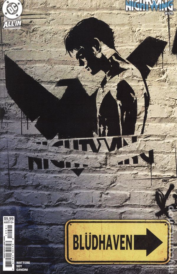 Written by Dan Watters. Art by Dexter Soy. Cover by Dexter Soy. NIGHTWING TAKES HIS CITY TO THE BRINK! After tragedy strikes, Nightwing seeks to hold the gangs of Bludhaven accountable. But alliances in this city may not be what they seem, and powered-up Spheric police officers hover overhead seeking to dispense their own brand of justice... 28 pages, full color. Rated T+ Cover price $4.99.
