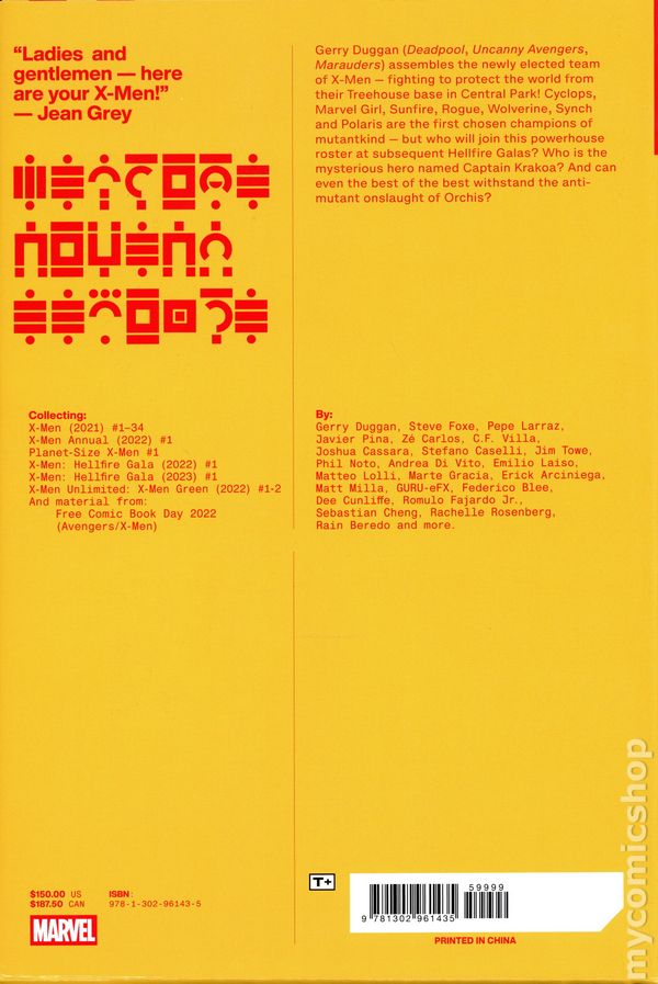 1st printing. Collects X-Men (2021-2024 Marvel) #1-34, X-Men (2021-2024 Marvel) Annual #1, Planet-Size X-Men (2021 Marvel, X-Men: Hellfire Gala (2022 Marvel), X-Men: Hellfire Gala (2023 Marvel), and X-Men Unlimited: X-Men Green (2022 Marvel) #1-2. Written by Gerry Duggan and Steve Foxe. Art by Pepe Larraz, Javier Pina, Ze Carlos, C.F. Villa, Joshua Cassara, Stefano Caselli, Jim Towe, Phil Noto, Andrea Di Vito, Emilio Laiso, Matteo Lolli, Kris Anka, Russell Dauterman, Adam Kubert, and Luciano Vecchio. Cover by Pepe Larraz. The all-star heroes of Krakoa are here to save the planet! Things might be complicated between the new mutant nation and the rest of the world, but it's simple to the X-Men: You do what's right, you protect those who need protecting and you save the world we all share. Cyclops, Marvel Girl, Sunfire, Rogue, Wolverine, Synch and Polaris are the chosen champions of mutantkind, and they will not shrink from any battle. From the obsessed High Evolutionary to the bizarre Cordyceps Jones, from Orchis' Dr. Stasis to the horrifying Headless Horseman, the X-Men will face them head-on! But who is the new mutant hero Captain Krakoa? And who will be elected to the A team in the Hellfire Galas? The X-Men clash with the Eternals, the Children of the Vault, M.O.D.O.K. and more - while things get cosmic as the X-Men go planet-size! But when Orchis strikes, who will be left to halt the Fall of X? Hardcover, 8 1/2-in. x 11-in., 1,304 pages, full color. Rated T+ Cover price $150.00.