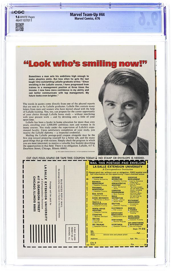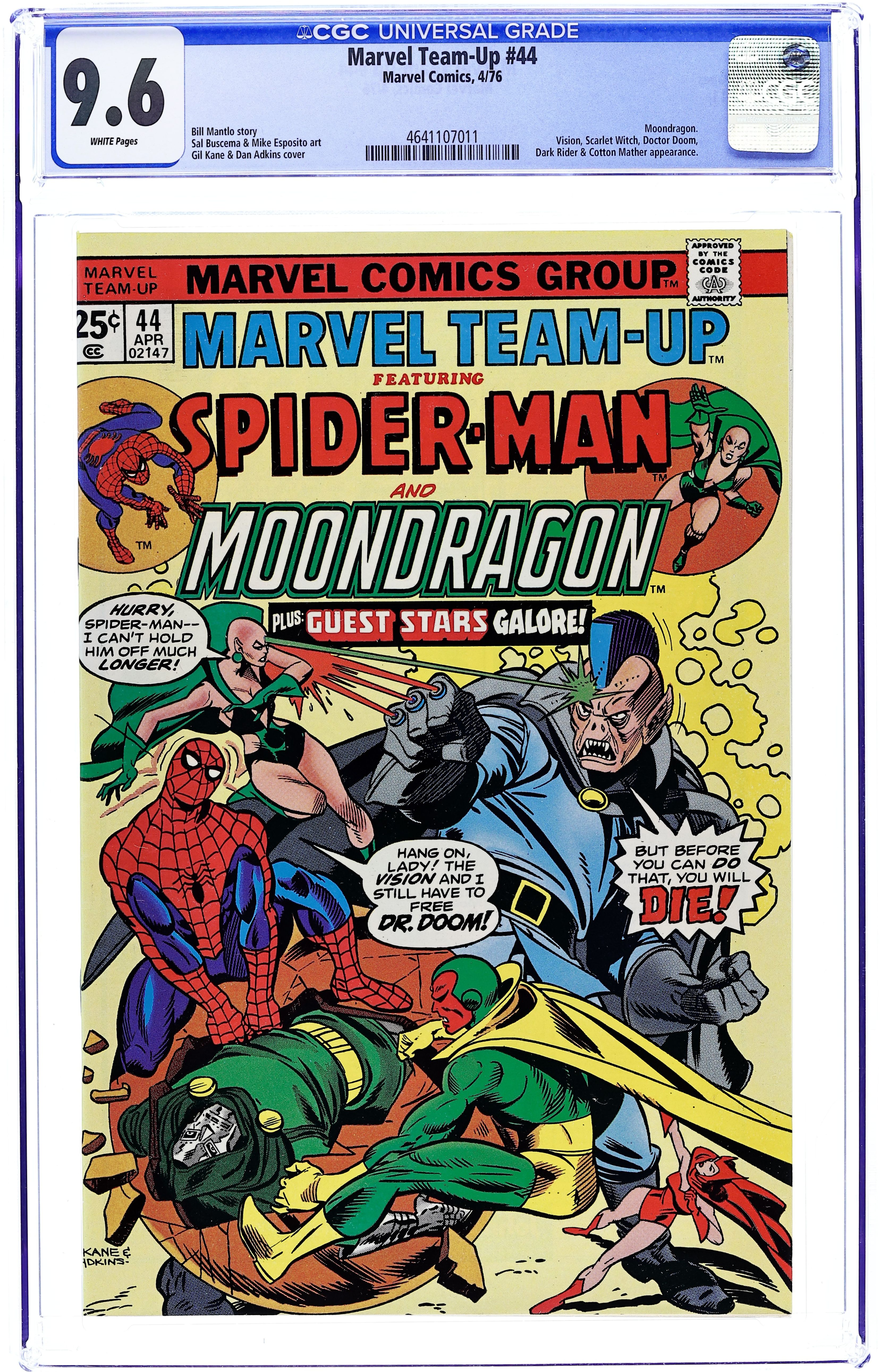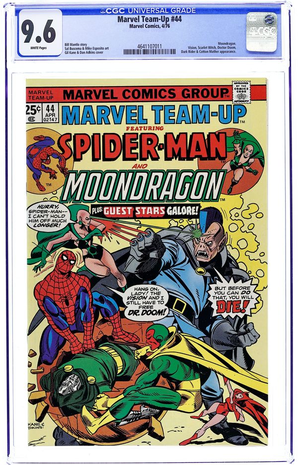 "Death in the Year Before Yesterday!" Part 4 of 4. Guest-starring Spider-Man, Moondragon, Doctor Doom, the Vision, and the Scarlet Witch. Script by Bill Mantlo. Art by Sal Buscema (breakdowns), Mike Esposito (finishes), and Dave Hunt (finishes). Cover by Gil Kane and Dan Adkins. It's the Dark Rider's last stand against Doctor Doom, the Vision, the Scarlet Witch, Moondragon and the web-slinger in 17th century Salem! And will the wall-crawler be able to save John Proctor from the gallows? It's a bittersweet ending for your friendly neighborhood Spider-Man. Cameo appearance by Iron Man. (Note: The letters page also contains Marvel Value Stamp Series B #68 Silver Surfer. A 30-cent cover price variant exists for this issue.) 36 pages. Cover price $0.25.
