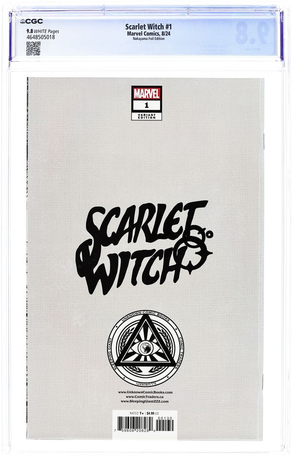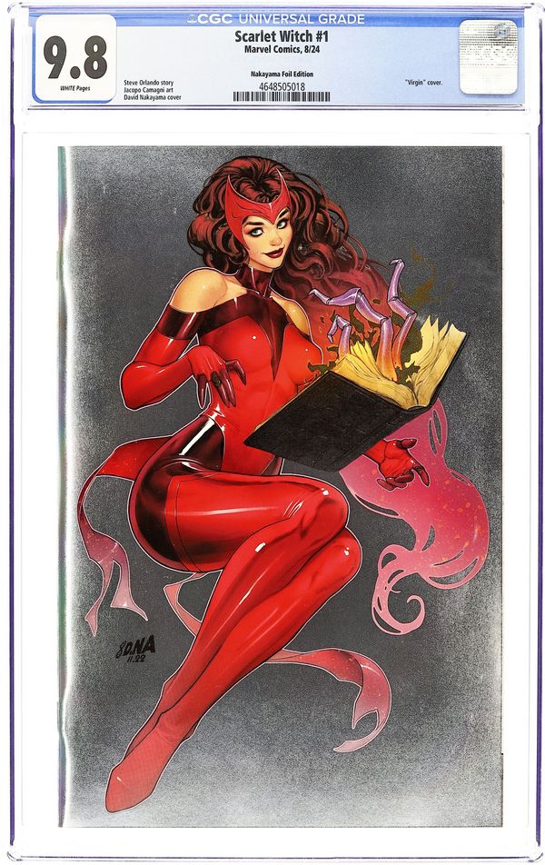 Comics Illuminati (Unknown Comic Books, Comic Traders, and Sleeping Giant) Exclusive Foil Edition Virgin Cover by David Nakayama. Written by Steve Orlando. Art by Jacopo Camagni. STEVE ORLANDO'S SCARLET WITCH RUN REIGNITES! The Scarlet Witch has carved out a haven for herself in upstate New York, but it's all about to go up in flames. Wanda's newfound peace has drawn the wrath of a primal force unlike anything she's ever faced before, and it won't stop until it razes Wanda's world to the ground. It's a clash of titans as Wanda and her allies fight for all she holds dear! What happens when an unstoppable force meets the end of all things? When pure chaos meets pure destruction? Wanda's about to find out - if she survives long enough. Jacopo Camagni (X-MEN: RED, Nomen Omen) joins writer Steve Orlando for an explosive new chapter of Scarlet Witch's story! 40 pages, full color. Rated T+ Cover price $4.99.