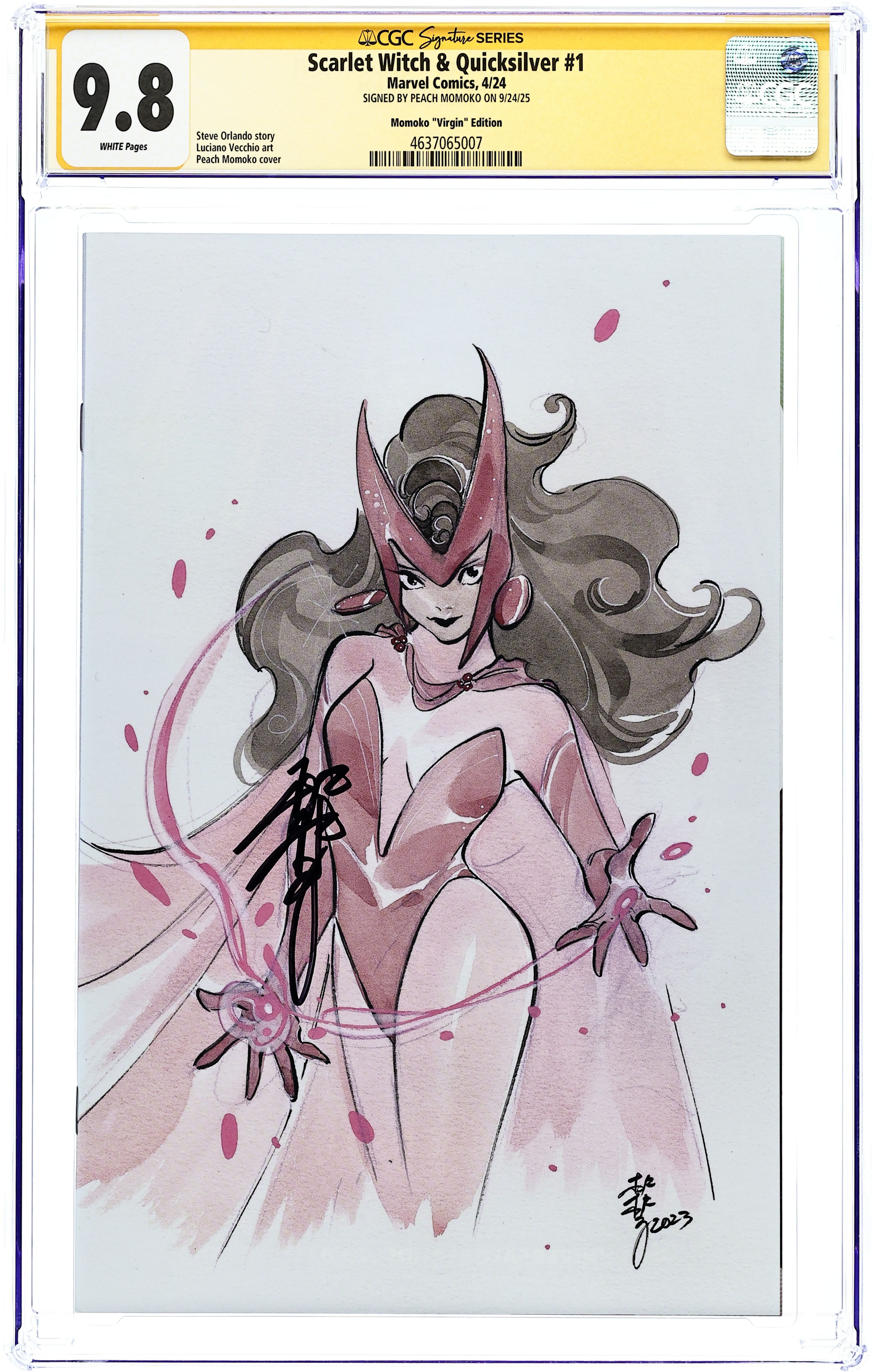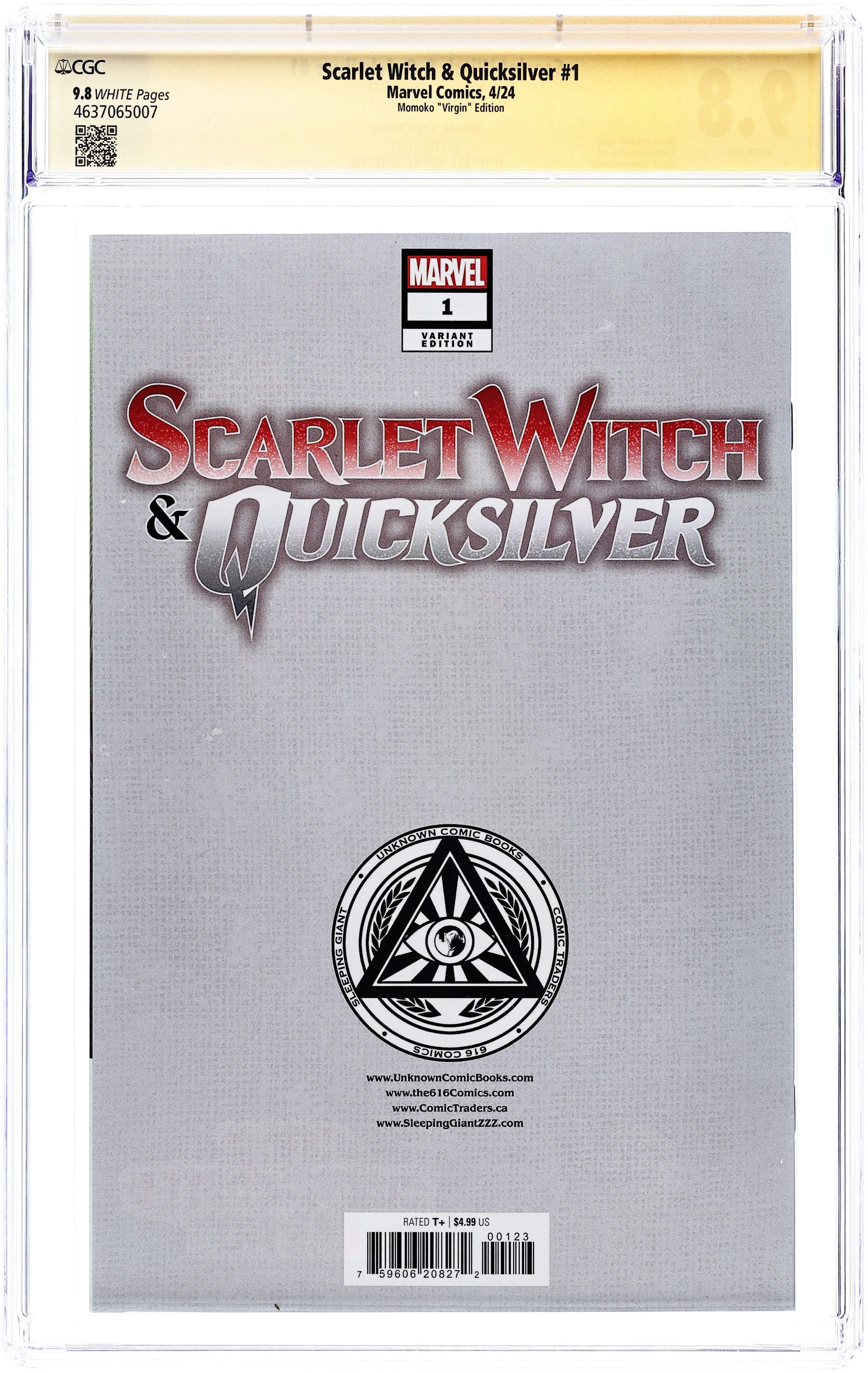 Comics Illuminati (Unknown Comics, The 616 Comics, Comic Traders, and Sleeping Giant) Exclusive Virgin Cover by Peach Momoko. Written by Steve Orlando. Art by Lorenzo Tammetta. Old Rivalries and New Mysteries! The Scarlet Witch and Quicksilver have been heroes, friends, family heads and occasionally villains, but, above all, they are twins who look out for each other. So when Wanda receives a letter from the recently deceased Magneto that would upset Pietro, she burns the letter before her brother can read it. But her choice drives them apart at the worst possible time: a new threat heralded by the Wizard - with a horrifying eldritch upgrade - is coming for their heads, and if they can't find a way to repair their damaged bond, it will cost them their lives. Join the fan-favorite SCARLET WITCH creative team as they celebrate sixty years of Scarlet Witch and Quicksilver with this new chapter in the twins' storied legacy! 40 pages, full color. Rated T+