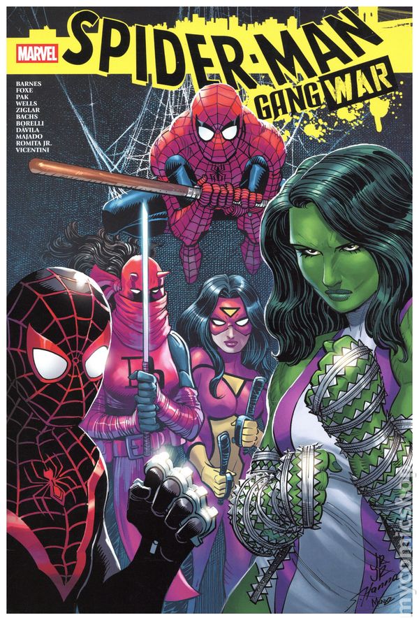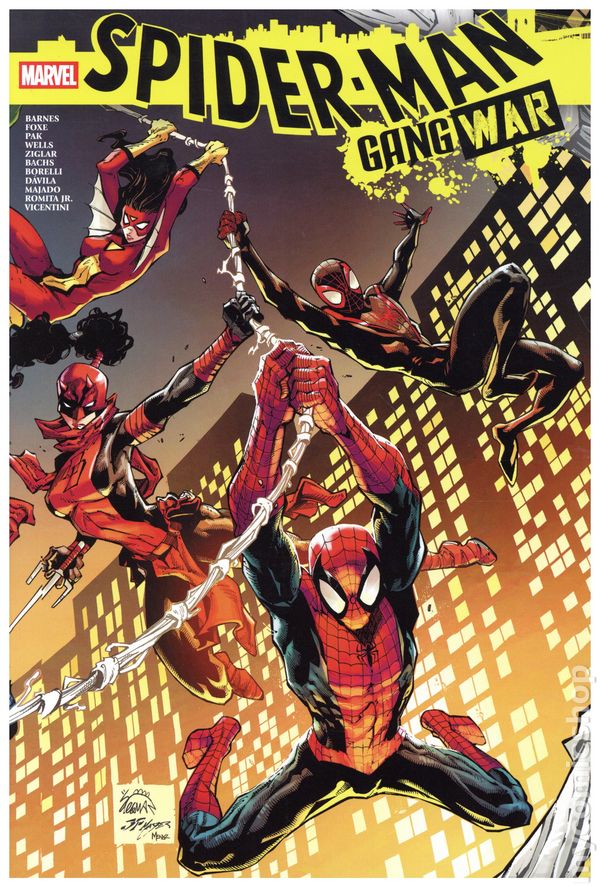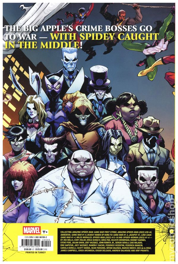 1st printing. Collects The Amazing Spider-Man: Gang War - First Strike (2023 Marvel), The Amazing Spider-Man (2022-2025 7th Series) #39-44, Daredevil: Gang War (2023 Marvel) #1-4, Deadly Hands of Kung Fu: Gang War (2023 Marvel) #1-3, Jackpot (2024 Marvel), Luke Cage: Gang War (2023 Marvel) #1-4, Miles Morales: Spider-Man (2023 Marvel) #13-16 and Spider-Woman (2024 Marvel) #1-4. Written by Zeb Wells, Rodney Barnes, Steve Foxe, Cody Ziglar, Celeste Bronfman, Grag Pak, and Erica Schultz. Art by Joey Vazquez, Julian Shaw, John Romita, Jr., Scott Hanna, Ramon F. Bachs, Carola Borell, Federico Vicentini, Federica Mancin, Eric Gapstur, Caio Majado, Sergio Dávila, and Sean Parsons. Cover by Ryan Stegman. Back Cover by John Romita, Jr., Caio Majado, Federico Vicentini, Sergio Dávila, and Sean Parsons. The complete saga of the Gang War pitting Marvel's street-level heroes against a horde of feuding crime bosses! When the gangs of New York go to war, no one is safe from the chaos that ensues - and Spider-Man knows that to beat them, he must join them. With his fellow Spider-Man Miles Morales, She-Hulk, Daredevil and Spider-Woman at his side, Spidey swings into action with the goal of shutting down these villains in under 48 hours - but will Tombstone be their biggest target or a surprising ally? Mayor Luke Cage can't just sit this one out behind a desk - and his predecessor, former Kingpin of Crime Wilson Fisk won't either! Meanwhile, Mary Jane Watson will try her luck as Jackpot - but as the leader of the Five Weapons Society, will Shang-Chi be on the side of the heroes or seeking to win the Gang War himself? Hardcover, 8 1/2-in. x 11-in., 680 pages, full color. Rated T+ Cover price $100.00.
