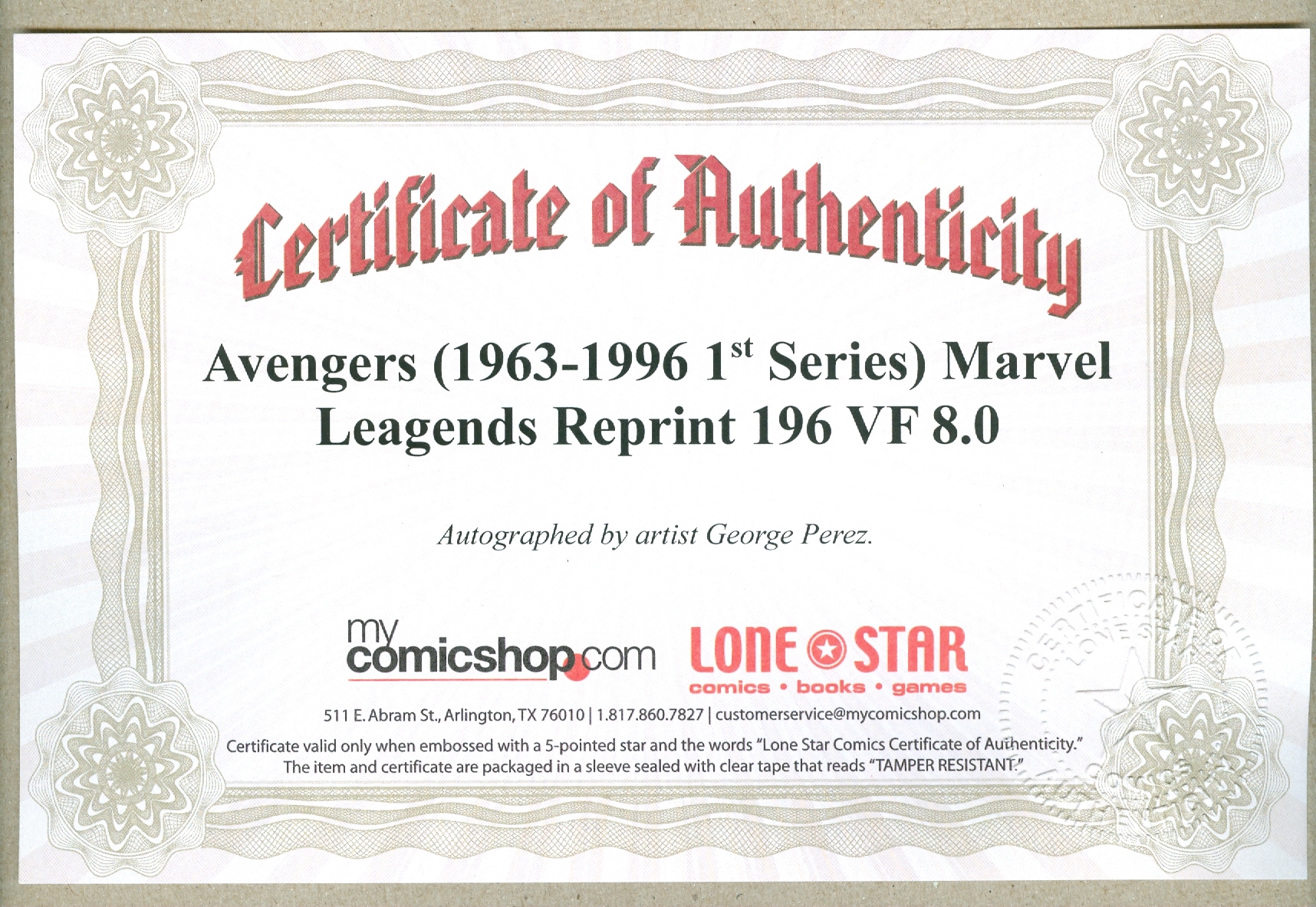 SOLD$10.80- Comic is autographed by artist George Perez and includes a Lone Star Comics Certificate of Authenticity.