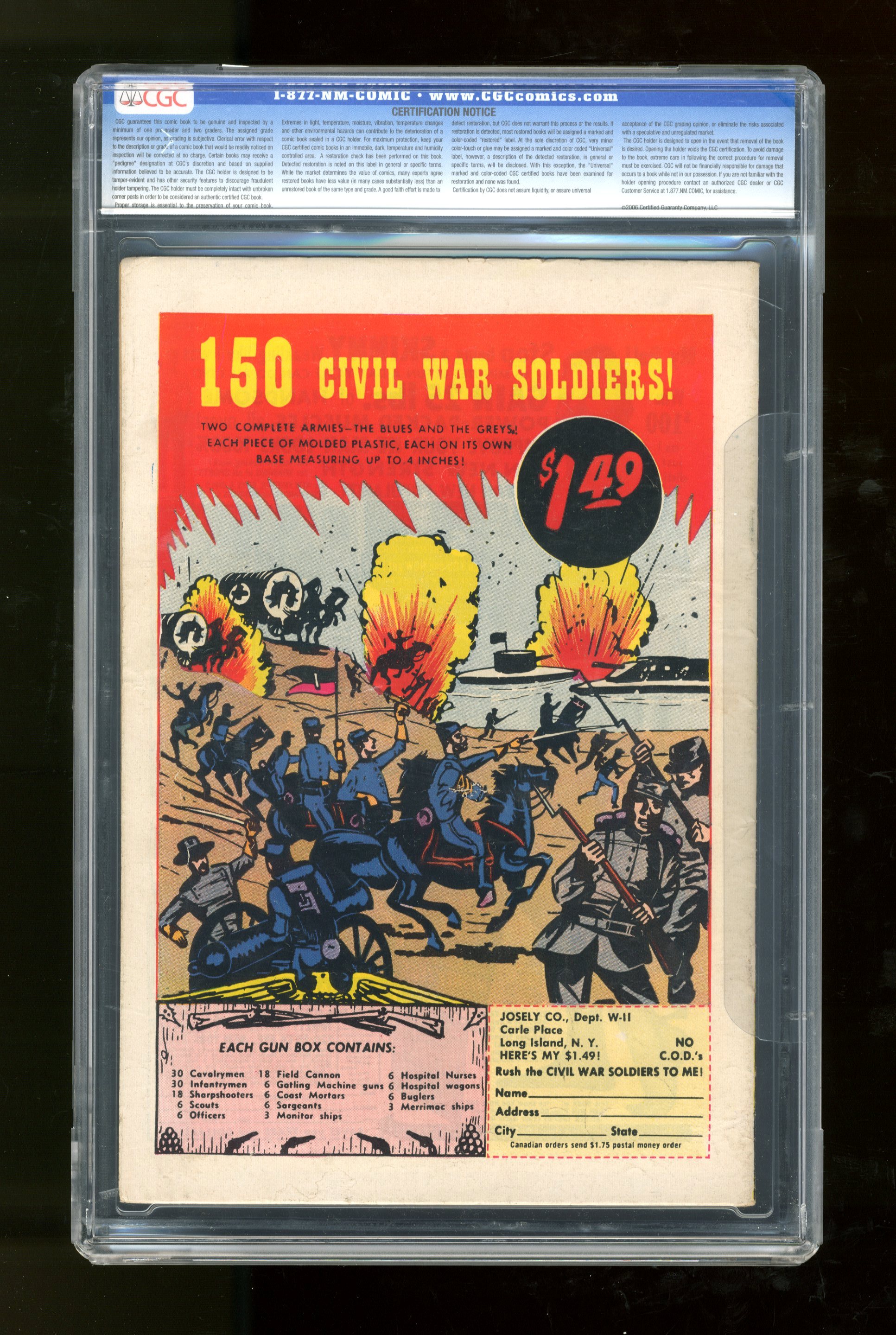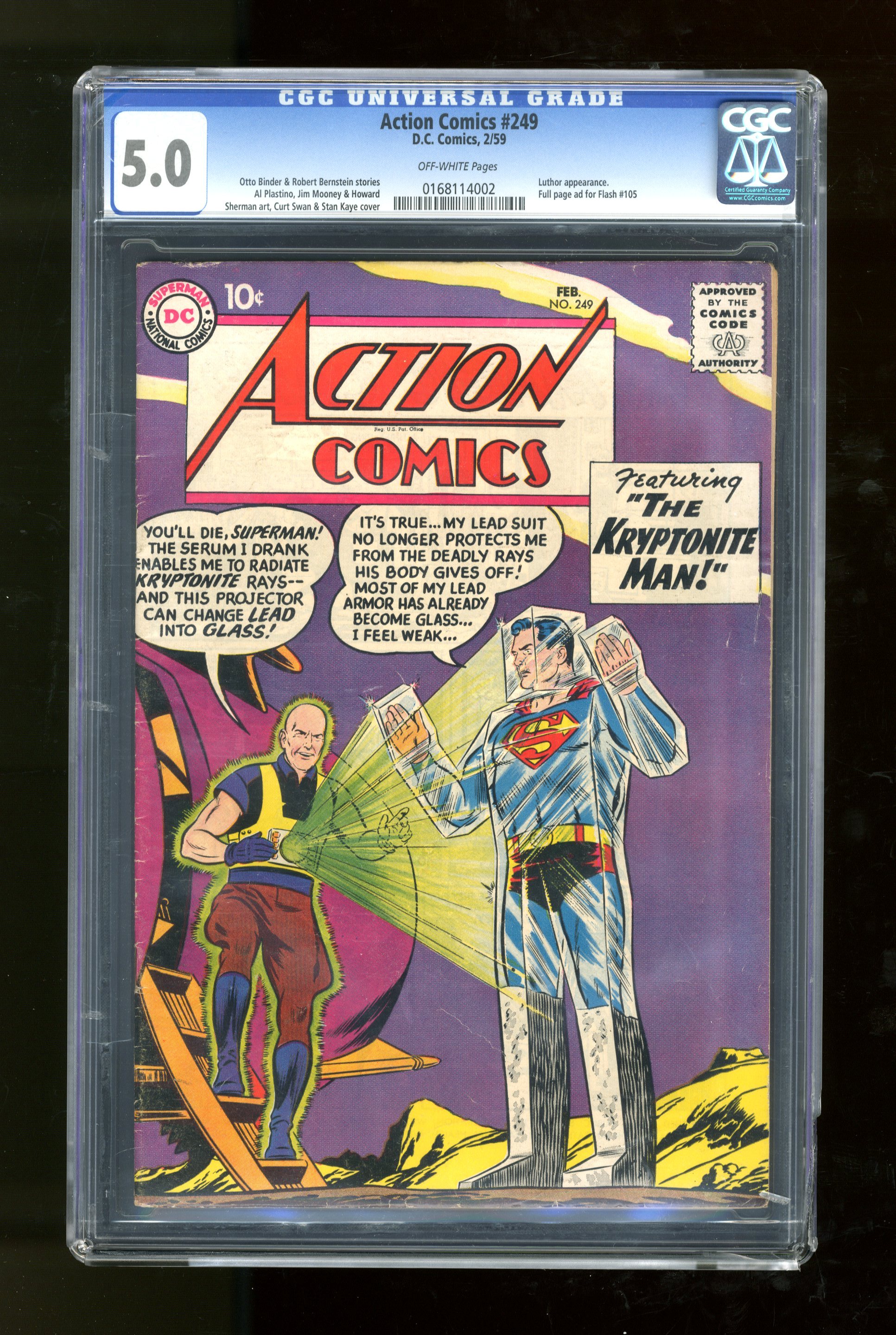 Ended May 24 2012 Winning Bid $55 Cover pencils by Curt Swan, inks by Stan Kaye. "The Kryptonite Man!", script by Otto Binder, art by Al Plastino; Luthor takes a liquid kryptonite serum which makes it impossible for Superman to get near him; Superman makes a lead suit to protect himself, but Luthor has discovered a way to turn lead into glass. -page Casey the Cop story by Henry Boltinoff. Supermen of America ad. "The Man-Ape's Mountain Mission," script by Robert Bernstein, art by Howard Sherman; As Congorilla goes on a dangerous mission to rescue some plane crash survivors, the body of Congo Bill is locked in a shack which is about to be blown up. One-page Varsity Vic story by Henry Boltinoff. "The Gambling Asteroid" starring Tommy Tomorrow, script by Otto Binder, art by Jim Mooney. One-page Private Pete story by Henry Boltinoff. 36 Pages, Full Color. $.10 Cover price $0.10. Grade: CGC 5.0 explanation of grade Condition: Used (collectible)