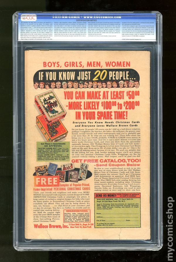 Origin and 1st Appearance of Spider-Man by Stan Lee and Steve Ditko (11pgs). 1st appearance of Aunt May and Uncle Ben. Cover pencils by Jack Kirby, inks by Steve Ditko. "Spider-Man!", script by Stan Lee, art by Steve Ditko; Peter Parker is bitten by a radioactive spider and gains the abilities of a spider; When he fails to stop a burglar who runs past him, his uncle is killed as a result; He therefore swears never to shirk his responsibility again. "The Bell-Ringer!", script by Stan Lee, art by Steve Ditko; On a small Mediterranean island of fisherfolk, Old Pedros is the town bell-ringer; One day the volcano atop the island begins to erupt; The villagers evacuate and put out to sea; Old Pedros, though, stays at the church; "The bells must be rung," he tells himself. "Man in the Mummy Case!", script by Stan Lee, art by Steve Ditko; A fugitive accepts a mummy's help to escape the police, only to find himself an ancient Egyptian slave. Stan Lee's editorial explaining title change. "There Are Martians Among Us!", script by Stan Lee, art by Steve Ditko; The discovery of a crashed flying saucer frightens a small town, especially when the townspeople realize that the Martians are among them; A month goes by with the aliens still at large. 36 pgs., full color. Cover price $0.12. Grade: CGC 1.8 explanation of grade Condition: Used (collectible)