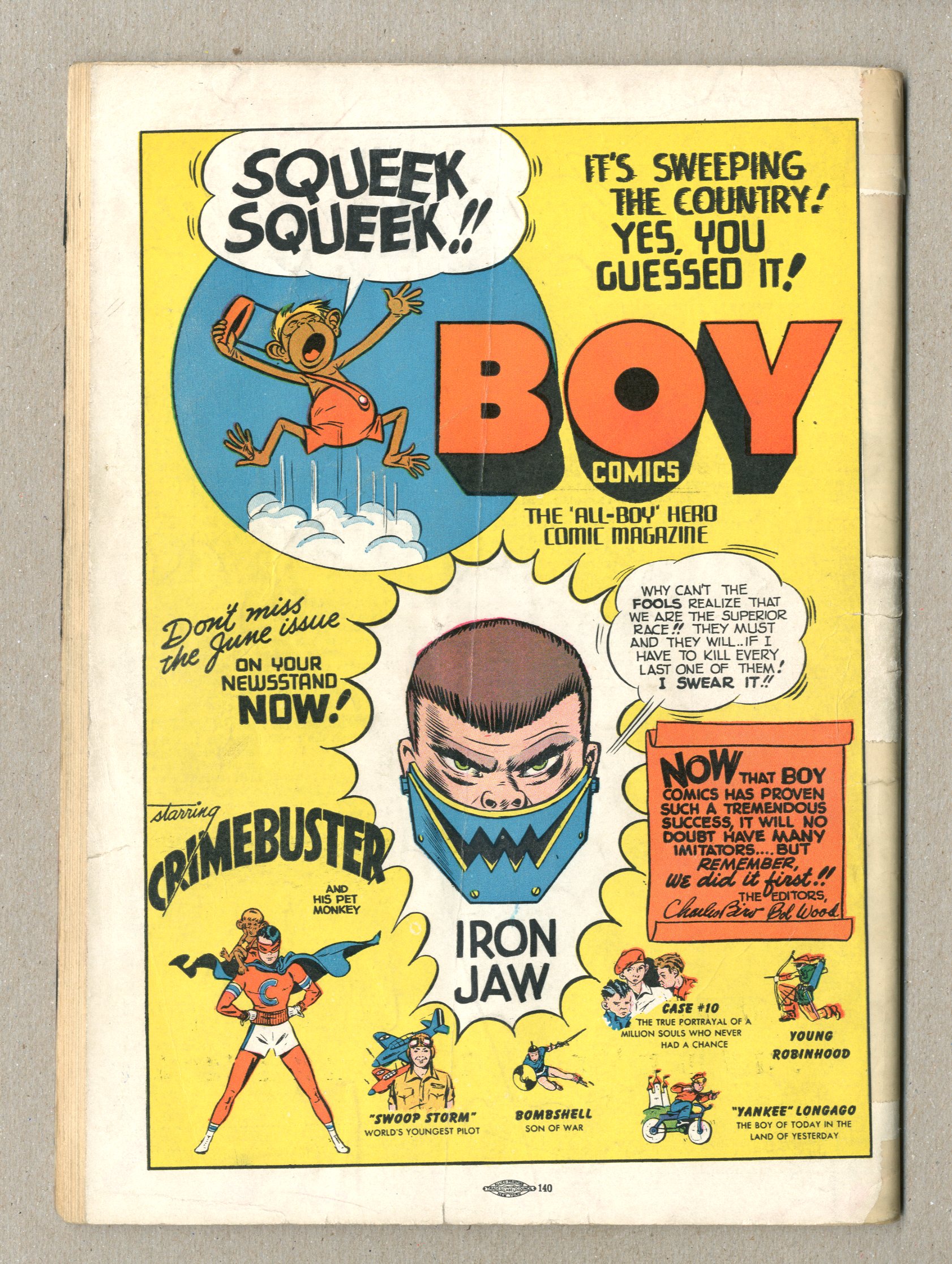 Ended Dec 10 2012 Winning Bid $178 Cover by Charles Biro. Stories and art by Charles Biro, Dick Wood, Bob Wood, Frank Volp, Carl Hubbell, Bob Montana, Lin Streeter, and Dick Briefer. This early superhero title was one of the comics that made publisher Lev Gleason a major player during the Golden Age. Sniffer and the Deadly Dozen join the Army, using their strange abilities in exchange for pardons at the end of World War II - perhaps moved by the real-life unit that also inspired the film "The Dirty Dozen." Apache superhero the Bronze Terror is framed by an impostor during the shooting of the Bronze Terror movie, in a story with art (and a particularly cool splash page) by Dick Briefer. Two stories with early art by Archie creator Bob Montana. Also featuring a Daredevil PSA for Savings Bonds and Stamps, a WWII fundraising drive. Curious tickle-bondage cover by Charles Biro, featuring an exceptionally hideous villain. Daredevil: The Phantom of Notre Dame; Thirteen and Jinx; Sniffer; Crimebuster and the Phantom Preacher; Houdonnit the Great; Real American #1; London; Pat Patriot; Whirlwind; Times Square; Claw. 68 pages, Full Color. Cover price $0.10. Grade: GD 2.0 explanation of grade Condition: Used (collectible)