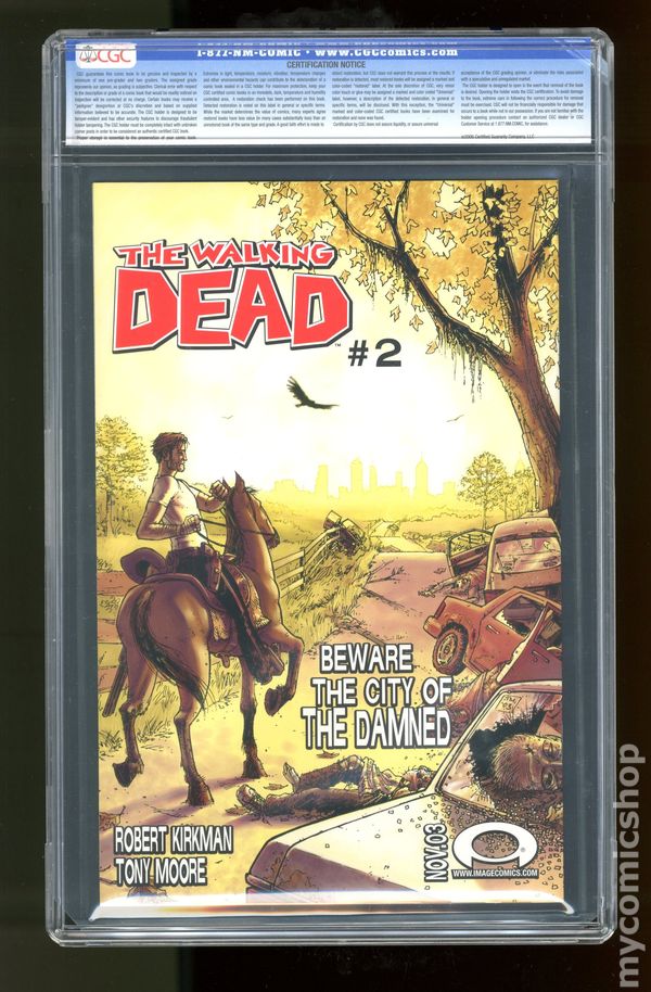 Ended Dec 14 2012 Winning Bid $1,803 1ST PRINTING. (W) Robert Kirkman (A) Tony Moore BW 32pp $2.95 Monthly ongoing Series In stores the week of October 1st. THE CONCEPT: How many hours are in a day when you don't spend half of them watching television? When is that last time any of us REALLY worked to get something that we wanted? How long has it been since any of us really NEEDED something that we WANTED? The world we knew is gone. The world of commerce and frivolous necessity has been replaced by a world of survival and responsibility. An epidemic of apocalyptic proportions has swept the globe, causing the dead to rise and feed on the living. In a matter of months society has crumbled, no government, no grocery stores, no mail delivery, no cable TV. In a world ruled by the dead, we are forced to finally start to live. THIS ISSUE: Rick Grimes is not prepared for this. A couple months ago he was a small town cop who had never shot anyone and only ever saw one dead body. Separated from his family he must now sort through the death and confusion to try and find his wife and son. All the while fighting for his survival. How did this happen? How did things get so bad so fast? How will things ever return to normal after everything he's seen? From the guys behind BATTLE POPE and BRIT comes something COMPLETELY different. Cover price $2.95. Grade: CGC 9.8 explanation of grade Condition: Used (collectible)