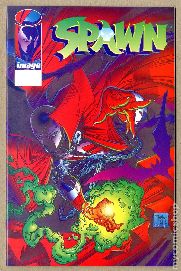 Misprint Variant. Printed without black ink on the front and back covers. Nearly all of these misprinted copies were destroyed at the factory. "Questions!" Part 1 of 4. Created, story, and art by Todd McFarlane. When government assassin Al Simmons is murdered, a deal with the devil brings him back to the realm of the living. But now he walks the shadows as the disfigured soldier of hell known as Spawn. Armed with unimaginable, but finite, magical abilities, Spawn is destined to play an important role in the upcoming Armageddon. But, what happens when this rebellious anti-hero decides he won't fight for either side? Superstar artist and Image co-founder, Todd McFarlane, creates a character who has gone on to inspire a major motion picture, an HBO animated series, numerous spin-off comic series, and one of the most successful toylines of all time. Spawn centerfold by Todd McFarlane & Ken Steacy. Pin-up of Spawn by George Perez. Pin-up of PITT by Dale Keown. Cover by McFarlane & Steacy. 1st app of Sam and Twitch Cover price $1.95. Grade: NM 9.4 explanation of grade Condition: Used (collectible)