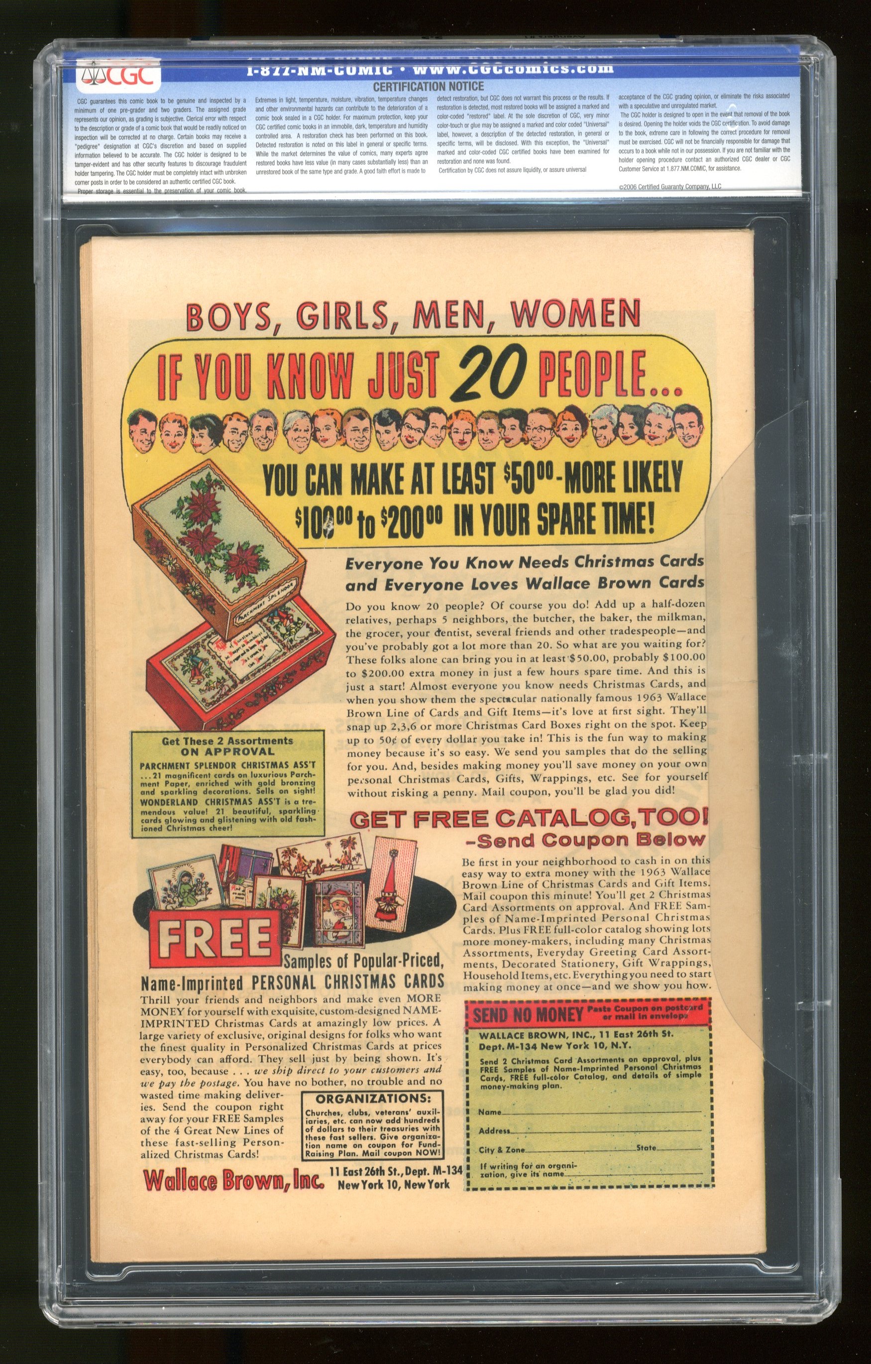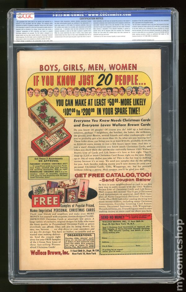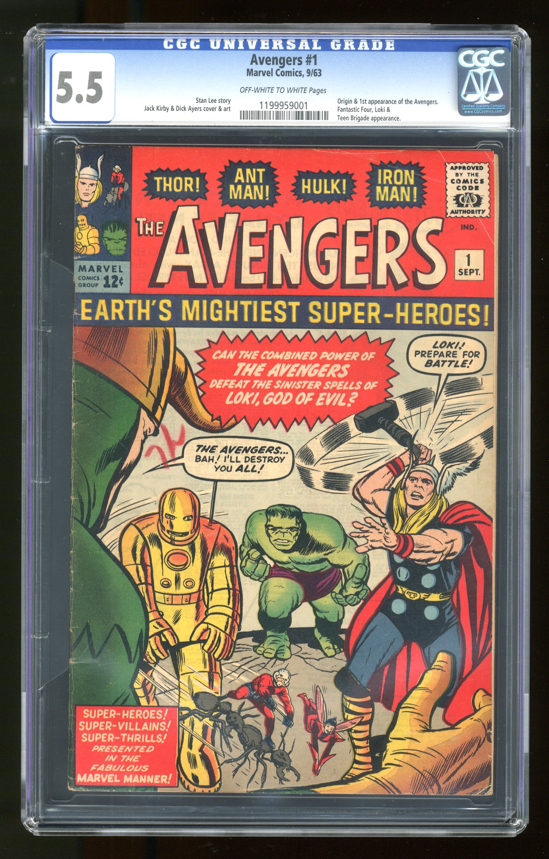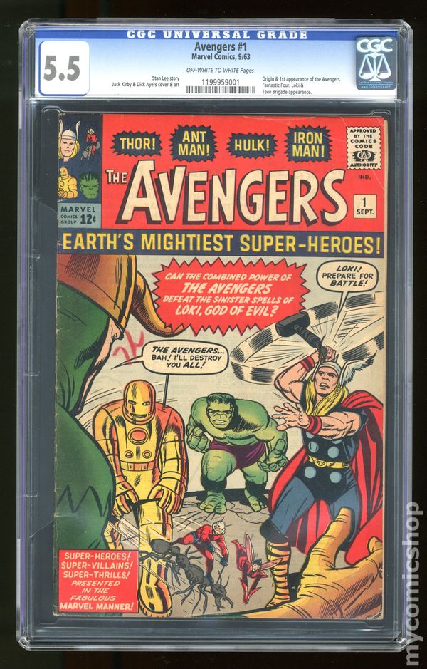 Ended Jan 13 2015 Winning Bid $2,908 Cover pencils by Jack Kirby, inks by Dick Ayers. In this first landmark issue, Thor, Hulk, Iron Man, and Ant Man form the Avengers in "The Coming of the Avengers!", script by Stan Lee, pencils by Jack Kirby, inks by Dick Ayers; Loki, having been previously captured by Thor, is being held prisoner at the Isle of Silence in Asgard; His physical form may be confined there, but by means of thought projection his disembodied self travels to Earth in search of revenge; He spots Thor in his human identity of Dr. Don Blake, but resists defeating him as it would be a hollow victory compared to defeating him as Thor; After hours of searching, Loki happens across the Hulk and devises a wicked plan to entice Blake to transform into Thor; Hours later, newspapers print articles about the Hulk being on the rampage again and a manhunt begins; The Hulk's friend, Rick Jones, reads the article with disbelief and meets with members of the Teen Brigade in order to find help to track Hulk down to find the truth; They attempt to contact the Fantastic Four but Loki interferes with the radio signal, diverting it to Don Blake; He decides to transform into Thor to help the Teen Brigade; Unknown to Loki, the radio signal is also picked up by Ant-Man, the Wasp, and Iron Man, who also travel to assist; Iron Man, Ant-Man and the Wasp pursue the Hulk to an auto factory in Detroit; Thor appears with Loki to clear Hulk's name; Suddenly Loki makes himself radioactive forcing the heroes to retreat; Luckily, Loki stands over a trapdoor and Ant-Man's ants trigger a switch, dropping him into a lead-lined tank; Upon celebrating their victory, Ant-Man and the Wasp point out how well they could work as a team, and that they should work together in future; The Wasp decides they should call themselves the Avengers, and everybody agrees. 36 pgs., full color. $0.12. Cover price $0.12. Grade: CGC 5.5 explanation of grade Condition: Used (collectible)