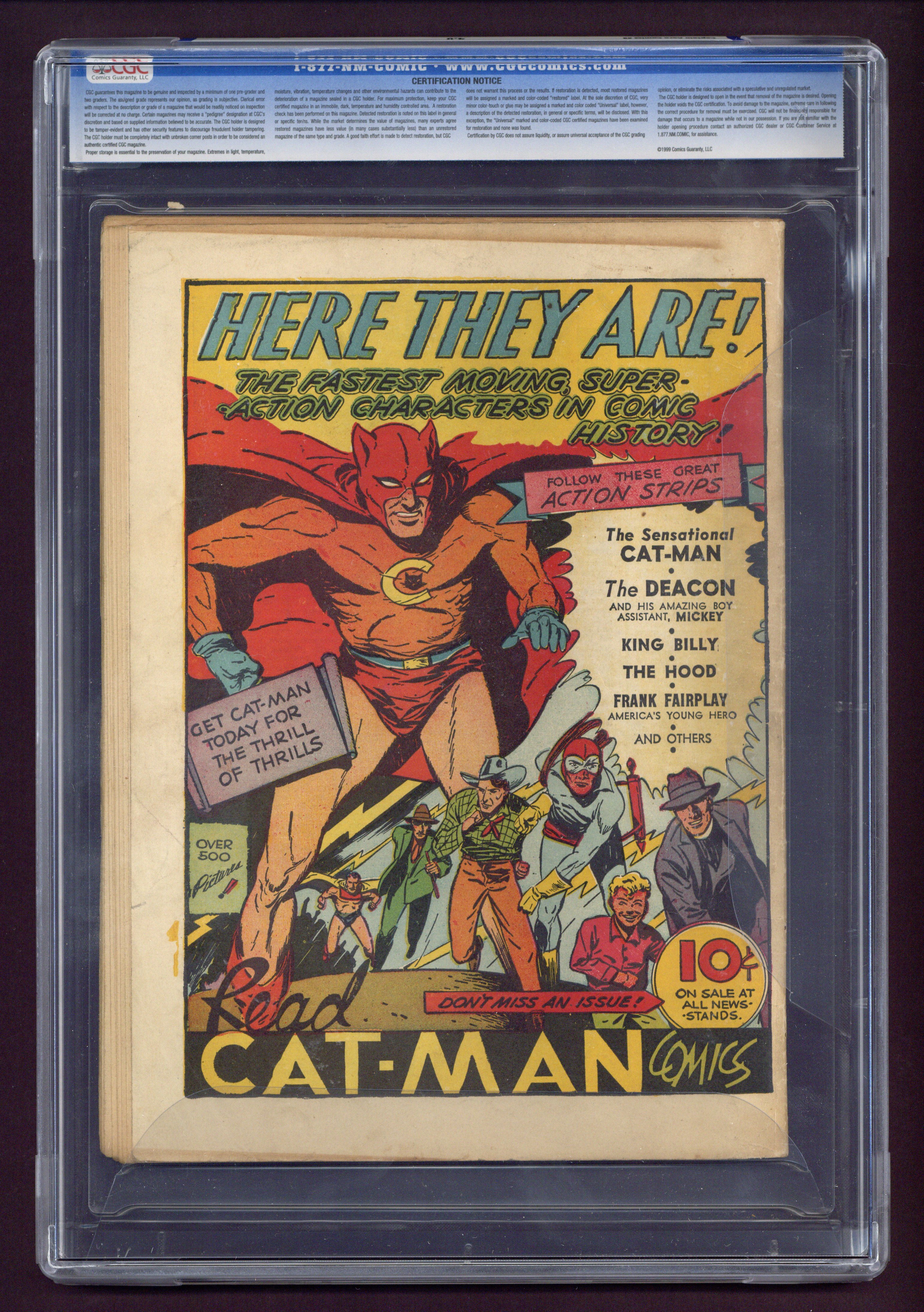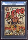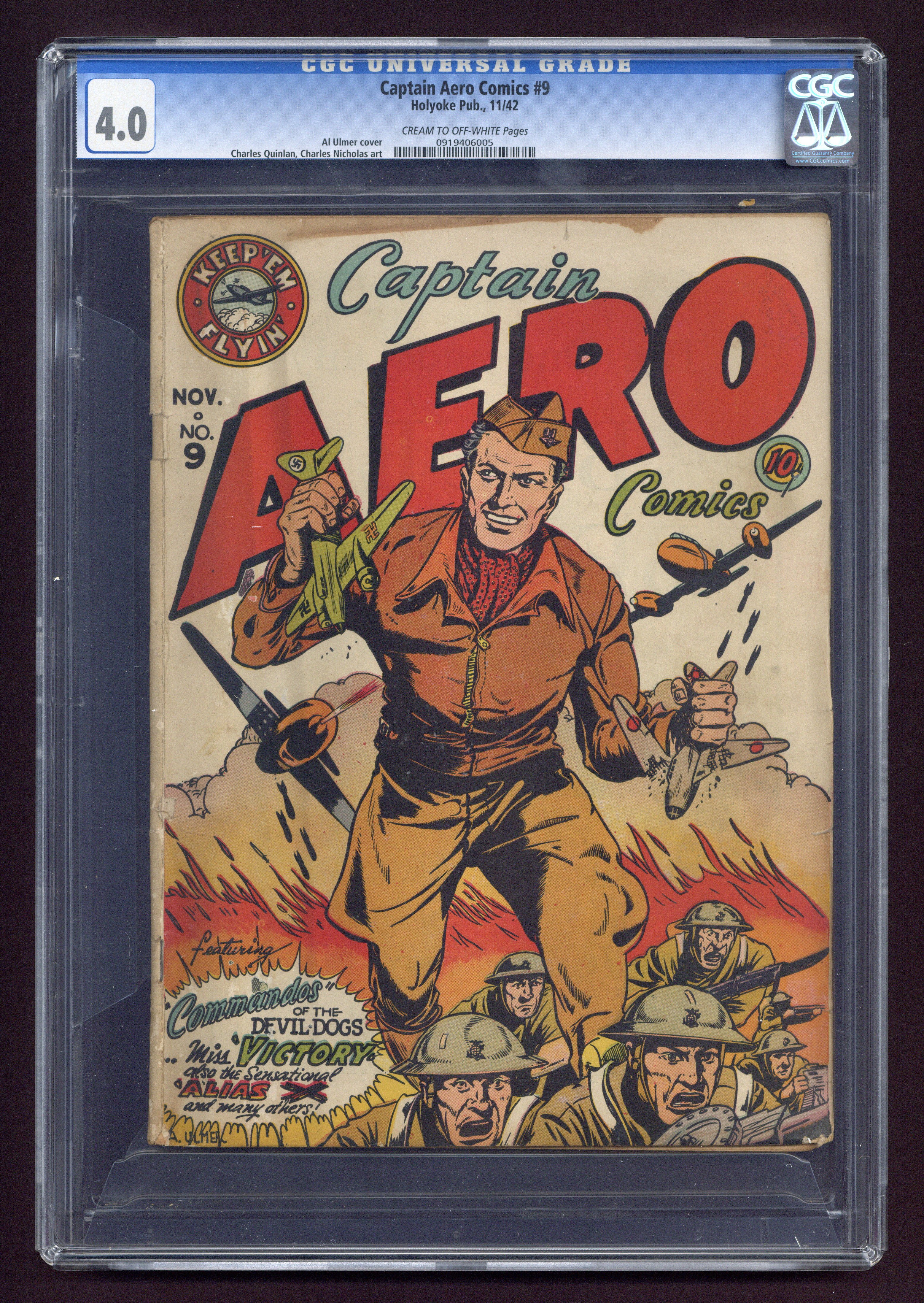 Cover by Allen Ulmer. Stories and art by Alberta Tews, Charles Nicholas, Sol Brodsky, Allen Ulmer, Ed Murphy, Charles Quinlan and Alan Mandel. Sometimes listed as Captain Aero Comics Vol. 2 #3. A patriotic WWII aviator hero whose motto is "Keep 'Em Flyin'!" Captain Aero and Buster must use an outdated plane to rescue a squad trapped behind enemy lines. Doctor/superhero Red Cross aids a woman in the French Resistance. Flagman and Rusty battle the Axis supermen known as the Greezo Brothers. Captain Aero; Alias X: Lesson In Silence; Commandos of the Devil Dogs; Hammerhead Hawley; A Foray in the Night; Lieutenant Commander Fighting Man Edward G. O'Hare; Captain Aero's Sky Scouts: Red Cross; Miss Victory; Flagman. 64 pages, Full Color. Cover price $0.10. Grade: CGC 4.0 explanation of grade Condition: Used (collectible)