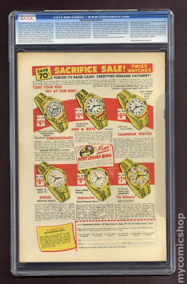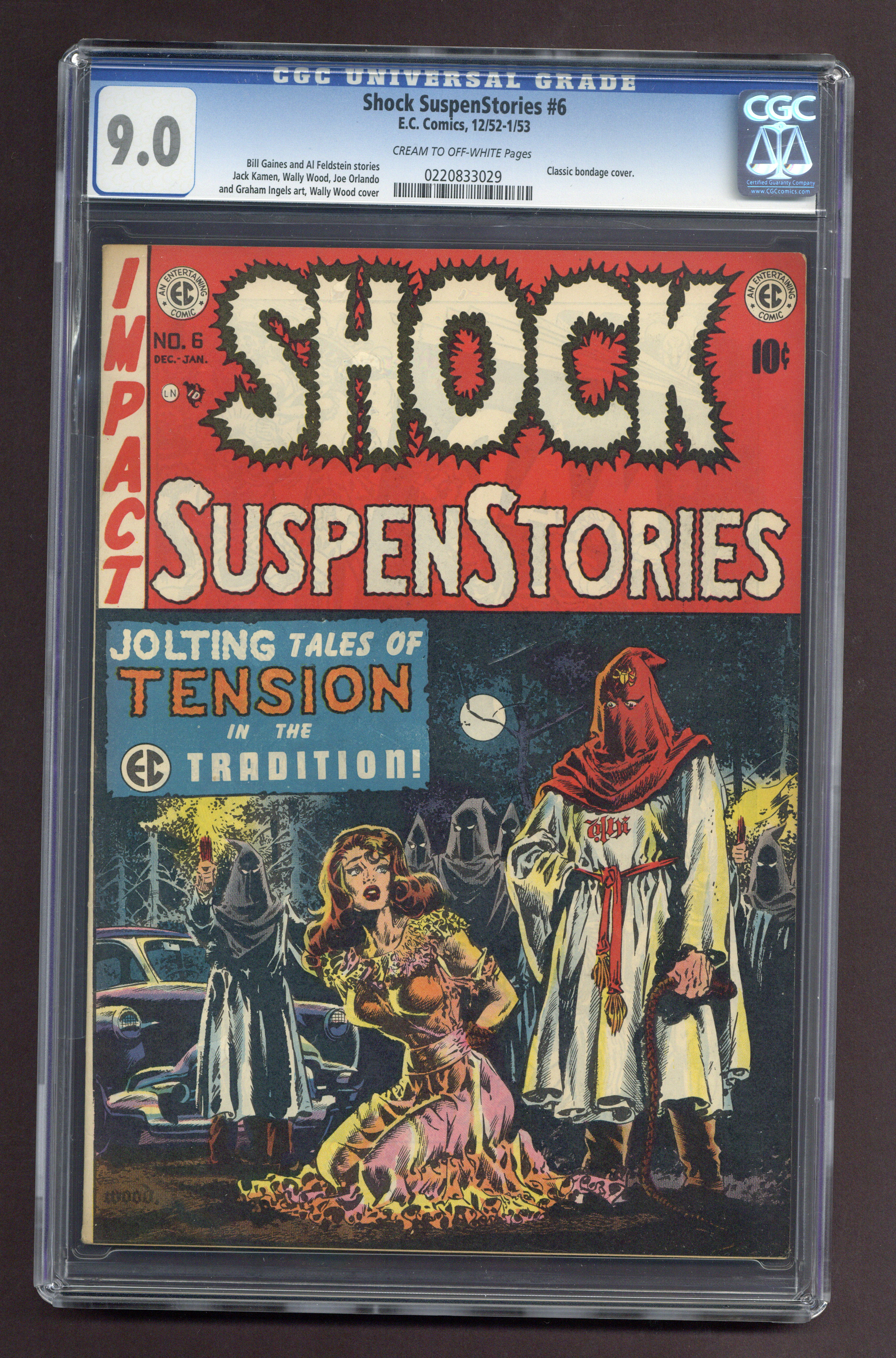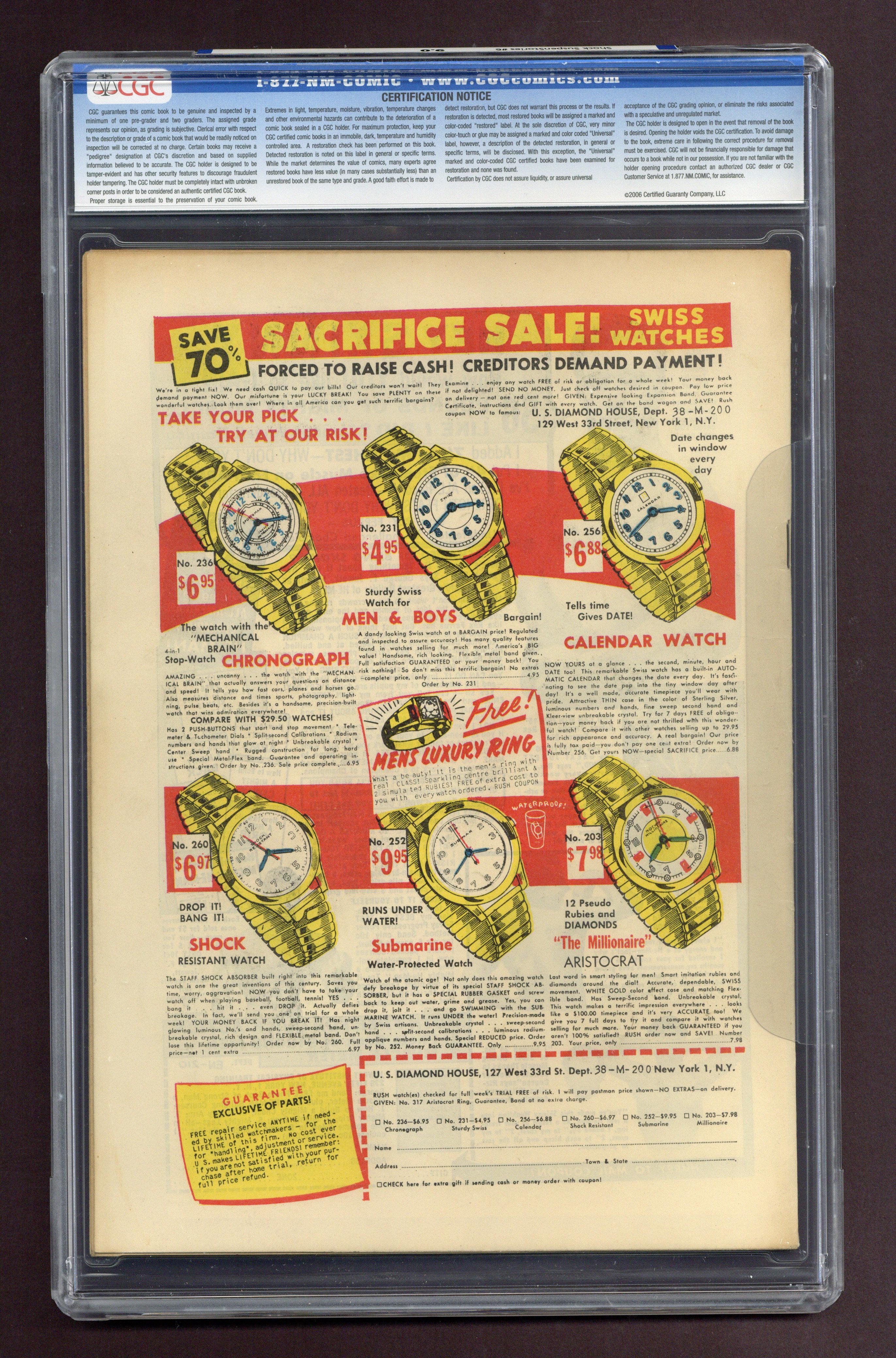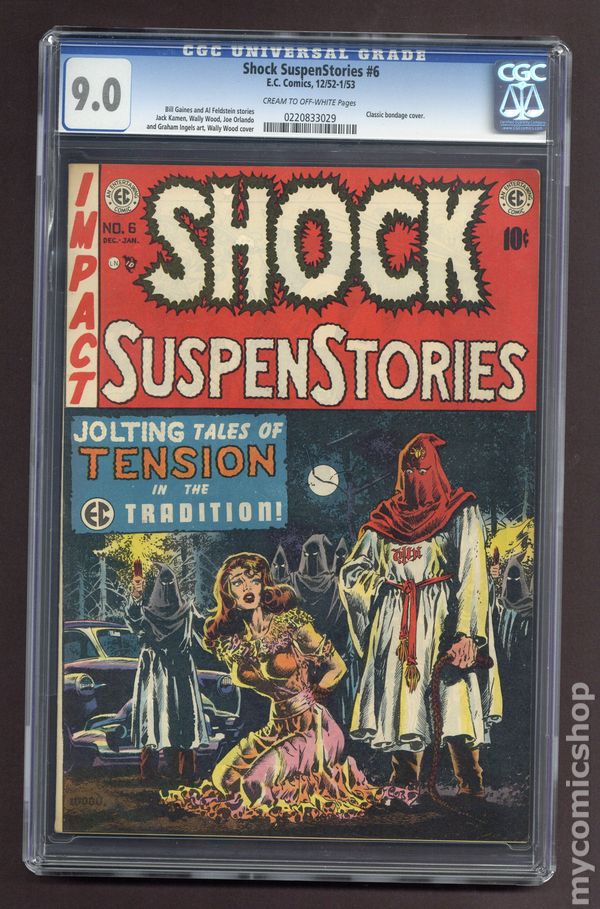 Ended Jan 23 2015 Winning Bid $953 Cover art by Wally Wood. Dead Right!, script by Albert B. Feldstein, art by Jack Kamen; A fortune teller predicts to a woman that a man who wants to marry her, but she finds repulsive, is going to inherit twenty-five thousand dollars and die shortly afterward, so she marries him. Under Cover!, script by Albert B. Feldstein, art by Wally Wood; When Sam Masters sees a secret society whip a girl to death he tries to contact the F.B.I. before they can catch him. The Bend! text story by Albert B. Feldstein, art by Marie Severin. Not So Tough!, script by Albert B. Feldstein, art by Joe Orlando; A space commander who is as tough as nails on his crew is reduced to soft putty in the grip of a large gravitational force. Sugar 'N Spice 'N..., script by Albert B. Feldstein, art by Graham Ingels (as Ghastly); A brother and sister lose their ball in the yard of an old woman whom they referred to as "The Old Crab"; She eventually gave them the ball back, but warned them to stay away. 36 pgs. $0.10. NOTE: This issue was reprinted by East Coast Comics with a $1 cover a 1970's copyright date (see E.C. Classic Reprints #8). These and other changes make the reprint easy to distinguish from the original which has a 10-cent cover price and a 1950's publication date. Cover price $0.10. Grade: CGC 9.0 explanation of grade Condition: Used (collectible)