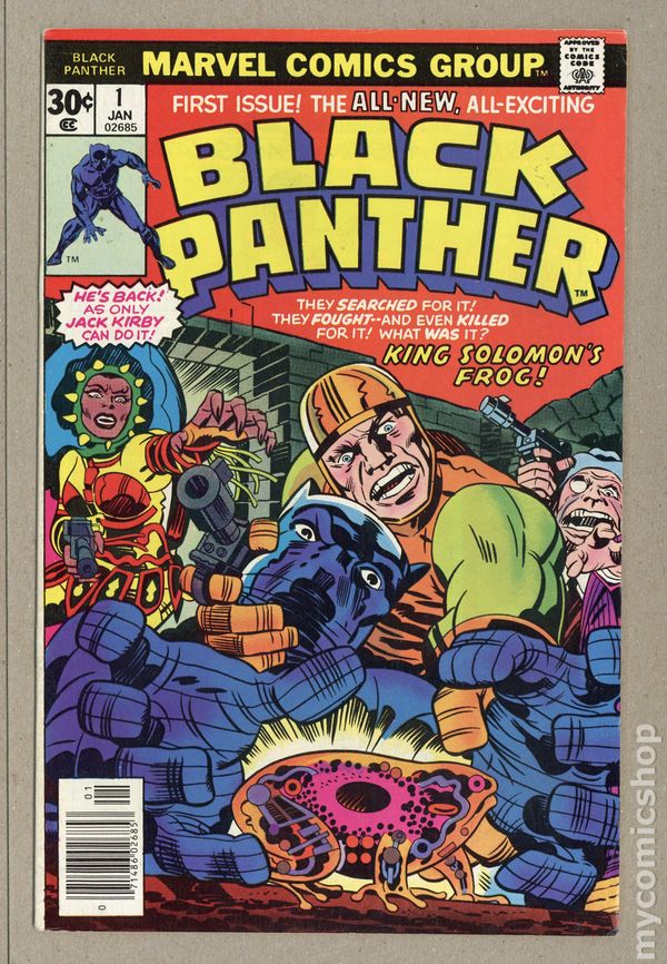Ended May 15 2015 Winning Bid $43 Cover pencils by Jack Kirby, inks by John Verpoorten. King Solomon's Frog!, script and pencils by Jack Kirby, inks by Mike Royer; Black Panther helps Abner Little, a member of the Collectors, recover the Brass Frog, an ancient time machine; Due to its dangerous nature, the Frog had previously been hidden away by the Black Panther's grandfather, Azzuri, but was taken by Alfred Queely, a fellow member of the Collectors; After getting the Frog, the Black Panther and Little are attacked by Princess Zanda, another member of the Collectors, for control of the artifact. During the battle, the Frog is activated and a mysterious creature, Hatch-22, appears. Jack Kirby writes about what readers can expect from his new Black Panther. 36 pgs. $0.30. Cover price $0.30. Grade: FN- 5.5 explanation of grade Condition: Used (collectible)