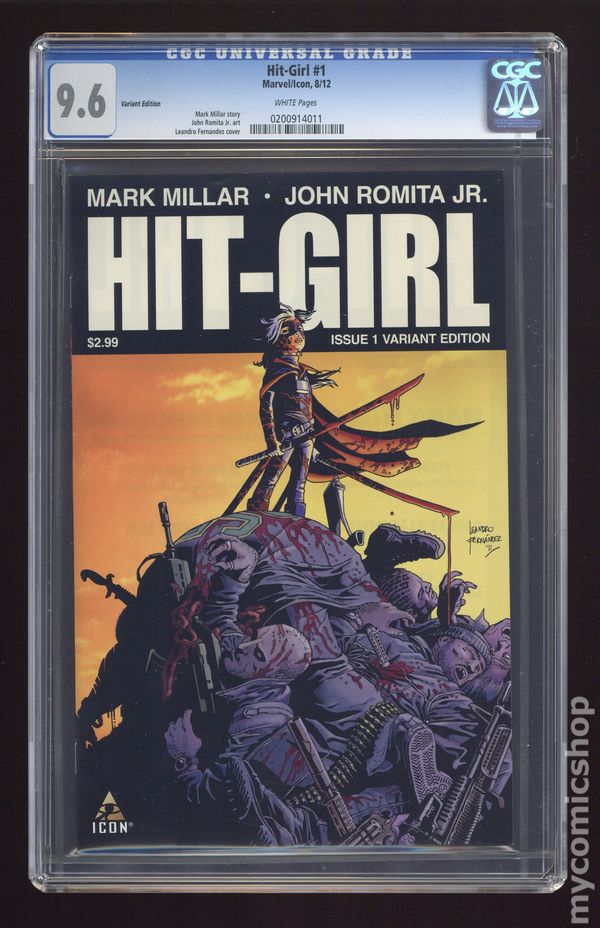 Ended Mar 19 2015 Winning Bid $60 Limited 1 for 25 Variant Cover by Leandro Fernandez (W) Mark Millar (A) John Romita From Marvel Comics. Hit-Girl spins off into her own blood-soaked series by the sales-busting creative team of Mark Millar and John Romita Jr. This story takes place between Kick-Ass Volumes 1 and 2 as Mindy McCready tries to settle into life as a regular school-girl, but wants nothing more than to be dispensing hot justice to the scum of New York City. Her mother and step-father think she's doing her homework, but in reality she's taken Kick-Ass on as her sidekick and is training him up to punch, shoot and stab ... just like Daddy would have wanted. Cover price $2.99. Grade: CGC 9.6 explanation of grade Condition: Used (collectible)