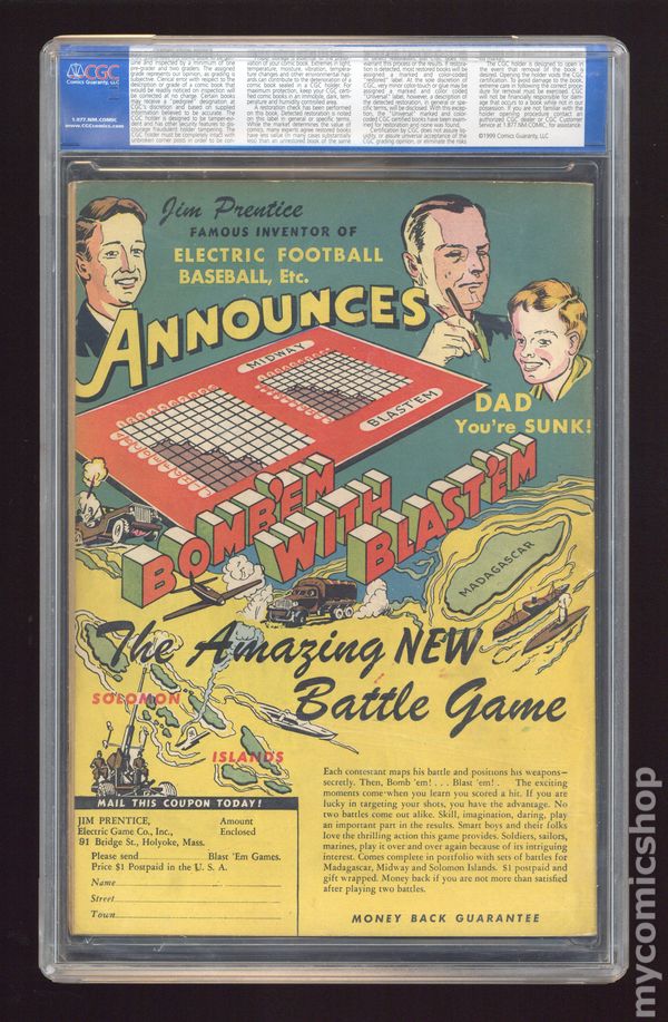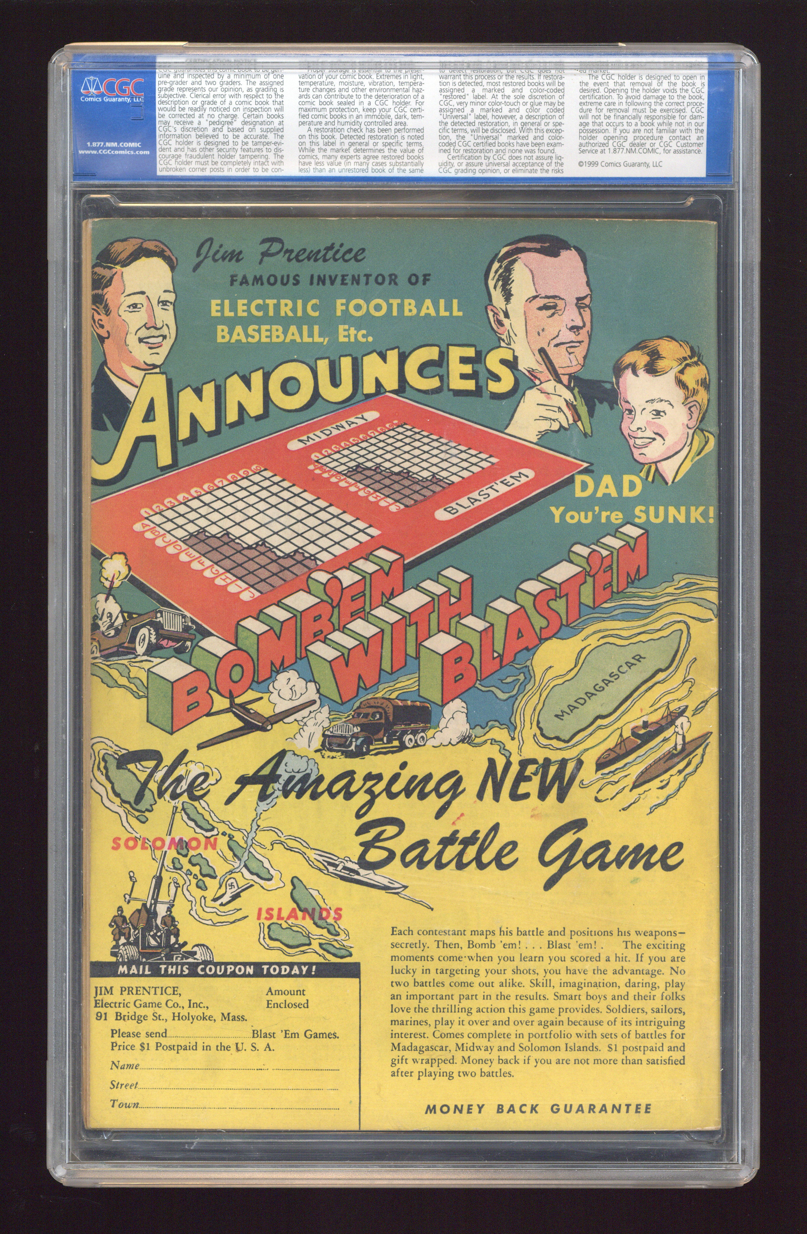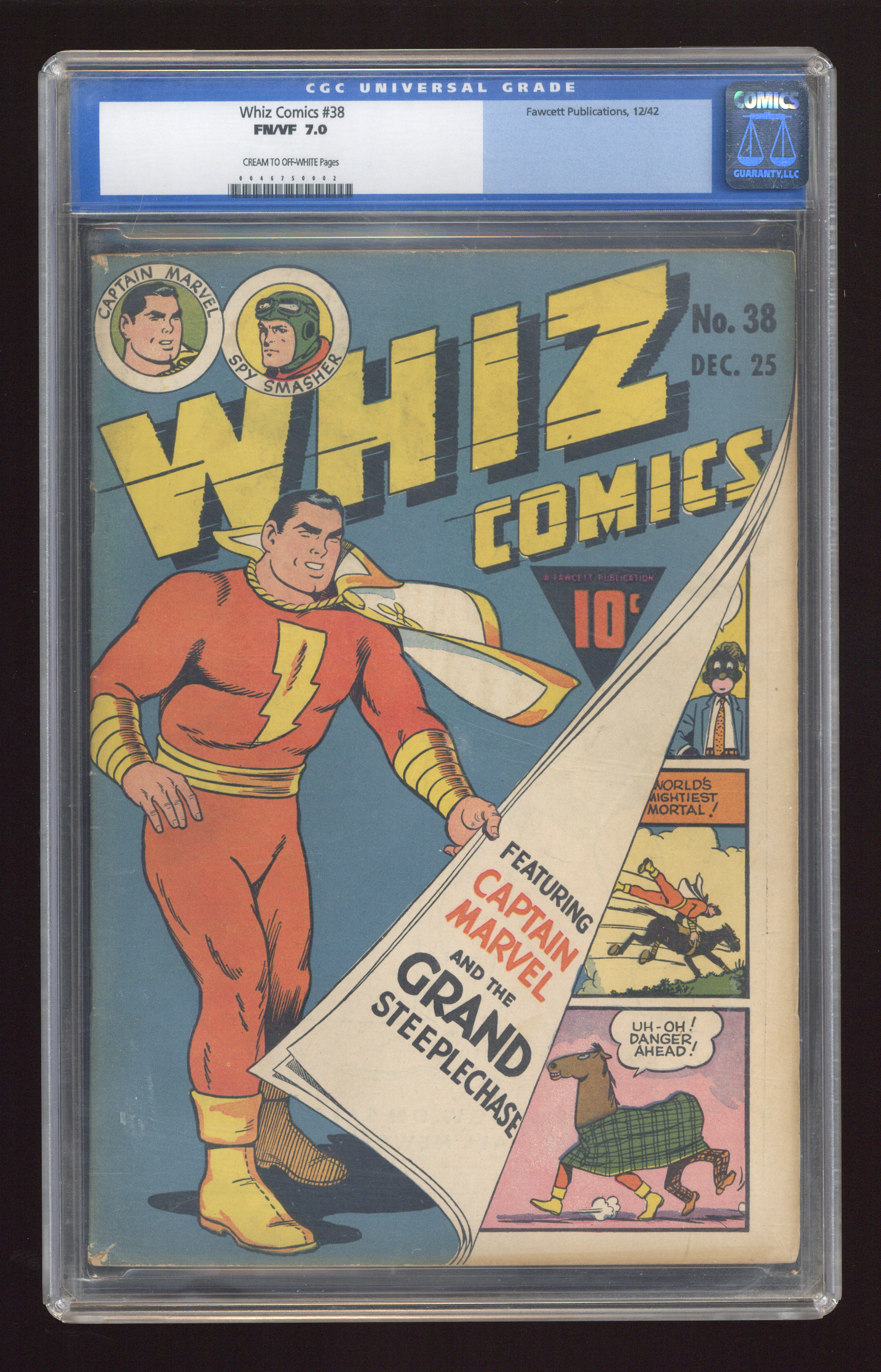 Ended Mar 9 2015 Winning Bid $94 Cover by Marc Swayze. Written by Otto Binder and unknown. Art by Marc Swayze, Clem Weisbecker, Bob Hebberd, George Storm and unknown. Captain Marvel in "The Grand Steeplechase" by Otto Binder and Marc Swayze. Plus: Golden Arrow in "The Vanishing Trains" with story by Otto Binder; Spy Smasher in "The Phantom Sub"; The Mad Artist 1-pager; 2-page text story "Cry by Night" by Jim Kjelgaard; "Lance O'Casey Sinks the Japs" with art by Clem Weisbecker; Ibis the Invincible tale "Murgh the Merciless" with art by Bob Hebberd; and Colonel Porterhouse in parody tale "The Briny Avenger and the Wolves of the Deep" with art by George Storm. 68 pages, full color. Cover price $0.10. Grade: CGC 7.0 explanation of grade Condition: Used (collectible)