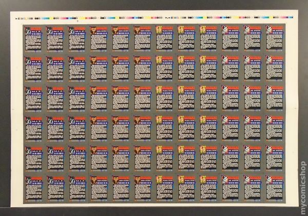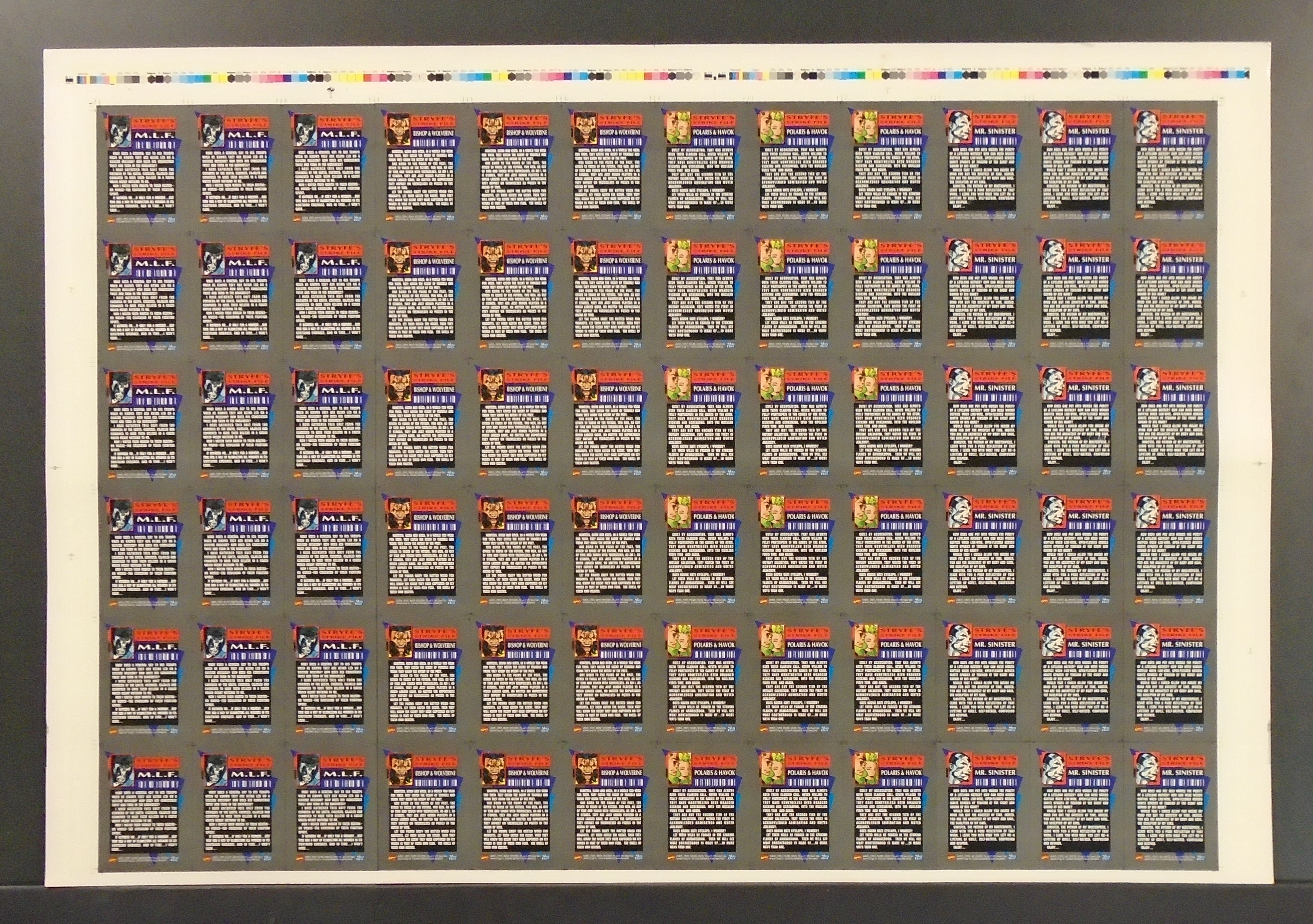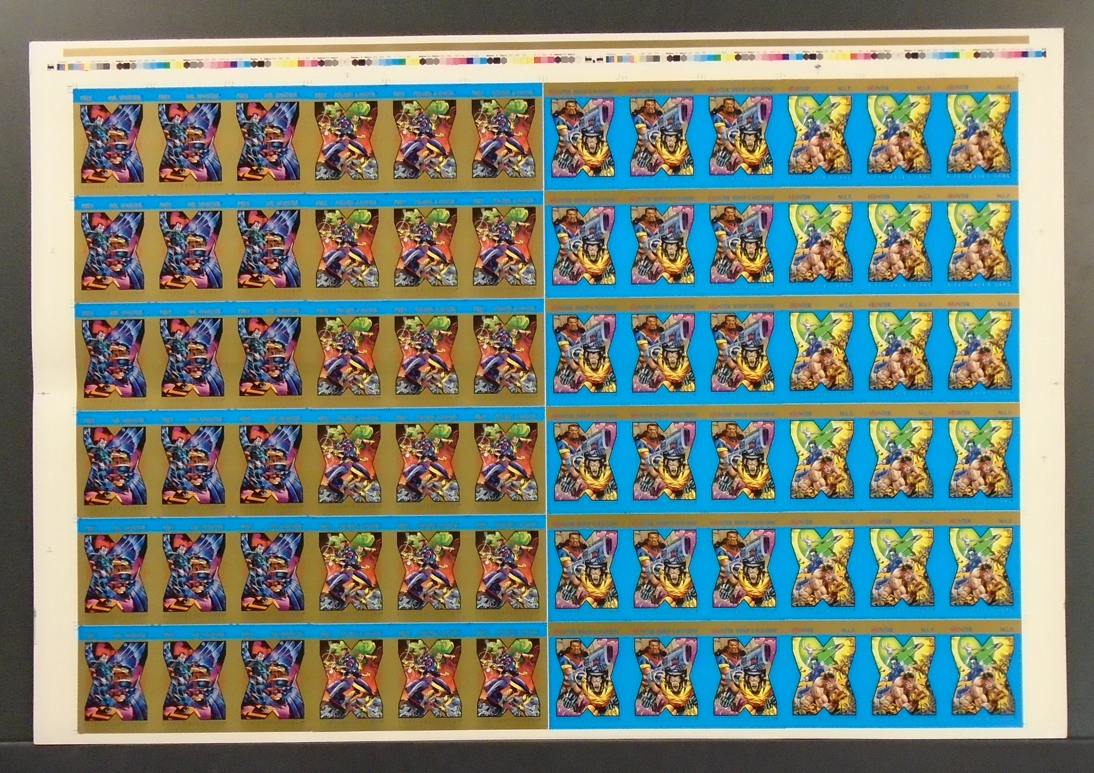 Uncut Sheet of X-Men: Hunter/Prey Skybox Trading Cards- Uncut sheet of X-Men: Hunter/Prey trading cards from Skybox. High-quality print on cardstock. 36" x 24-1/2", full color.