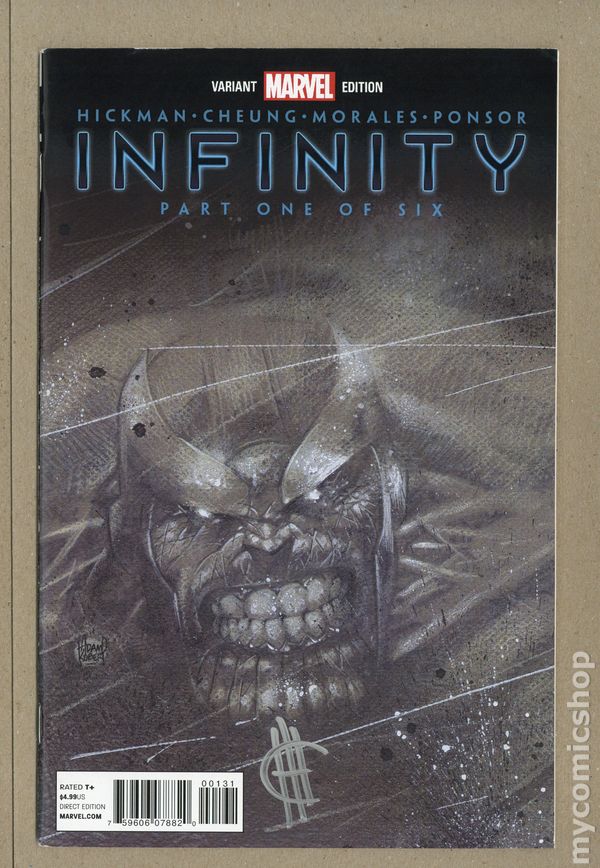 Ended Sep 3 2024 Winning Bid $19 Party Variant Cover by Adam Kubert. (W) Jonathan Hickman (A) Jim Cheung The oversized kickoff to the year's most anticipate Blockbuster summer event, chaning the way you view the Marvel Universe! The outbreak of war on two fronts: Earth and Space, with our heroes torn between them. The world-shattering return of Thanos! Includes material from FREE COMIC BOOK DAY: INFINITY" Grade: FN/VF 7.0 explanation of grade Condition: Used (collectible)