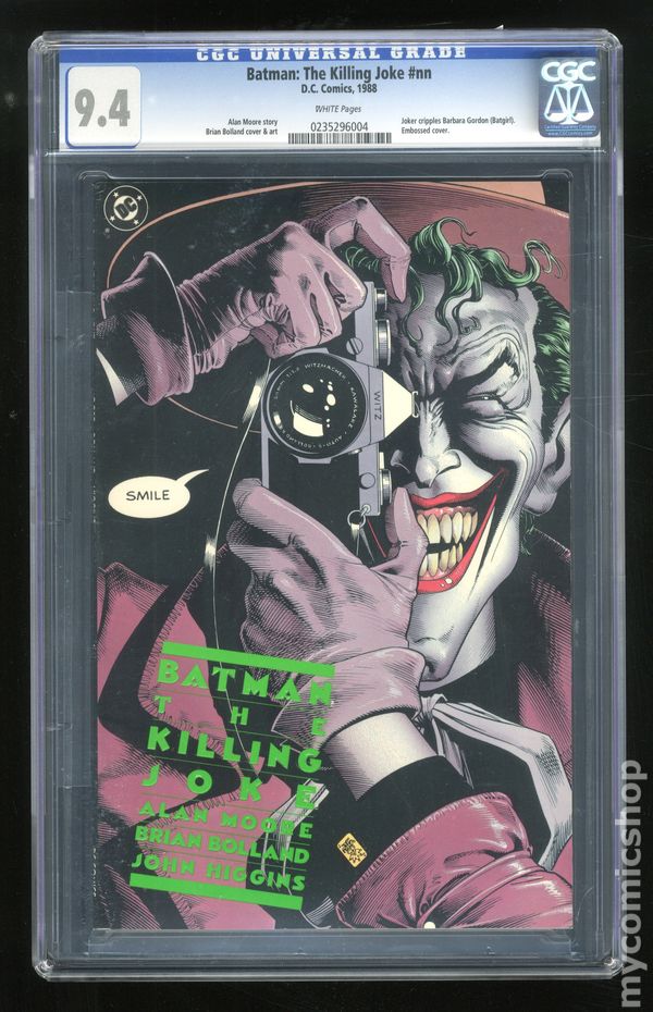 Ended Jul 18 2015 Winning Bid $82 1st Printing. Batman matches wits with his arch nemesis The Joker in this critically acclaimed, prestige format one-shot. He also laughs at one of his jokes. The book is infamous for the scene in which The Joker shoots and cripples Barbara Gordon, effectively ending her crime fighting career as Batgirl. Written by Alan Moore, with art by Brian Bolland. 52 pages, full color. NOTE: 1st Printing, title is printed in lime green embossed ink. All others are later printings. Cover price $3.50. Grade: CGC 9.4 explanation of grade Condition: Used (collectible)