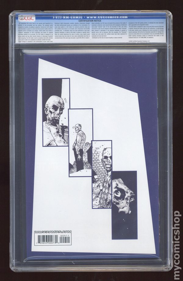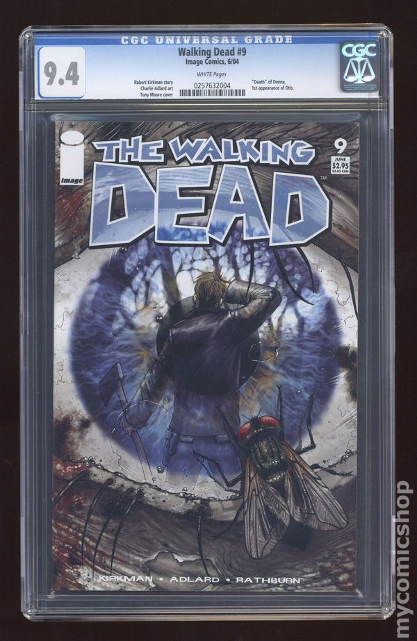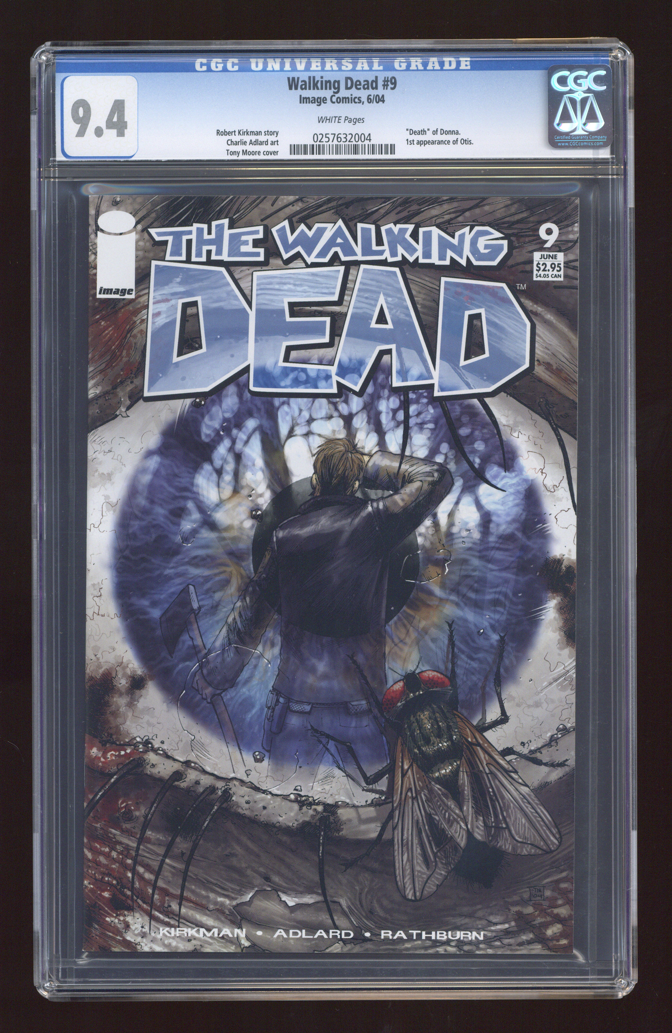 Ended Nov 12 2015 Winning Bid $54 Written by ROBERT KIRKMAN Art by CHARLIE ADLARD Cover by TONY MOORE BW 32 pgs. $2.95 Monthly ongoing series On Sale 30 JUNE, 2004 MATURE READERS WARNING CONCEPT: An epidemic of apocalyptic proportions has swept the globe, causing the dead to rise and feed on the living. In a matter of months society has crumbled: There is no government, no grocery stores, no mail delivery, no cable TV. In a world ruled by the dead, we are forced to finally begin living. THIS ISSUE: With a roof over their heads and food in their bellies, Rick and crew seem to have finally gotten the opportunity to relax in this apocalyptic zombie hell-hole they call home. But now that their guard is down, disaster strikes, and Rick finds himself in a position no father or husband should be. Cover price $2.95. Grade: CGC 9.4 explanation of grade Condition: Used (collectible)