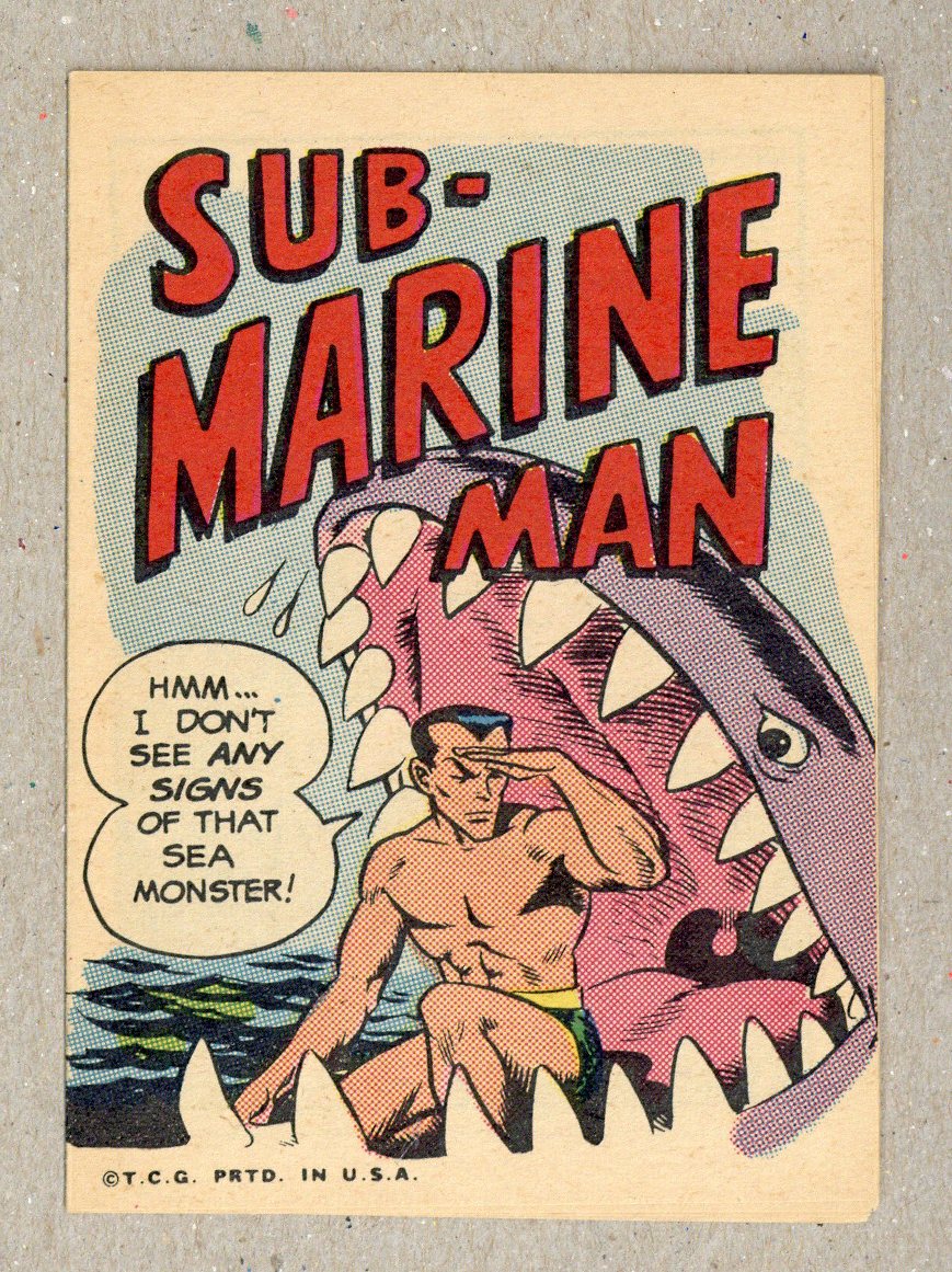 Krazy Little Comics (1967 Topps): Sub-Marine Man is one of sixteen parody mini-comics originally produced as test market items in 1967, by the Topps Chewing Gum Company. They did not see full national distribution. All were written by Roy Thomas and feature Wally Wood cover and interior art. These minis spoof not only Marvel and DC super-heroes, but other comic characters as well, like the Phantom, Prince Valiant, and Tarzan. These possibly predate, or are at least contemporaneous with, Not Brand Ecch! #1 (08/1967), and are among the rarest of the Merry Marvel Marching Society era items. Full color, 2.5-in. x 3.5-in., no cover price. Grade: VF/NM 9.0 explanation of grade Condition: Used (collectible)
