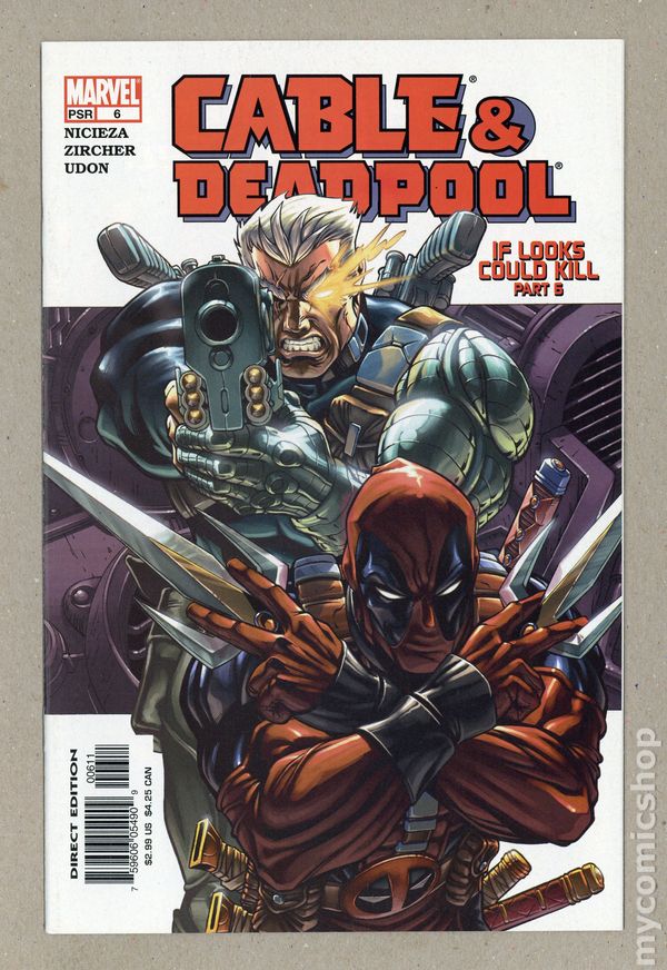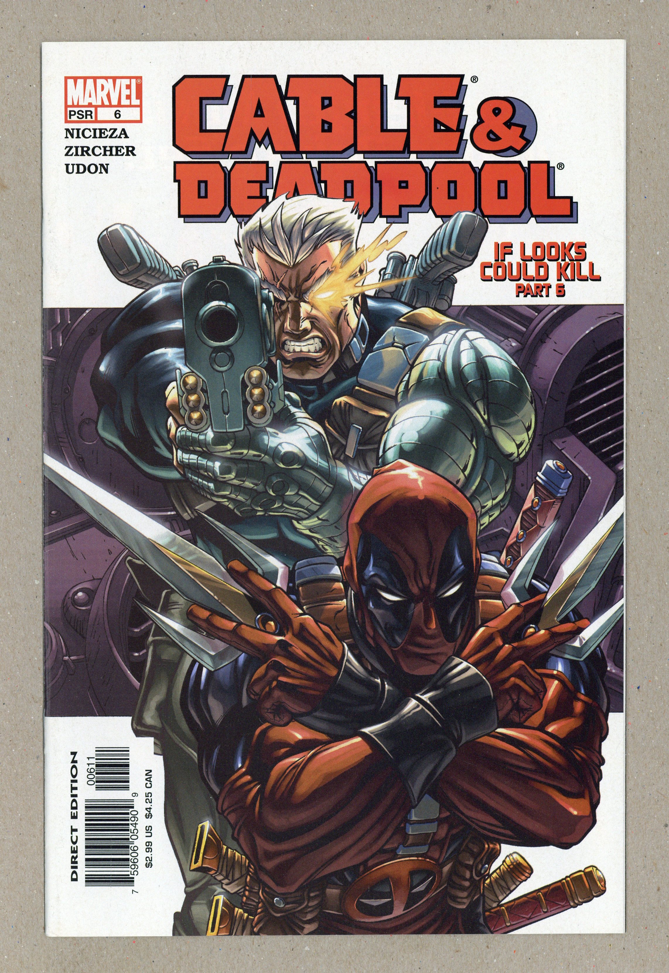 W- Fabian Nicieza, P & Cover- Patrick Zircher "If Looks Could Kill" Part 6 (of 6) If looks could kill, they certainly would! Deadpool has a cold, hard bead on a power-hungry Cable, but Cable has his sights set on much bigger game. Can two grown men with absolutely nothing in common find common ground when it comes to... ruling the planet? 32 pgs. Cover price $2.99. Grade: VF- 7.5 explanation of grade Condition: Used (collectible)
