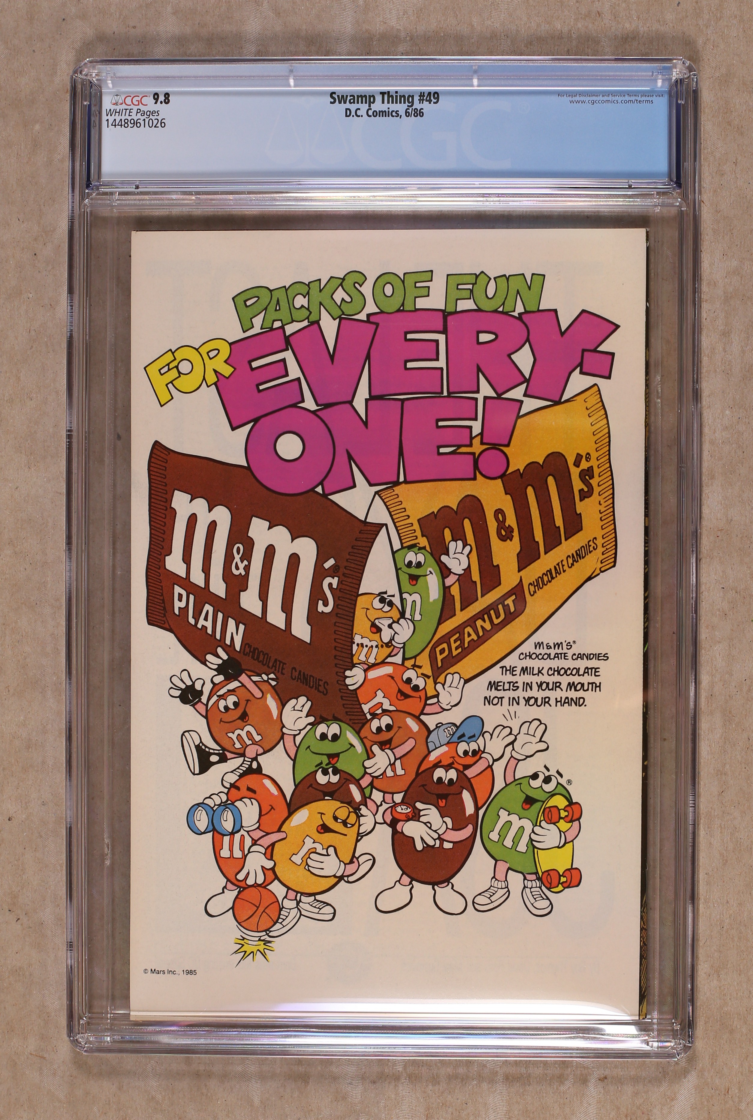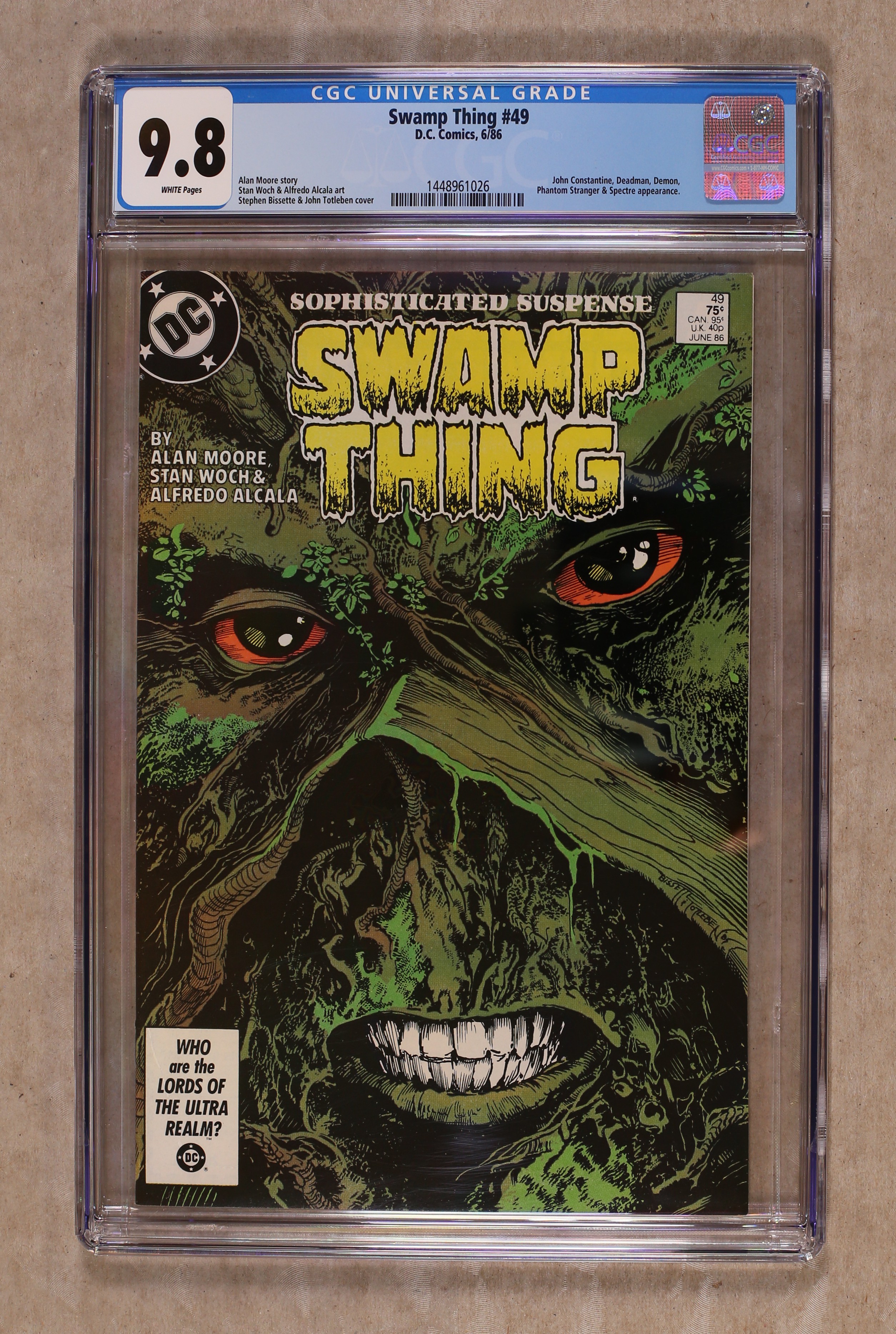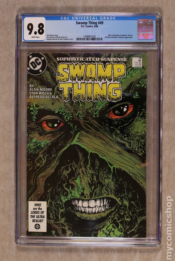 Ended May 6 2020 Winning Bid $115 Direct Edition. In the penultimate chapter of the American Gothic, Swamp Thing gathers forces to battle the monstrous evil that's vanquishing the world! Guest-starring Deadman, John Constantine and more! Written by Alan Moore, with art by Stan Woch and Alfredo Alcala. Cover by Stephen Bissette and John Totleben. Cover price $0.75. Grade: CGC 9.8 explanation of grade Condition: Used (collectible)