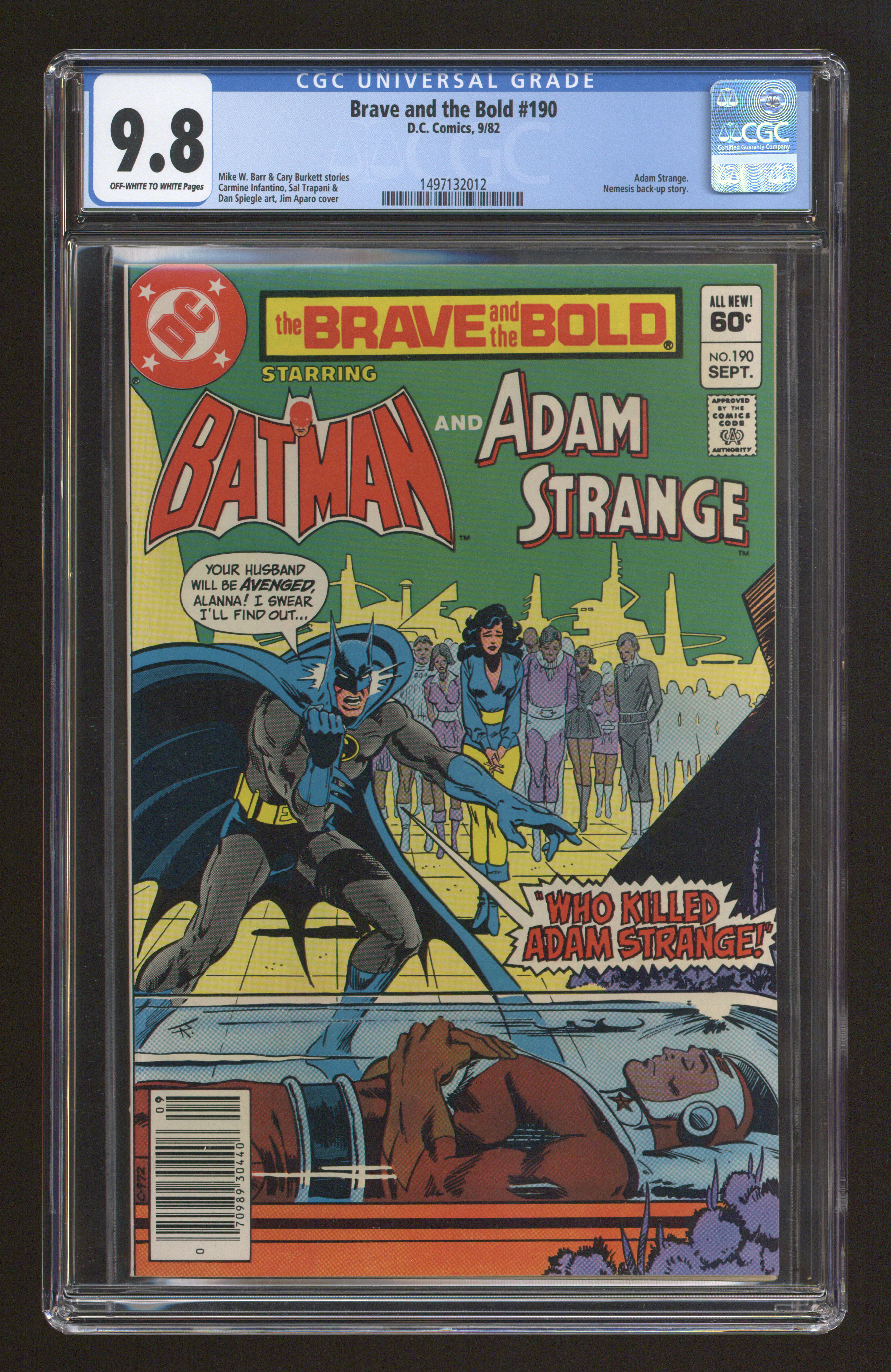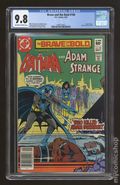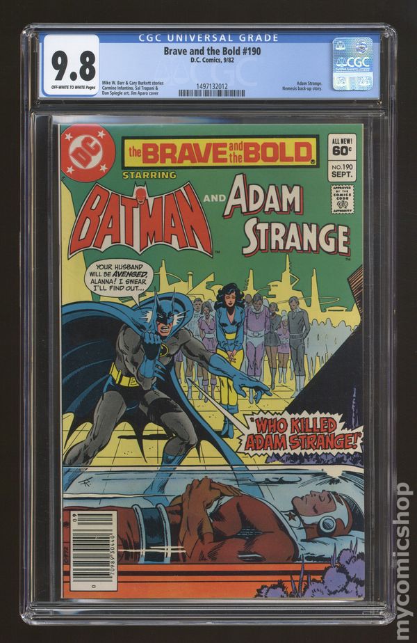 Direct Edition. Cover by Jim Aparo. "Who Killed Adam Strange?", script by Mike Barr, pencils by Carmine Infantino, inks by Sal Trapani; After Adam Strange is mysteriously killed, Sardath and Alanna summon Batman to Rann to help find his killer and fight Kyrri invaders. Back-up story: "Murderer's Proxy!", script by Cary Burkett, art by Dan Spiegle; Nemesis strives to protect a Council employee from being murdered. 36 Pages, Full Color. Cover price $0.60. Grade: CGC 9.8 explanation of grade Condition: Used (collectible)