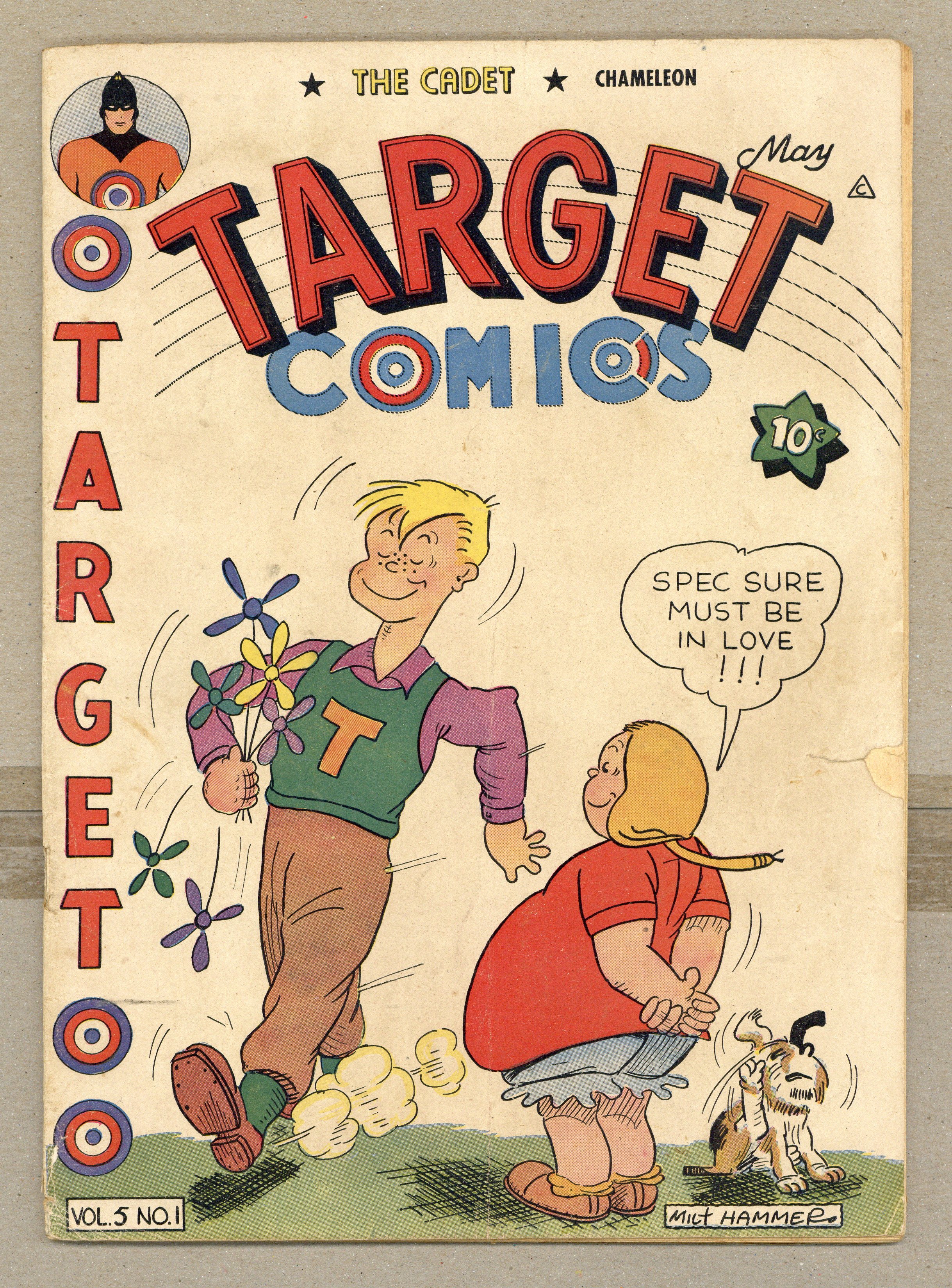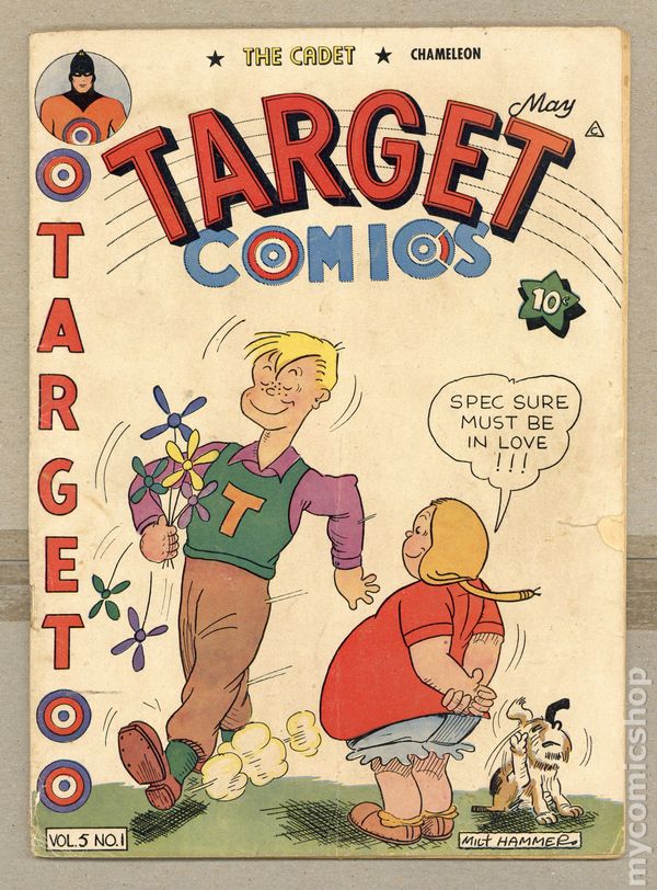 Cover art by Milt Hammer. Cadet story. 18 Men and a Boat (Part 5) story, art by Tom Gill. Candid Charlie story, art by B. Gordon Guth. Target and the Targeteers story, art by Bill Allison. Dan'l Flannel humor story. Two Punctures For Hitler text story. Chameleon story, art by Bill Allison; Chameleon receives a message from Berlin. Speck, Spot, and Sis story, script and art by Milt Hammer. 52 pgs. $0.10. Cover price $0.10. Grade: GD+ 2.5 explanation of grade Condition: Used (collectible)