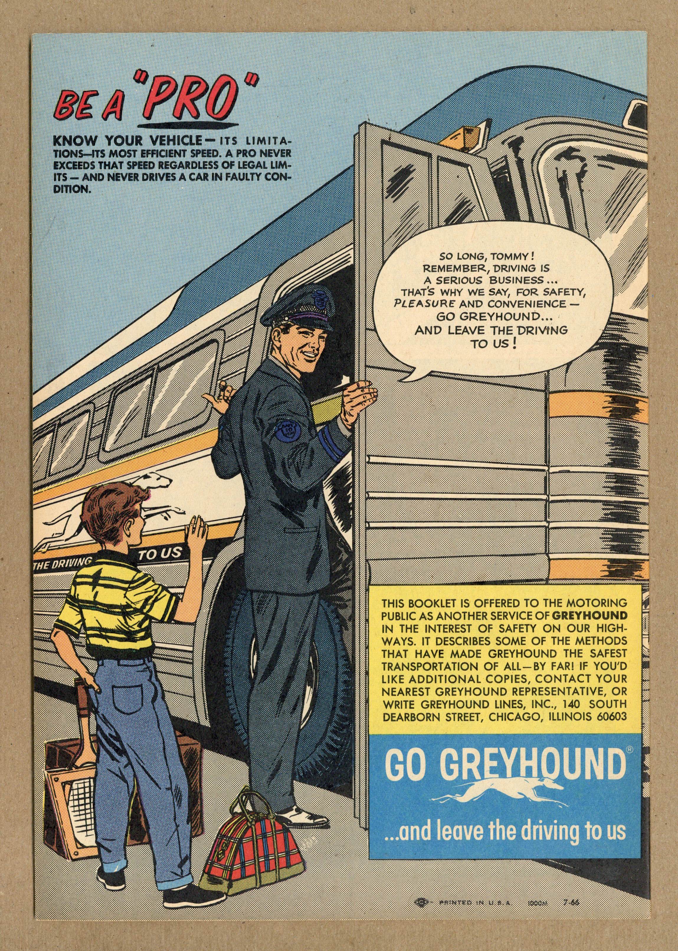 Promotional comic, as young Tommy learns about the drawbacks of driving in urban traffic and the advantages of public transit, specifically Greyhound buses. Includes many safe-driving tips, such as keeping ones eyes on the road. Included in Paul Gravetts 2008 book The Worlds Weirdest Comic Books. 16 pages, full color, 7-in. x 10-in., newsprint, with no cover price. Grade: VF+ 8.5 explanation of grade Condition: Used (collectible)