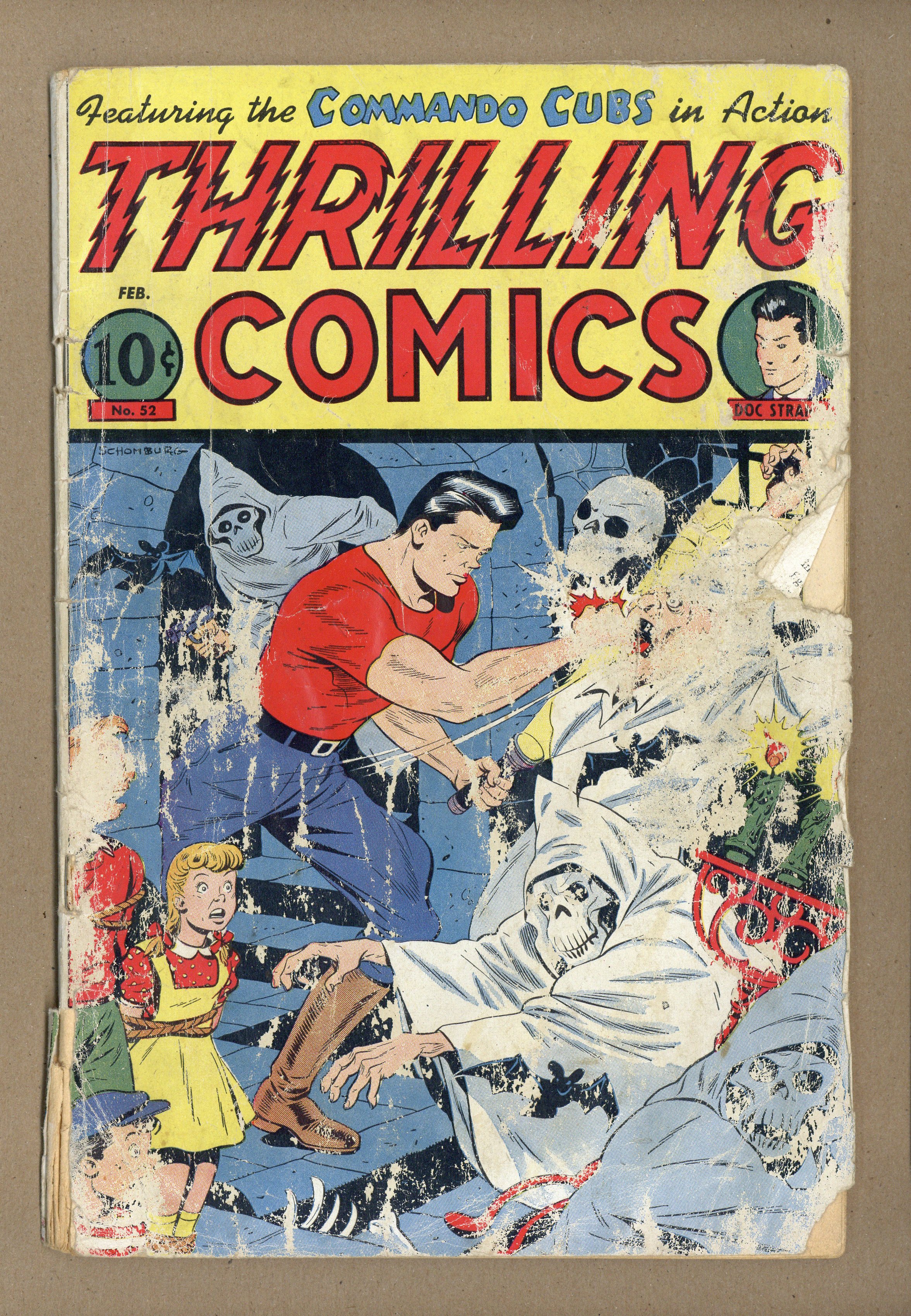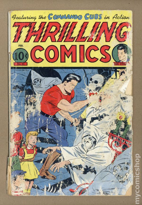 Cover by Alex Schomburg. Edited by Ned Pines. Stories by Ken Battefield, August Froehlich, Leo Morey, Al Camy, Buck Chilton, Richard Hughes, and Bob Oksner. Chock full of action and adventure, these are Thrilling Comics! 52 pgs. $0.10. Cover price $0.10. Grade: PR 0.5 explanation of grade Condition: Used (collectible)