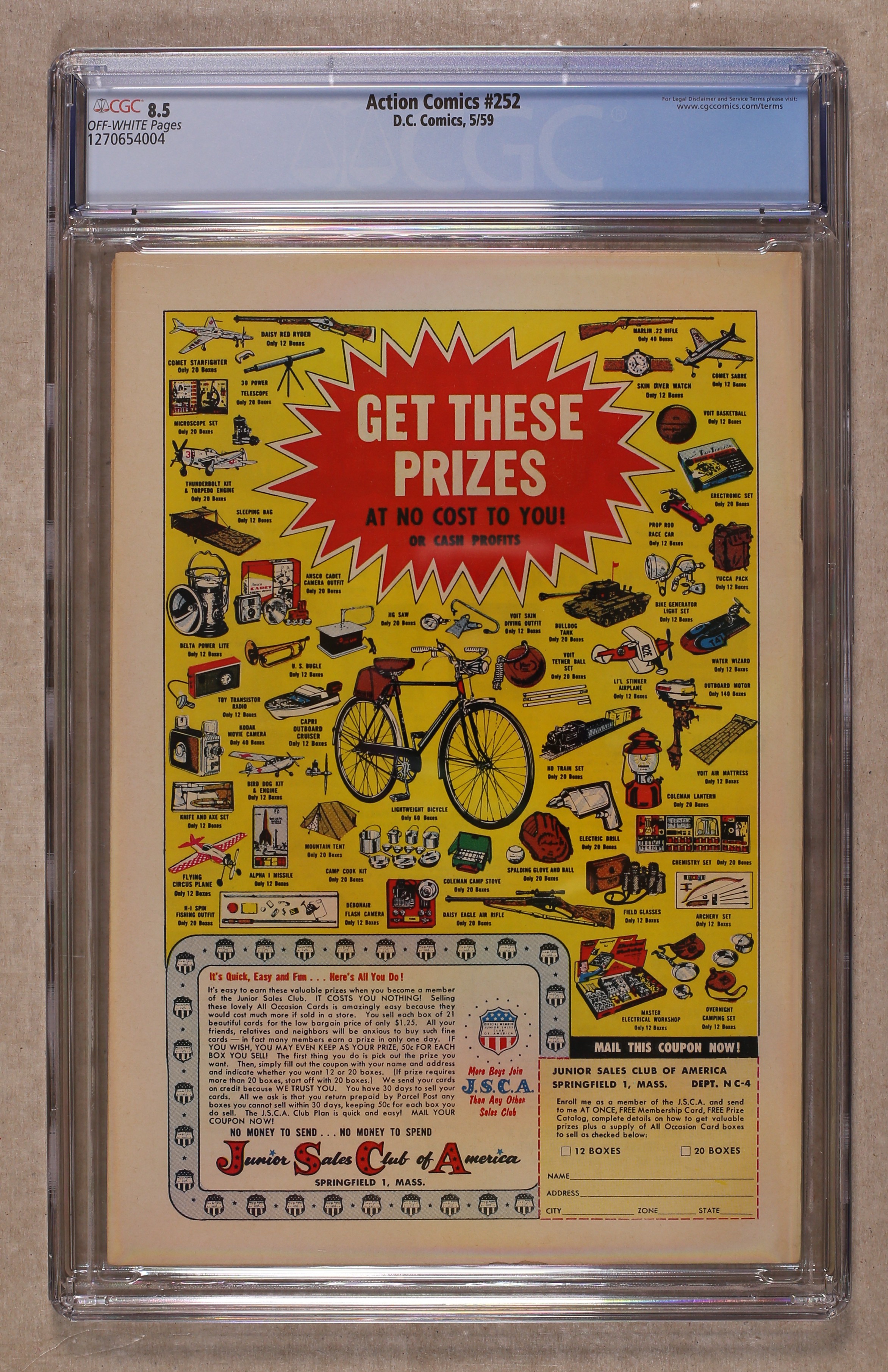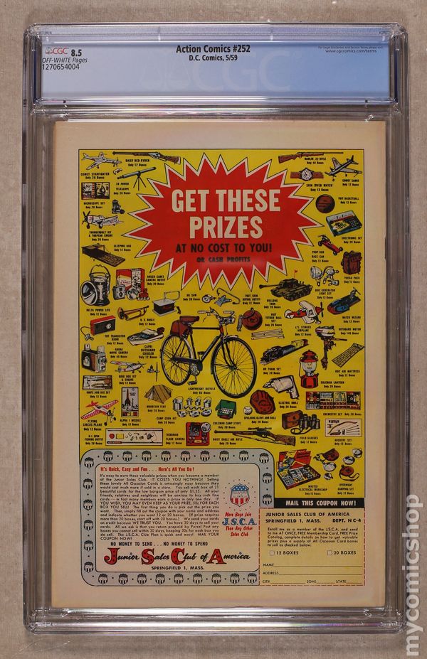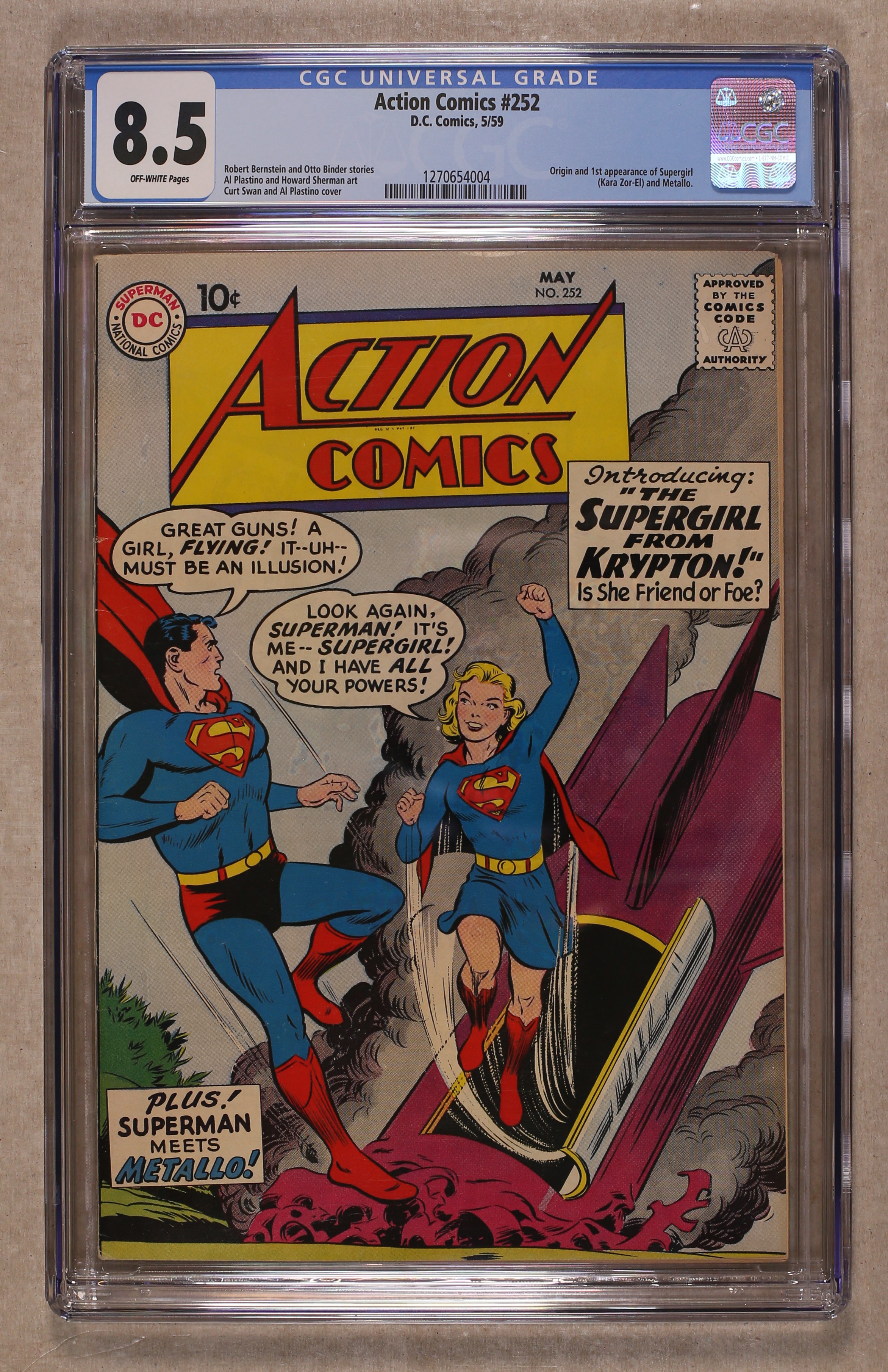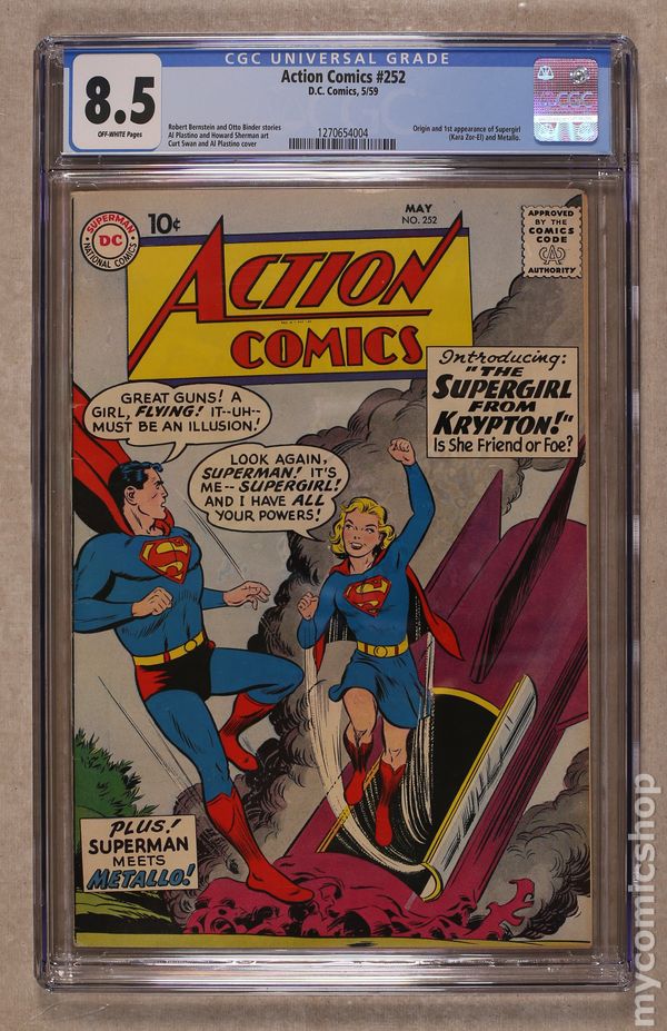 Cover pencils by Curt Swan, inks by Al Plastino. Origin and 1st appearance of Supergirl in "The Supergirl from Krypton!", script by Otto Binder, art by Al Plastino; Superman spies a crashing rocket and discovers his cousin Supergirl; She tells him how Argo City survived the destruction of Krypton and how her father sent her to Earth when the inhabitants of Argo City were threatened by Kryptonite poisoning; Superman sets her up in Midvale Orphanage so she can adjust to life on Earth. Intro new Metallo "The Menace of Metallo!", script by Robert Bernstein, art by Al Plastino; Criminal John Corben, who is nearly killed in an auto accident, is given a robot body powered by uranium; When he is hit by bullets meant for Lois, she assumes he is really Superman. 2/3-page Little Pete story by Henry Boltinoff. "Congo Bill Dies at Dawn!", script by Robert Bernstein, art by Howard Sherman. 36 Pages, Full Color. $.10 Cover price $0.10. Grade: CGC 8.5 explanation of grade Condition: Used (collectible)