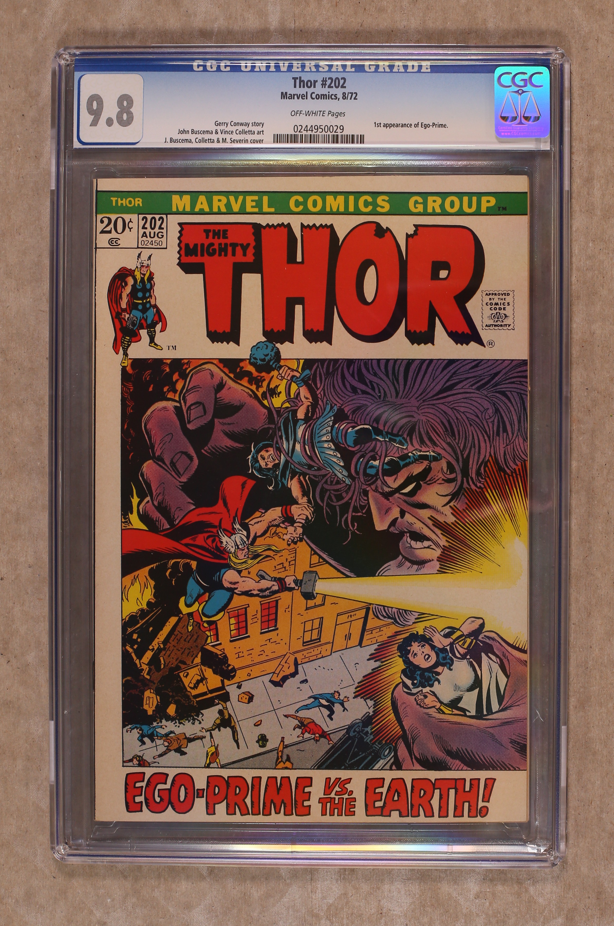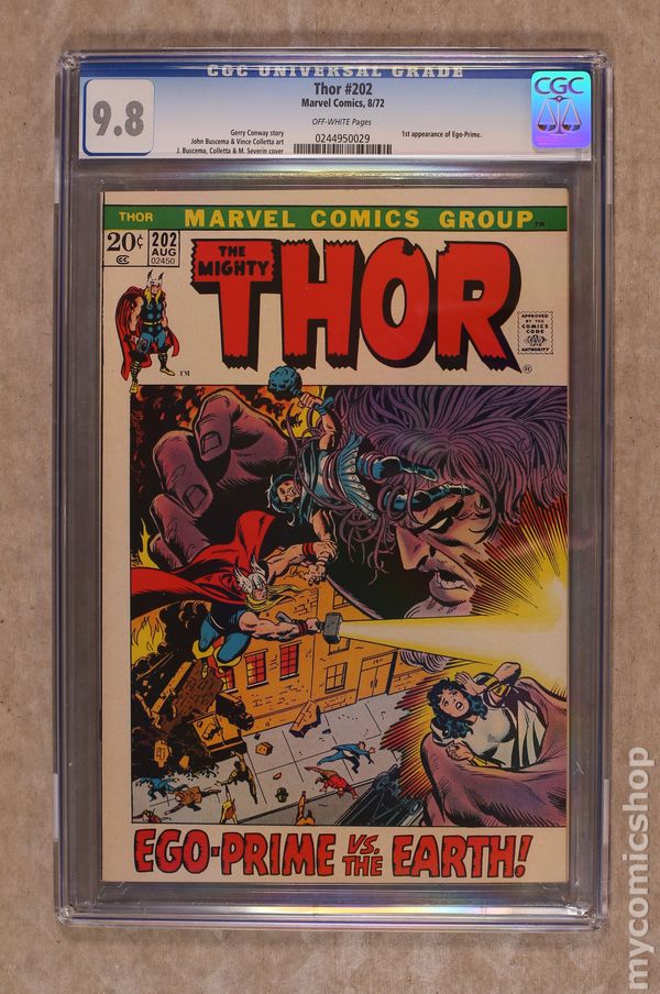 Ended May 6 2020 Winning Bid $204 Cover pencils by John Buscema, John Romita (alterations), and Marie Severin (alterations), inks by John Romita (alterations) and Marie Severin (alterations). "And None Dare Stand 'Gainst Ego-Prime!", script by Gerry Conway, pencils by John Buscema, inks by Vince Colletta; Ego-Prime has come to Earth, and not all the Asgardian's power can stop him; Meanwhile, Heimdall finds one of the people in his quest - Jackson Kimbal. Appearances by Sif, Hogun, Fandral, Volstagg, Karnilla, Hildegarde, Heimdall, and Odin. 36 pgs., full color. $0.20. Cover price $0.20. Grade: CGC 9.8 explanation of grade Condition: Used (collectible)