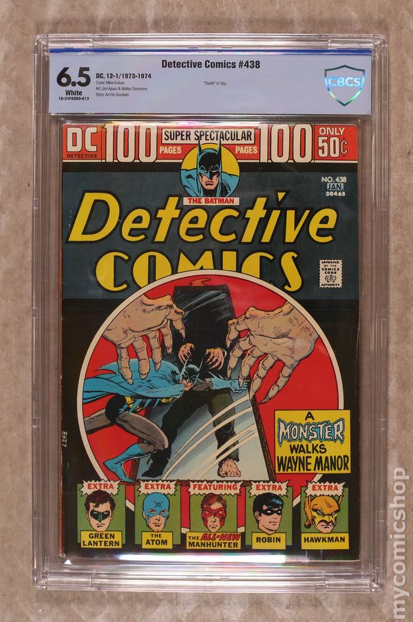 Ended Oct 15 2019 Winning Bid $43 100 Page Super Spectacular issues begin. Cover by Mike Kaluta. "A Monster Walks Wayne Manor!", script by Archie Goodwin, art by Jim Aparo; Batman tries to learn the identity of a monster which is stalking the old Wayne mansion, and who has injured Alfred. "World of the Magic Atom!", script by Gardner Fox, pencils by Gil Kane, inks by Sid Greene; reprinted from Atom #19; Biff Barker and his gang are scoping out the security of the Ivy Town National Trust Bank, wondering how they are ever going to break through its security; Much to their surprise, when Biff rests his hand on the front door, his hand somehow passes right through it; featuring Zatanna. "The Men Who Moved the World!" starring Hawkman, script by Gardner Fox, art by Joe Kubert; reprinted from Brave and the Bold #44. "Gotham Gang Line-Up!" starring Batman and Robin, script by Bill Finger, pencils by Sheldon Moldoff (ghosting for Bob Kane), inks by Joe Giella, reprinted from Detective Comics #328. 1972 Shazam Awards: Behind the Scenes at the DC Comic World article, art by Ross Andru and Bernie Wrightson. "Chapter Two, The Manhunter File," script by Archie Goodwin, art by Walter Simonson. Letter to the editor from comics writer Bob Rozakis. 100 pgs., full color. $0.50. Cover price $0.50. Grade: CBCS 6.5 explanation of grade Condition: Used (collectible)
