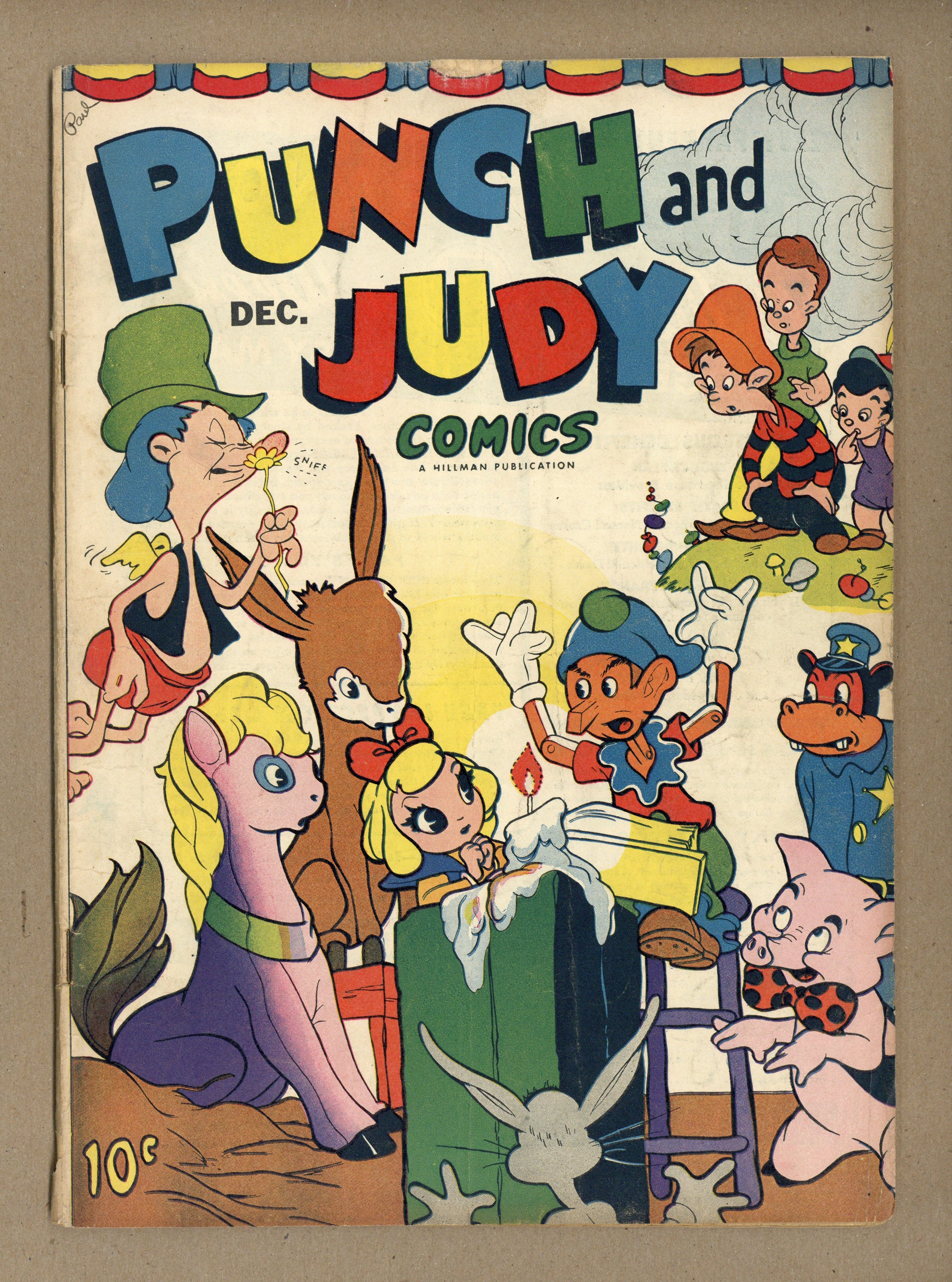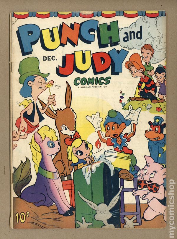 Cover by Orestes Calpini. Stories and art by Tom Golden, Orestes Calpini and Tony DiPreta. Kids' comics from Hillman, featuring mischievous puppet Punch and his human friend Judy. Punch gets jealous when Uncle Tony the toymaker makes Blockhead the Bank, and wants some money for himself. When Fatsy complains that the kids are too little to play with, Mr. Moonbeam makes Fido into a gigantic monster. The Circus Witch forces Starry Eyes to give up her pony Pinkie, but the gang has a plan to get him back. Punch and Judy; Fatsy McPig; Captain Codfish; Buttons the Rabbit; Punch Meets Old Iron-Head; Little Horse Feathers; Starry Eyes. 48 pages, Full Color. Cover price $0.10. Grade: FR/GD 1.5 explanation of grade Condition: Used (collectible)