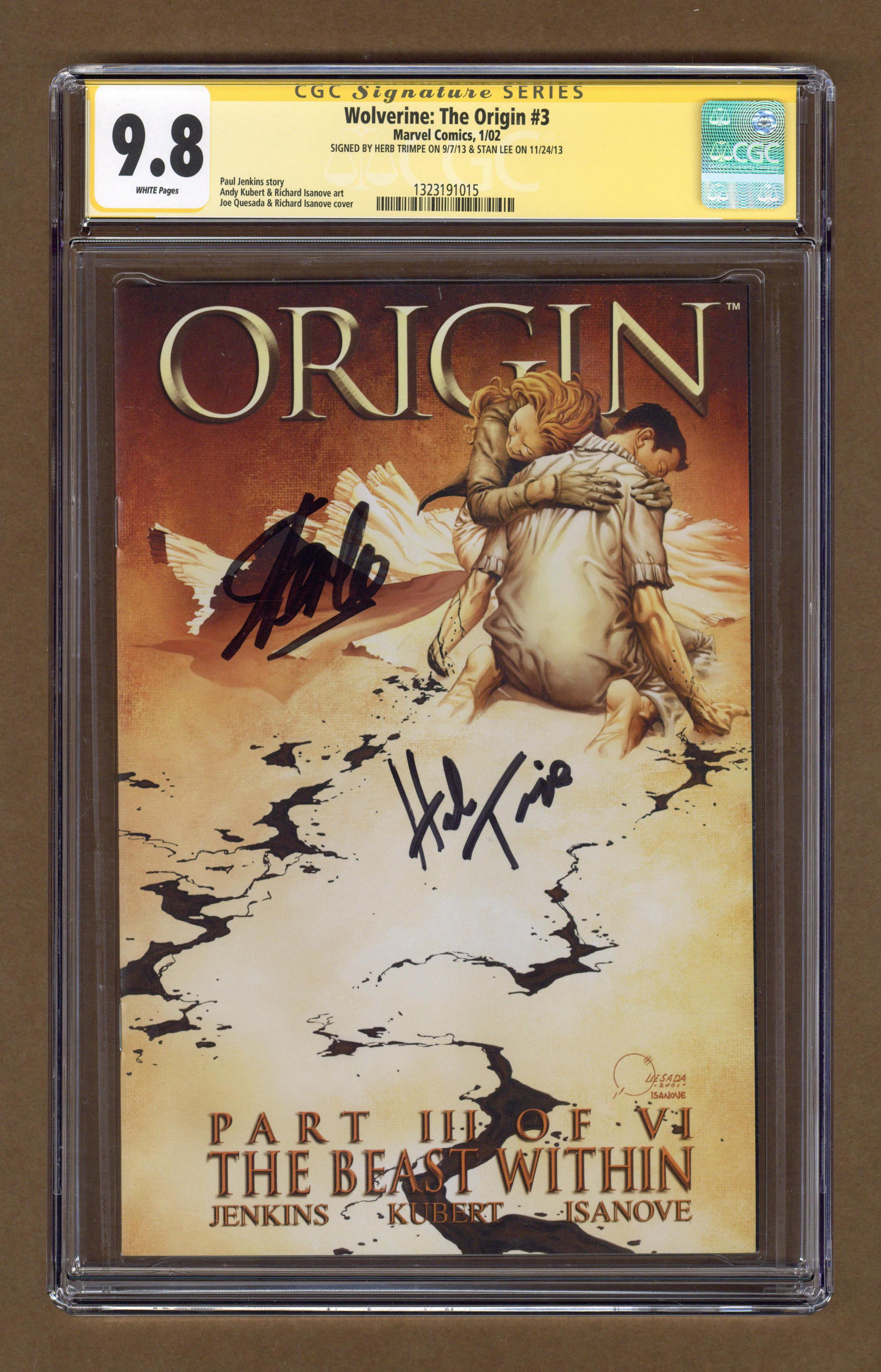 cover by joe quesada paul jenkins/andy kubert ? THE SCOOP: This origin you've all been waiting for continues! ? THE STORY: Wolverine's tale takes on an added dimension as new details are revealed about the mysterious man named Logan! What new secrets will be revealed in this issue? Everyone is going to be talking about the revelations made in this amazing series -- and this issue's secret could be the one to top them all! ? THE CREATORS: No one examines the psyche like Paul Jenkins (PETER PARKER: SPIDER-MAN, INHUMANS, SENTRY, etc.), so we've teamed him up with master X-Men artist Andy Kubert (ULTIMATE X-MEN)! We even got our own EIC, Joe Quesada, to draw the covers! ? THE FORMAT: Each chapter of this six-issue series will be 32 pages, with ads -- printed on glossy stock paper with a cardstock cover. 7-59606-05155-7-00311 (MarvelPG) 3.50 Cover price $3.50. Grade: CGC 9.8 explanation of grade Condition: Used (collectible)