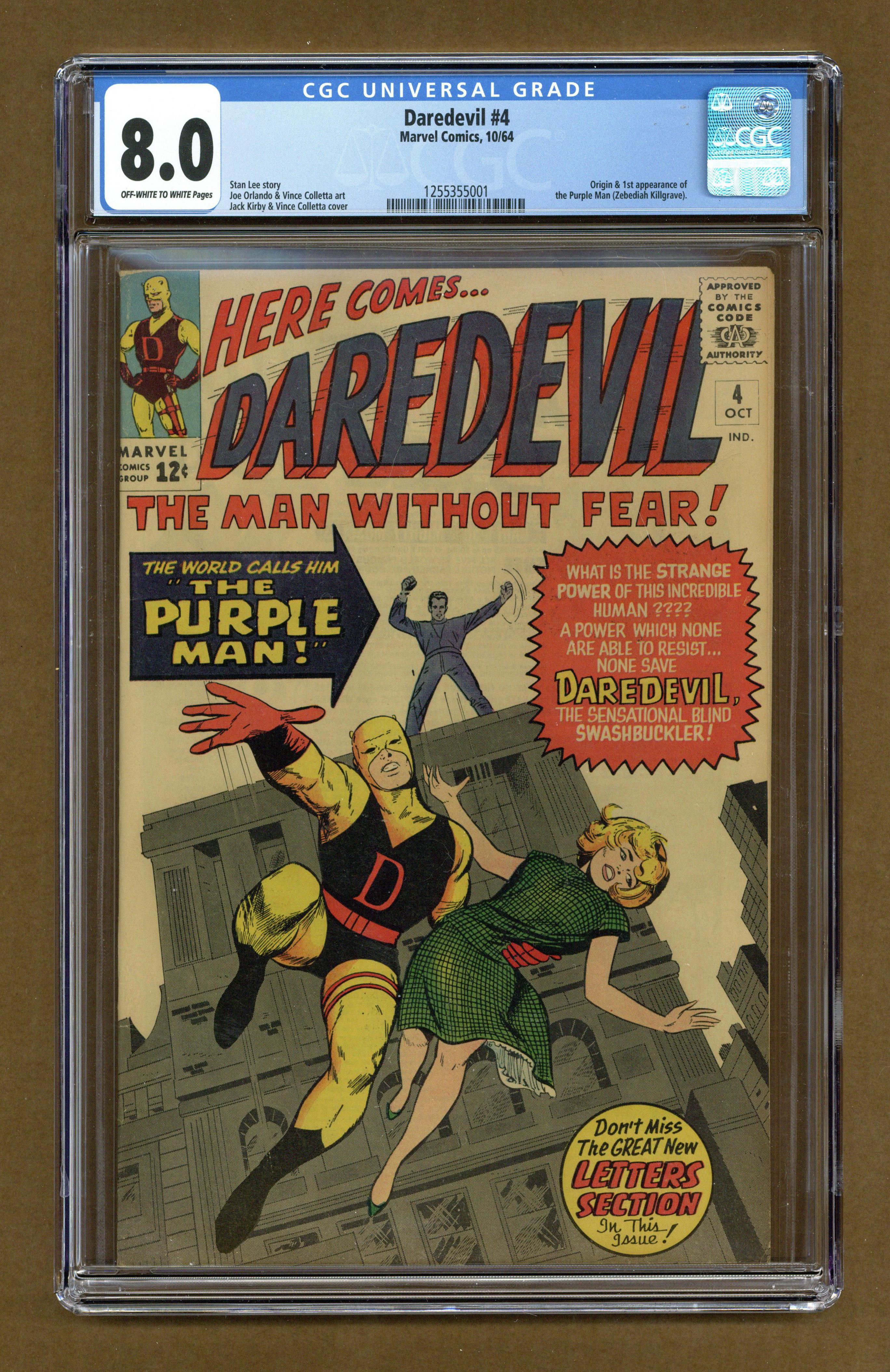 Ended Oct 30 2019 Winning Bid $415 Cover pencils by Jack Kirby, inks by Vince Colletta. First appearance of the Purple Man in Killgrave, the Unbelievable Purple Man!, script by Stan Lee, pencils by Joe Orlando, inks by Vince Colletta; DD runs up against a purple man who can make anyone do what he wants just by suggesting it. First letters page. 36 pgs. Cover price $0.12. Cover price $0.12. Grade: CGC 8.0 explanation of grade Condition: Used (collectible)