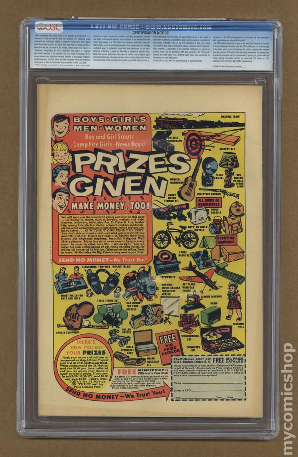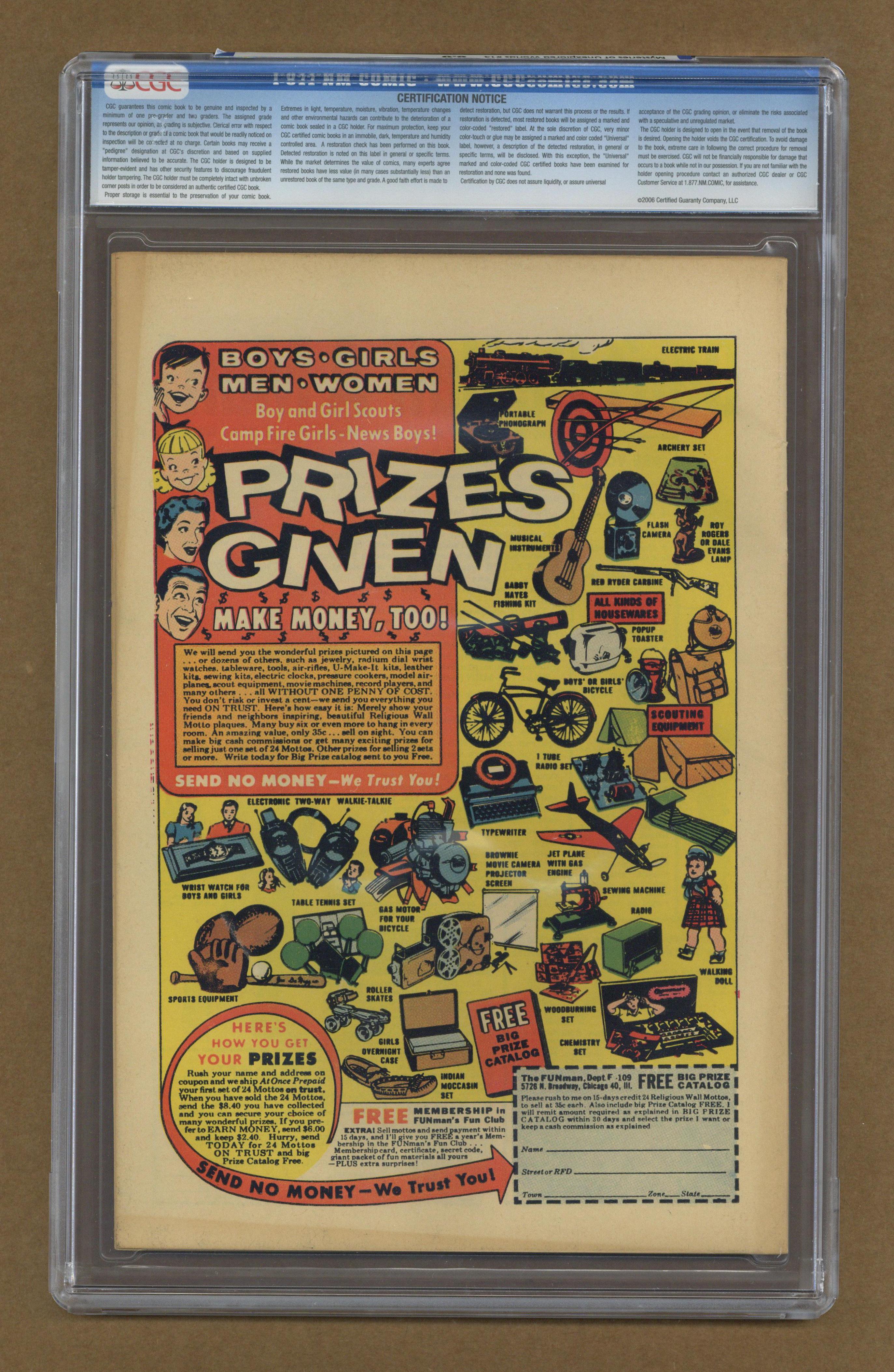 Ended May 5 2020 Winning Bid $170 Cover by Charles Nicholas and Vince Alascia. Stories and art by Matt Baker, Vince Colletta, Bill Molno, Charles Nicholas, Vince Alascia, and Sal Trapani. Charlton's popular series features tales of science fiction and fantasy with twist endings. A mysterious gas from outer space causes all humanity to lose the ability to lie. A volunteer for a science experiment learns that Professor Harver has figured out how to reverse gravity, in a story with art by good-girl art legend Matt Baker. Jason has two hours to live, but all he can think of is his wife. An Air of Honesty; No. 9 Swanson St.; The Strange Place; Two Hours; The Nobody. 32 pages, Full Color. Cover price $0.10. Grade: CGC 8.0 explanation of grade Condition: Used (collectible)