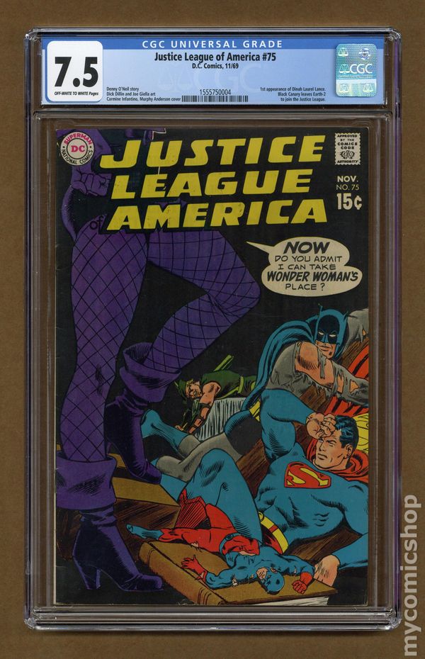Ended Oct 23 2019 Winning Bid $141 2nd appearance new Green Arrow costume (see Brave and the Bold 85 for the first). Cover pencils by Carmine Infantino, inks by Murphy Anderson. In Each Man There Is a Demon, script by Denny O'Neil, pencils by Dick Dillin, inks by Joe Giella; Black Canary joins the JLA after traveling to Earth 1 from Earth 2; The JLA must battle evil versions of themselves, and Black Canary discovers she's gained the power of a sonic scream as a result of crossing over to Earth-1. Letters to the editor from comics writers Alan Brennert and Martin Pasko. 36 pgs. $0.15. Cover price $0.15. Grade: CGC 7.5 explanation of grade Condition: Used (collectible)