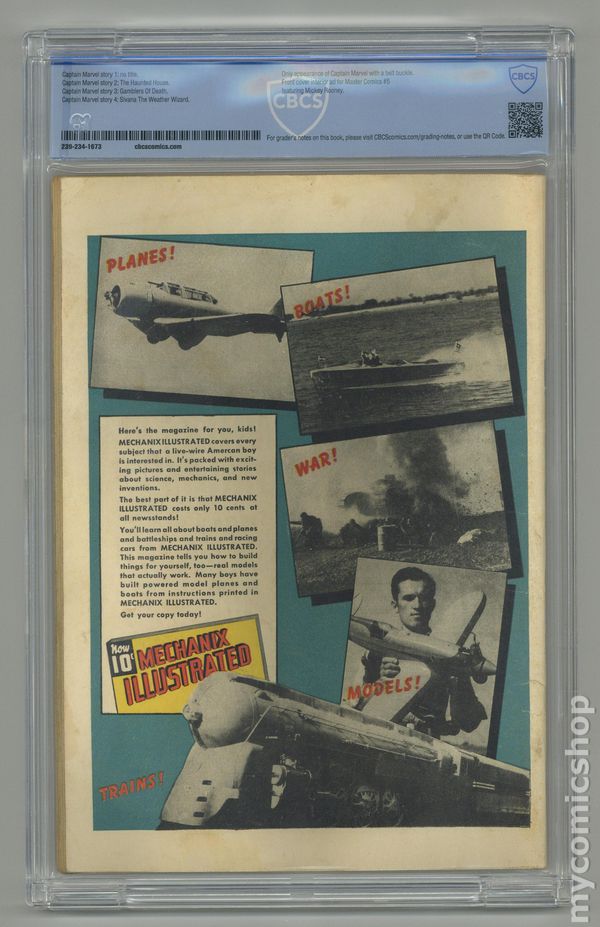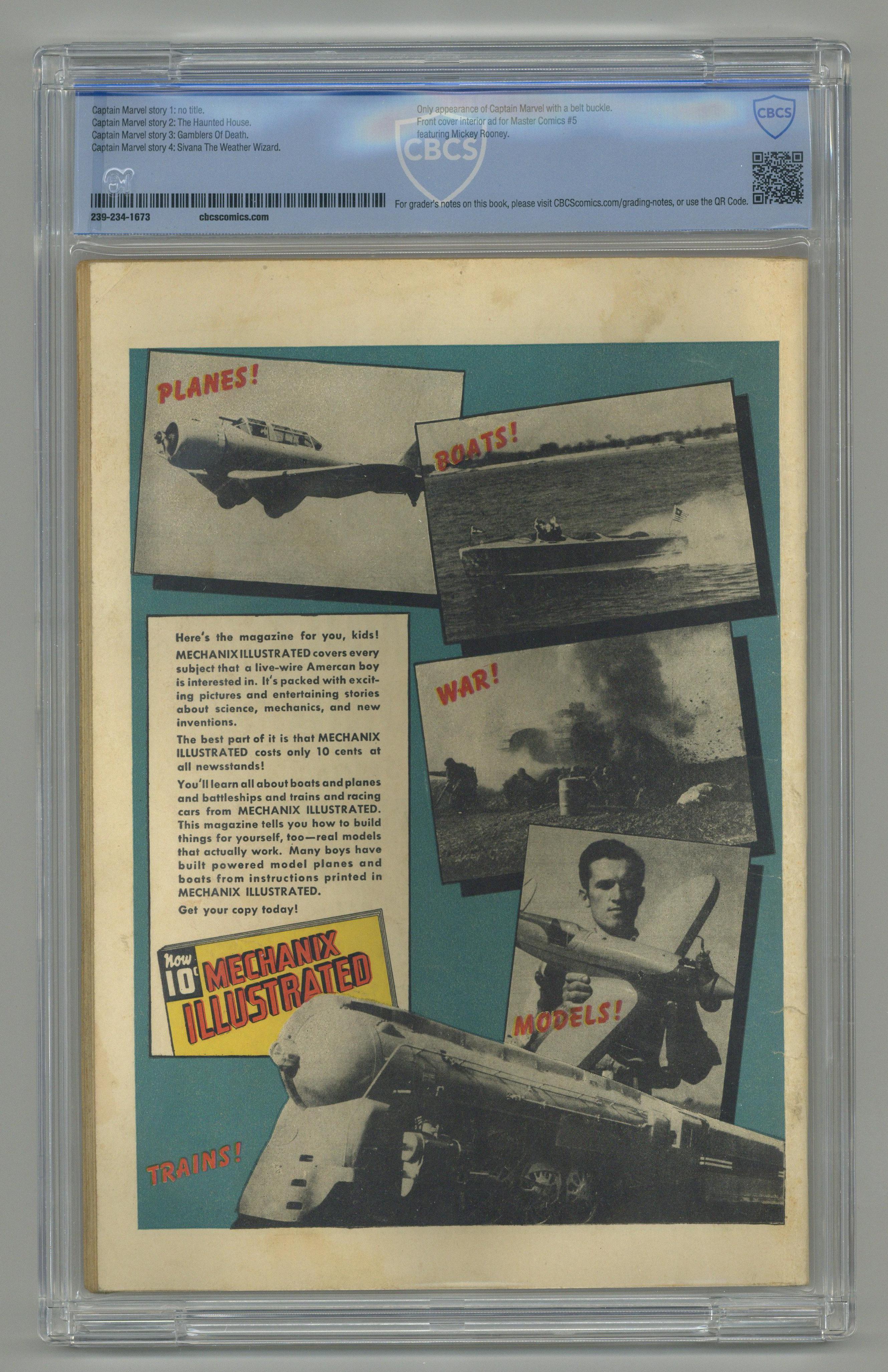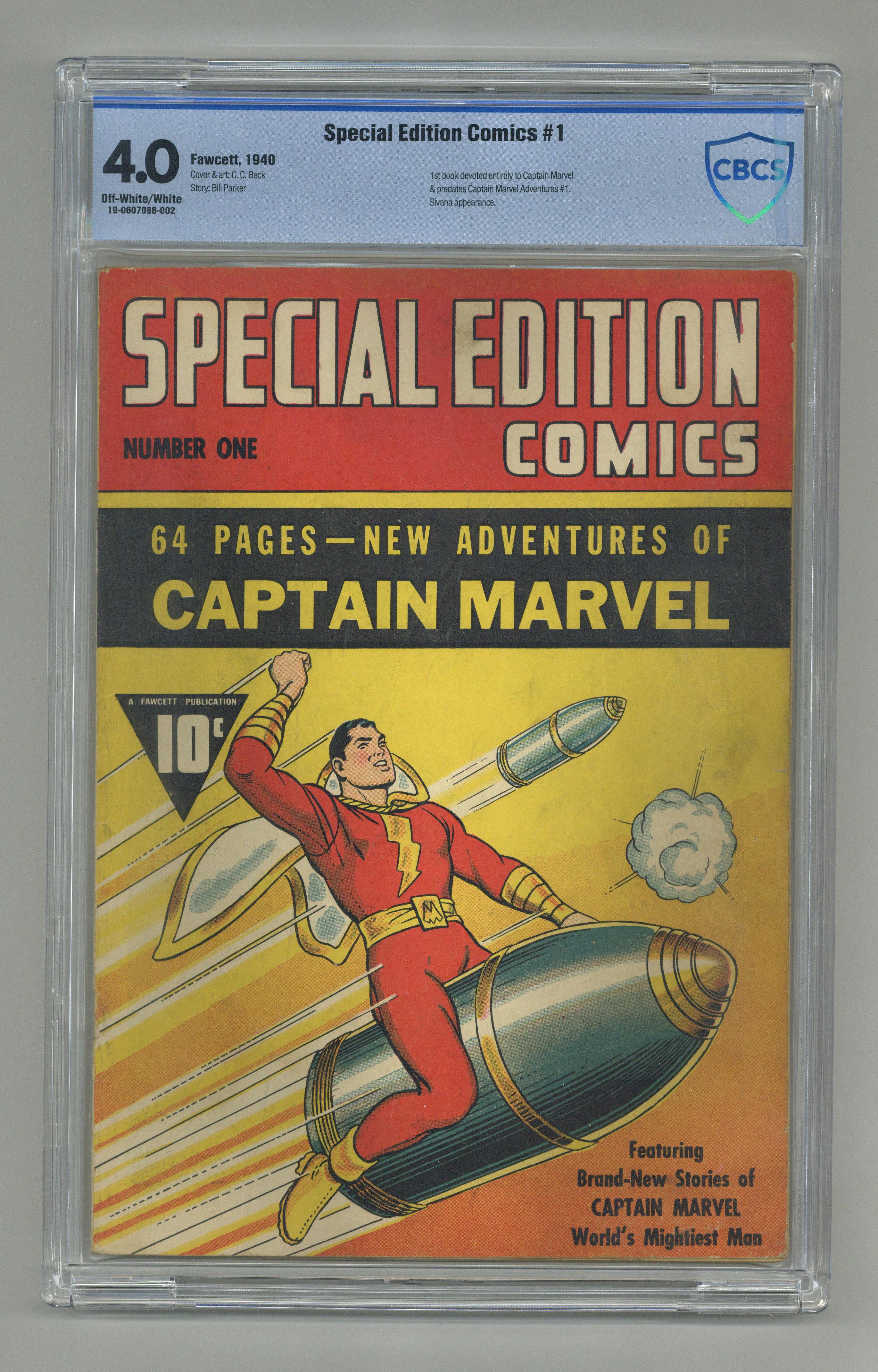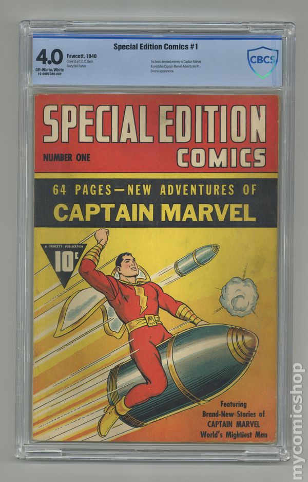 Ended Jul 10 2019 Winning Bid $2,325 Special Edition Comics #1, published in 1940 by Fawcett Publications, was the only issue of the title. It appeared on the newsstands several months before Captain Marvel Adventures #1, and at the same time Whiz #8 was released. Note the costume of Captain Marvel shown on the cover. In this early version, he has a buckle on his sash with the initial M, does not have a buttoned shirt flap, and his arm bands are a bit different. Cover art by C. C. Beck. Untitled story, script by Bill Parker, art by C. C. Beck; Billy is stunned, like the rest of the crowd, when the challenger in the heavy weight boxing match knocks out the champion with one punch; Trying to get an interview, Billy learns the truth behind what happened and is captured by a giant ape who is actually Dr. Allirog, who works for Slaughter Slade. "The Haunted House," script by Bill Parker, pencils, pencils by C. C. Beck, inks by C. C. Beck and Pete Costanza (backgrounds); In 1890, a recluse millionaire, with his dying breath, informs his servant that no one is to enter this house after his death; Anyone doing so will fall under the dying man's curse that will follow them to their grave. "Gamblers of Death," script by Bill Parker, pencils by C. C. Beck, inks by Pete Costanza; Risking death, Billy investigates a phantom gambling ring which uses men's lives as chips in a fantastic game of murder for money. "Sivana the Weather Wizard," script by Bill Parker, art by C. C. Beck; Billy seeks to learn why there has been ten times as much damage by tornado, earthquake, hail storms, and floods than the previous. 68 pgs., full color. Cover price $0.10. Grade: CBCS 4.0 explanation of grade Condition: Used (collectible)