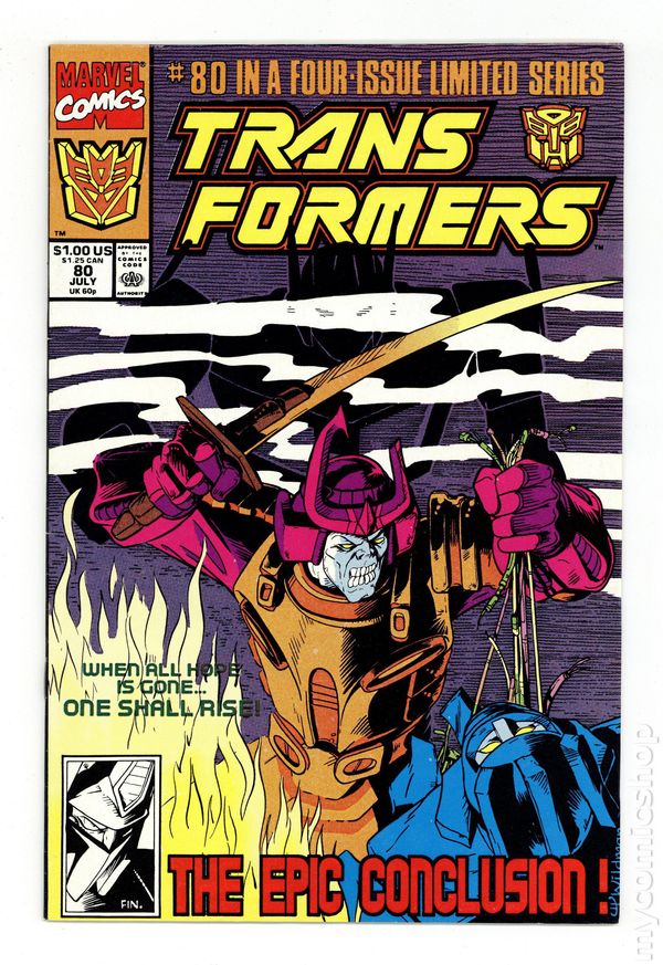 Direct Edition. Cover pencils by Andrew Wildman, inks by Stephen Baskerville. "End of The Road!", script by Simon Furman, pencils by Andrew Wildman, inks by Stephen Baskerville; The Autobots have lost on Klo to the Decepticons; All hope seems to be lost until Optimus Prime is reborn by the Last Autobot using Hi-Q (with Prime's memories) as the template; The defeated Decepticons then leave Klo, but plot other plans against the Autobots. 36 pgs., full color. Cover price $1.00. Grade: FN+ 6.5 explanation of grade Condition: Used (collectible)