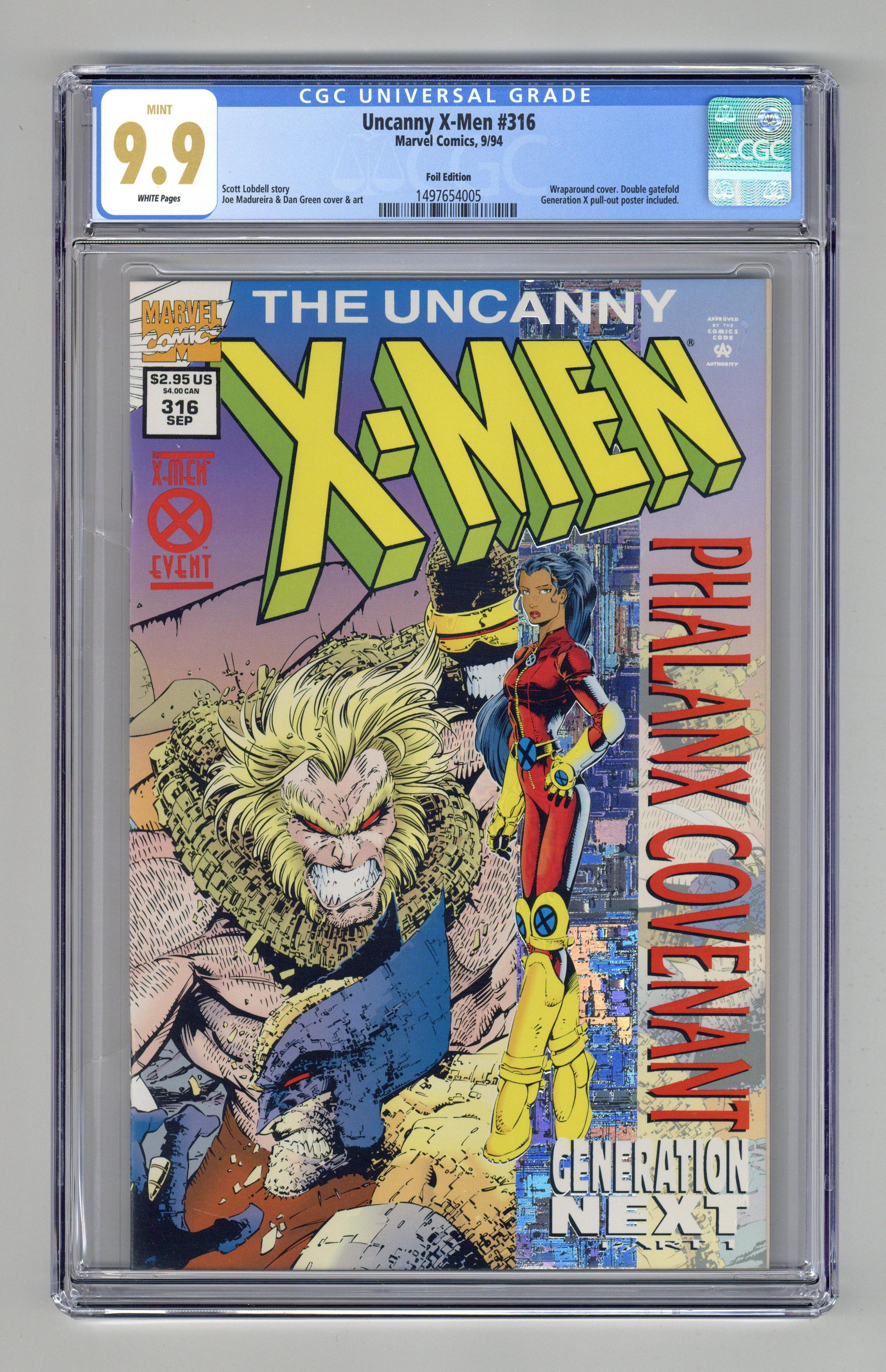 Holofoil Edition. Direct Edition. Holofoil enhanced cardstock cover. Gatefold center-bound Generation X promo. Cover by Joe Madureira and Dan Green. Phalanx Covenant: Generation Next part 1: "Encounter," script by Scott Lobdell, pencils by Joe Madureira, inks by Terry Austin and Dan Green; The Phalanx captures M; Banshee finds X-Mansion crawling with the Phalanx impersonating X-Men, and he turns to Sabretooth for help. The story continues in X-Men 36. Generation X promo bound in. $2.95. 44 pgs. Cover price $2.95. Grade: CGC 9.9 explanation of grade Condition: Used (collectible)