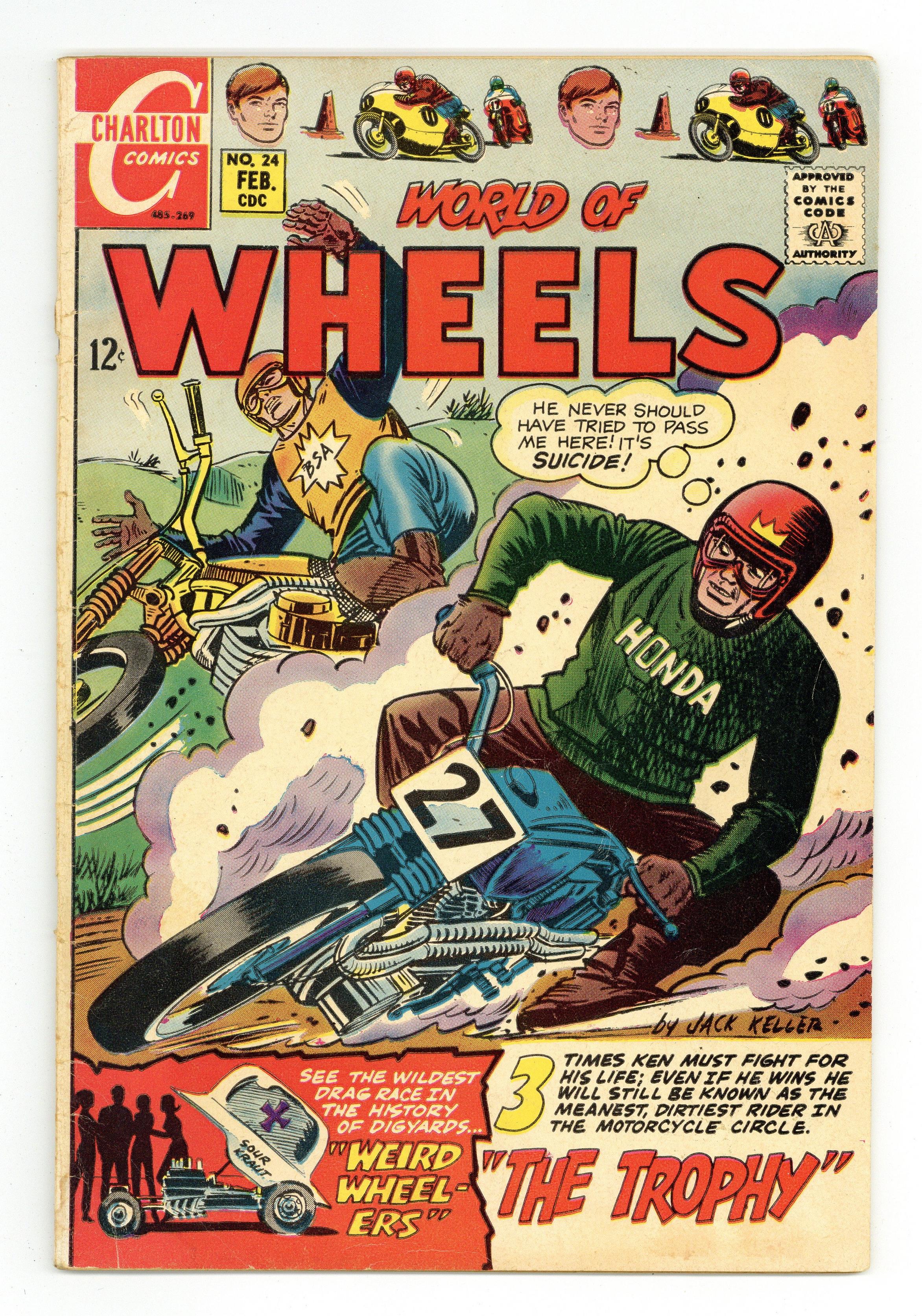 Published Feb 1969 by Charlton Comics Group.$6.60Edited by Sal Gentile. Cover by Jack Keller. Stories by Jack Keller, Charles Nicholas, and Vince Alascia. High speed tales of racing, including the adventures of teenage stunt cyclist Ken King. 36 pages, full color. $0.12. Cover price $0.12. Grade: VG+ 4.5 explanation of grade Condition: Used (collectible)