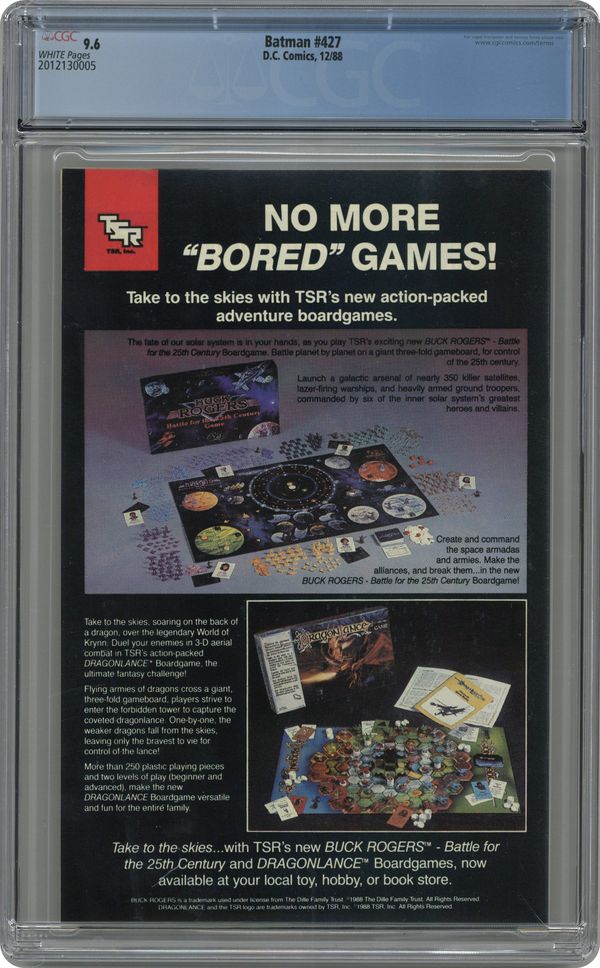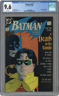 Ended Jan 14 2020 Winning Bid $51 First printing. Direct Edition. Cover art by Mike Mignola. "A Death in the Family" part 2 of 4, script by Jim Starlin, pencils by Jim Aparo, inks by Mike DeCarlo; Jason meets his real mother, Sheila Haywood, but she turns out to be working for the Joker and allows her son to fall into his deadly hands inside of a warehouse; Joker beats Robin with a crowbar and leaves him for dead as a badly beaten Robin attempts to save his mom and himself from the dynamite left behind by the Joker as he leaves them both to a horrible fate; Batman watches in horror as the warehouse containing Jason and Sheila blows up, too late to stop the Joker. Infamous Phone Poll on death or life for Robin (Jason Todd). The Direct Sales copies of this comic, released first, contained a 1-800 phone number to either vote "for" or "against" the death of Jason Todd on the inside back cover. The newsstand copies, released 3 weeks later did not contain the 1-800 number. NOTE: Most issues from 397-432 were reprinted in 1989 and sold in multipacks. These 2nd and 3rd prints have back cover ads dated 1989. 52 Pages, Full Color. Cover price $1.50. Grade: CGC 9.6 explanation of grade Condition: Used (collectible)