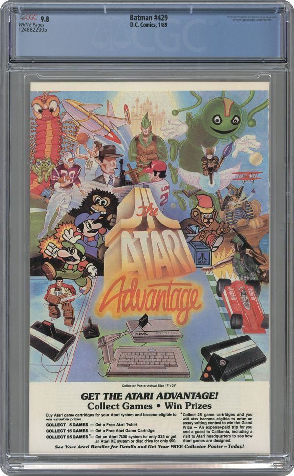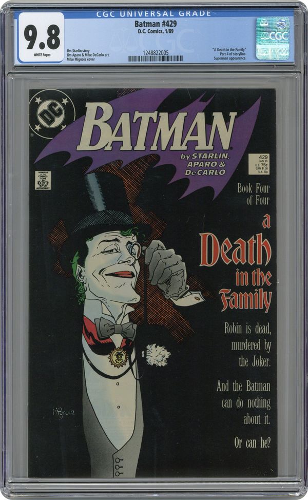 Ended Jan 14 2020 Winning Bid $96 First printing. Direct Edition. Cover art by Mike Mignola. "A Death in the Family" part 4 of 4, script by Jim Starlin, pencils by Jim Aparo, inks by Mike DeCarlo; Batman and Superman talk to CIA agent Ralph Bundy about the Joker's diplomatic status; The agent tries to get Batman to leave the Joker alone; Batman goes to the Joker's hotel room; The Joker confirms that he killed Jason; The Joker pulls a gun, but Batman is already gone; At the UN the Joker tries to poison the audience; Fortunately, Superman sucks up all the poison and flies out of the room to release it; The Joker activates bombs; Batman pursues him. NOTE: Most issues from 397-432 were reprinted in 1989 and sold in multipacks. These 2nd and 3rd prints have back cover ads dated 1989. 36 Pages, Full Color. Cover price $0.75. Grade: CGC 9.8 explanation of grade Condition: Used (collectible)