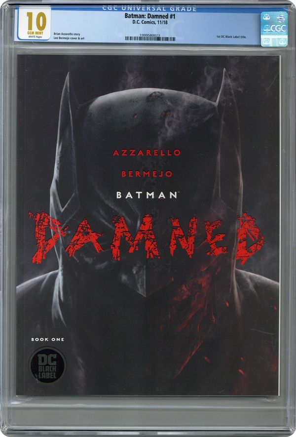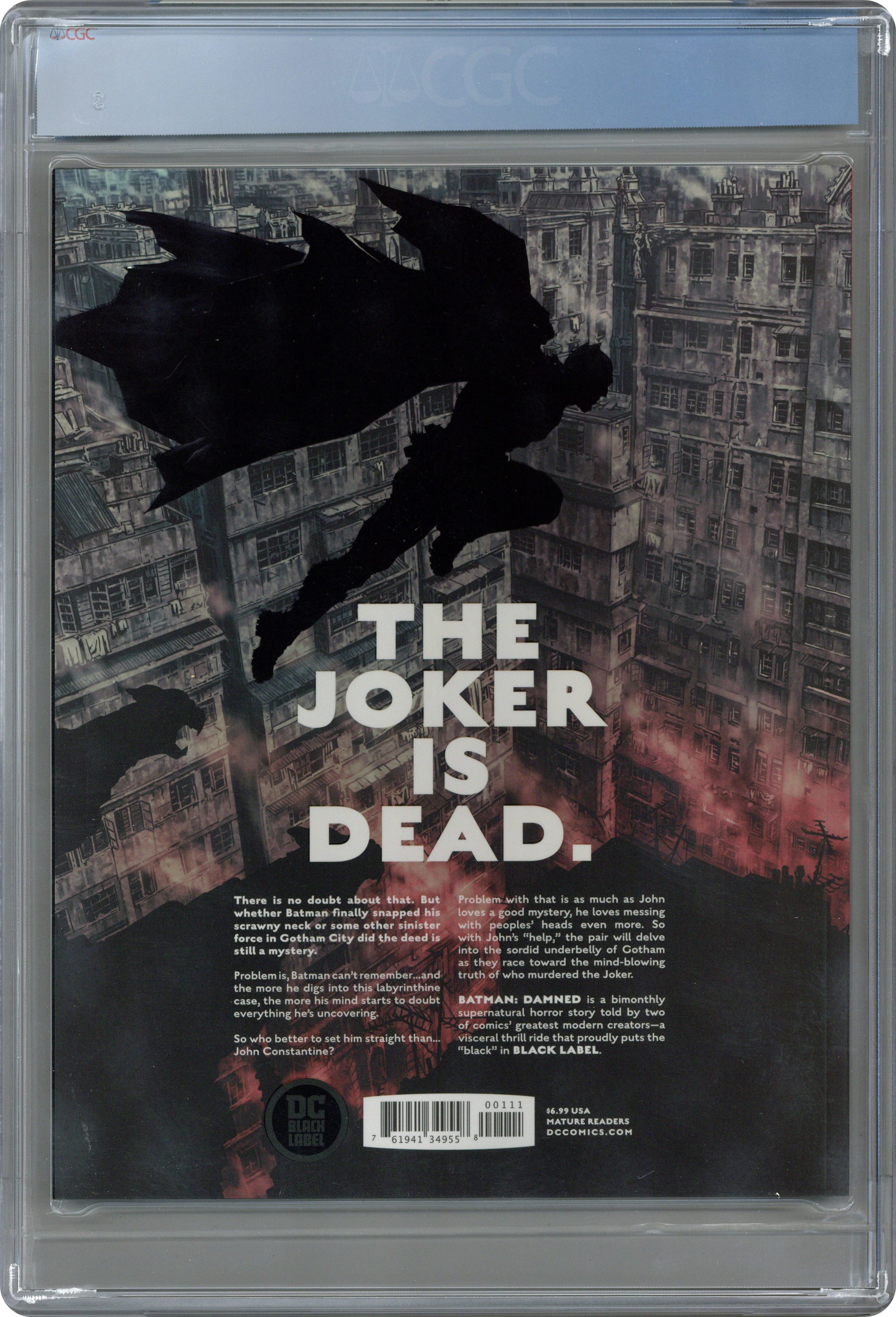 Written by Brian Azzarello. Art and Cover by Lee Bermejo. DC BLACK LABEL, the highly anticipated new imprint from DC Comics, starts here! The Joker is dead. There is no doubt about that. But whether Batman finally snapped his scrawny neck or some other sinister force in Gotham City did the deed is still a mystery. Problem is, Batman can't remember… and the more he digs into this labyrinthine case, the more his mind starts to doubt everything he's uncovering. So who better to set him straight than… John Constantine? Problem with that is as much as John loves a good mystery, he loves messing with people's heads even more. So with John's 'help,' the pair will delve into the sordid underbelly of Gotham as they race toward the mind-blowing truth of who murdered The Joker. BATMAN: DAMNED is a bimonthly super-natural horror story told by two of comics' greatest modern creators-a visceral thrill-ride that proudly puts the 'black' in BLACK LABEL. 48 pages, full color. Mature Readers Cover price $6.99. Grade: CGC 10.0 explanation of grade Condition: Used (collectible)