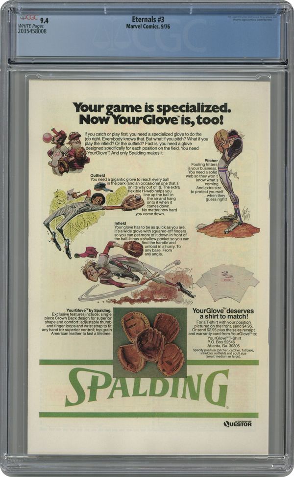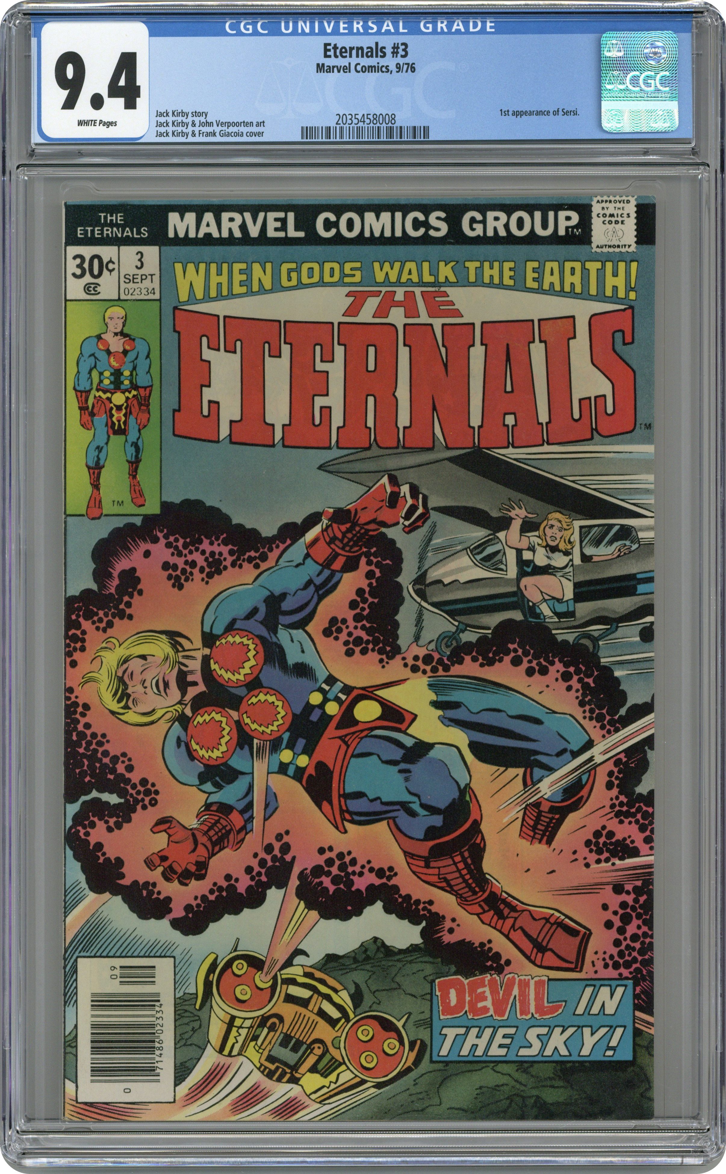 Ended May 5 2020 Winning Bid $110 "The Devil in New York!" Written by Jack Kirby. Pencils by Jack Kirby. Inks by John Verpoorten. The hidden chapters in the history of man are quickly being revealed. The Celestials have returned! Untouched for thousand years, a large crypt in an Incan ruin has discharged a living flight crew. As Margo's head spins from all the fantastic sights she has seen, sights no mortal before has seen, Ikaris introduces her to the fabulous Eternal beauty known as Sersi. Meanwhile, if the gods haves returned, can the monsters be far behind. The beastly Deviants, the sworn enemy of the Eternals and mankind, prepare to attack! Notes: 1st appearance of Sersi. Letter to the editor from comics writer Ralph Macchio. Cover price $0.30. Grade: CGC 9.4 explanation of grade Condition: Used (collectible)