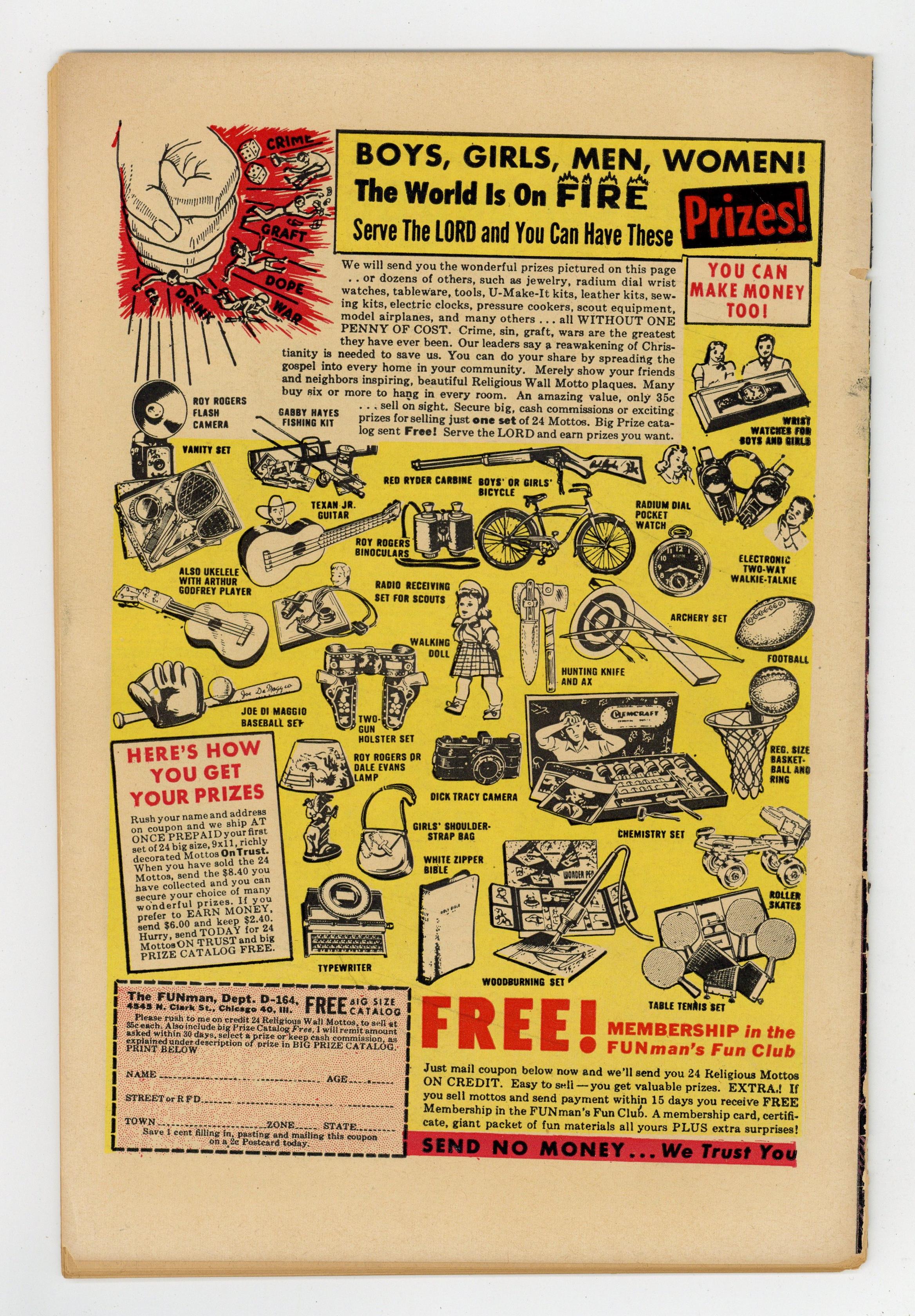 Ended May 14 2020 Winning Bid $407 Cover by Howard Nostrand. Stories and art by Bob Powell, Nat Barnett, Howard Nostrand, and Manny Stallman. A showcase for Harvey's distinctive brand of pre-Code horror. A killer on the run murders two men to get a ticket on an ocean liner out of England - but it's the Titanic. A MAD-style spoof of the classic Ali Baba and the Forty Thieves. A businessman seeks to corner the market on stakes and silver bullets during a vampire scare. The Ticket; What's in a Name?; Ali Barber and the Forty Thieves; Whats Happening at 8:30 P.M.?; Mother Mongoose's Nursery Crimes; Love Problem; Monopoly. 36 pages, Full Color. Cover price $0.10. Grade: PR 0.5 explanation of grade Condition: Used (collectible)