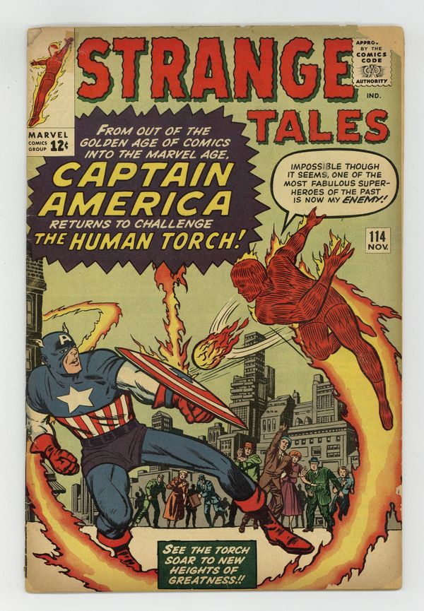 Ended Jul 22 2019 Winning Bid $45 Cover pencils by Jack Kirby, inks by Dick Ayers. "The Human Torch Meets... Captain America", script by Stan Lee (co-plot, dialogue) and Jack Kirby (co-plot, uncredited), pencils by Jack Kirby, inks by Dick Ayers; The Human Torch is upstaged by the return of Captain America, but the Torch realizes that it is his old enemy the Acrobat in disguise and defeats him; This is the first appearance of Captain America since the Golden Age (though it's actually the Acrobat from issue 106 disguised as the hero). "The Bridge" text story. Third appearance of Dr. Strange in "The Return of the Omnipotent Baron Mordo!", script by Stan Lee and Steve Ditko (co-plot), pencils by Steve Ditko, inks by George Roussos; Strange is lured into a trap in England by Baron Mordo, but defeats him with the help of a woman with latent magical talents; First appearance of Victoria Bentley. 36 pgs., full color. Cover price $0.12. Grade: GD- 1.8 explanation of grade Condition: Used (collectible)
