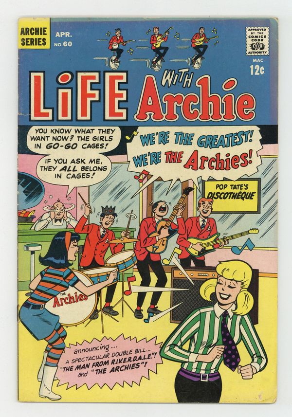 Cover pencils by Bob White, inks by Jon D'Agostino. Double Agent featuring A.R.C.H.I.E. as The Man From R.I.V.E.R.D.A.L.E., script by Frank Doyle, pencils by Bob White, inks by Jon D'Agostino; The C.R.U.S.H. genius Mentor the Magnificent creates a robotic double of A.R.C.H.I.E., who arranges to switch places with the robot and infiltrate C.R.U.S.H. headquarters. The Safe Way featuring Li'l Jinx, script and art by Joe Edwards. Once Upon a Tune, script by Frank Doyle, pencils by Bob White, inks by Jon D'Agostino; Meet those madcap musical mirth-makers, The Archies, a three-man band of boys who bring song and silliness wherever they go; After playing a gig at Pop Tate's discotheque, they try to save Riverdale High School from being set ablaze; First appearance of The Archies (consisting of Archie, Jughead and Reggie), a surrealistic comedy series inspired by the success of the Monkees. 36 pgs. $0.12. Cover price $0.12. Grade: VG 4.0 explanation of grade Condition: Used (collectible)