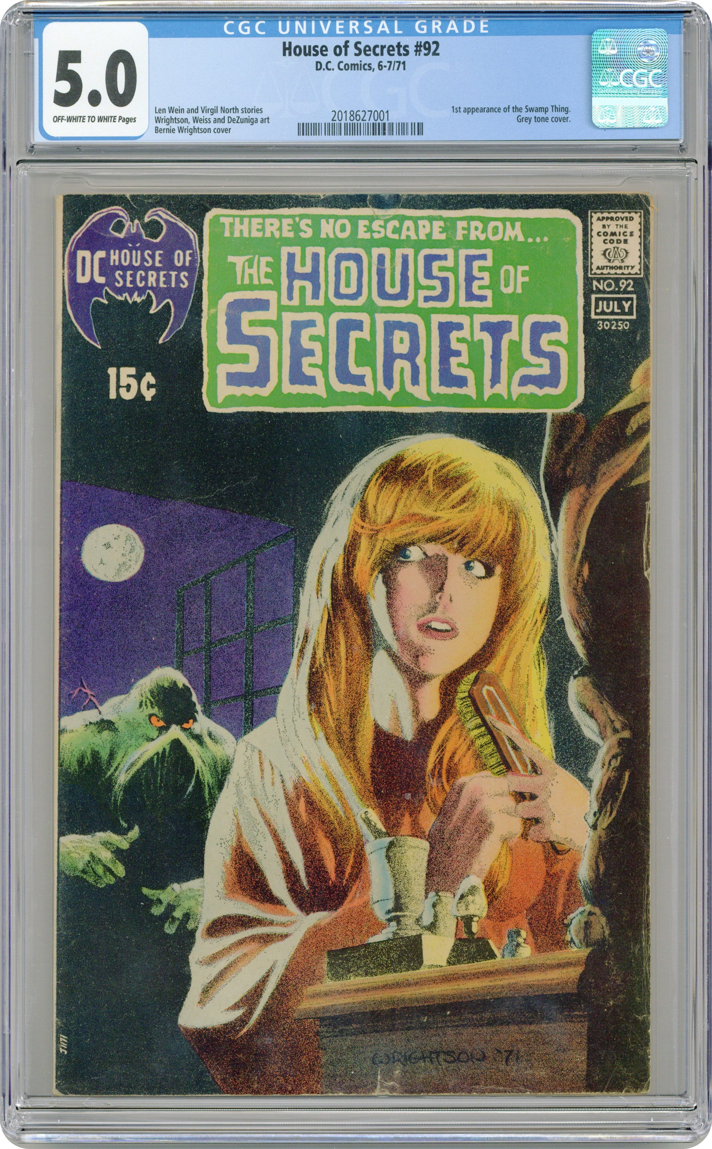 Ended May 5 2020 Winning Bid $735 Cover art by Bernie Wrightson. "Swamp Thing," script by Len Wein, art by Berni Wrightson; Sometime in the last century, Alex Olsen and Damien Ridge had been best friends; However, they both vied for the affections of a woman named Linda. Linda eventually married Alex and Damien had to endure his heartache in the form of the supportive friend; But his desire for Linda overrode the bonds of friendship and he conspired to eliminate Alex; He sabotaged the equipment in Alex's lab causing an explosion that killed him; Keeping the knowledge hidden from Linda, Damien buried Alex's body in the swamp; Damien eventually married the widow Olsen and they lived together in an old Victorian plantation house; But Linda never recovered from Alex's death; As months passed, Damien began to suspect that Linda might soon learn the truth, so he prepared to kill her; But Alex had been resurrected as a swamp thing and broke into the house and killed Damien. "After I Die!", script by Jack Kirby and Mark Evanier, art by Bill Draut; A wealthy man named Maxwell James is obsessed with what happens after death; his obsession only grows stronger when he arrives at his wife's deathbed, and realizes that she sees something utterly horrifying in her final moments. "It's Better to Give," script by Mary Skrenes (as "Virgil North"), pencils by Alan Weiss, inks by Tony DeZuniga; A homeless man encounters a crying baby warlock in the town dump who is upset that he has broken his balloon. "Trick or Treat" two-page story, art by Dick Dillin. 36 Pages, Full Color. Cover price $0.15. Grade: CGC 5.0 explanation of grade Condition: Used (collectible)