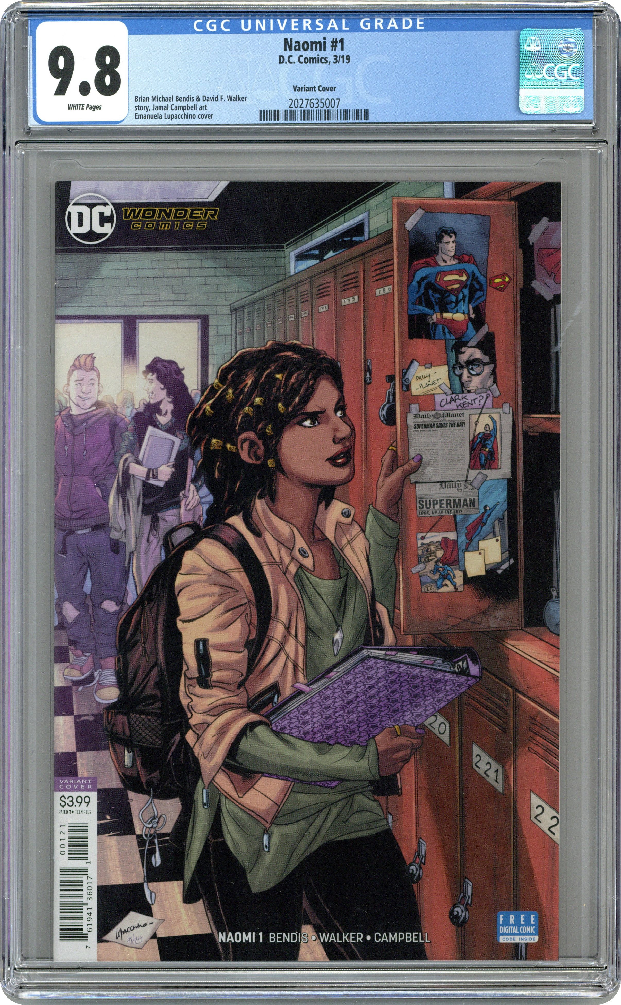 Ended Oct 15 2019 Winning Bid $65 Written by David F. Walker and Brian Michael Bendis. Art by Jamal Campbell. Cover by Emanuela Lupacchino. DC's biggest, newest mystery starts here! When a fight between Superman and Mongul crashes into a small Northwestern town, Naomi (last name?) begins a quest to uncover the last time a super-powered person visited her home-and how that might tie into her own origins and adoption. Follow Naomi's journey on a quest that will take her to the heart of the DC Universe and unfold a universe of ideas and stories that have never been seen before. Join writers Brian Michael Bendis, David Walker and breakout artist Jamal Campbell in Wonder Comics' massively ambitious new series and star... NAOMI. 32 pages, full color. Rated T+ Cover price $3.99. Grade: CGC 9.8 explanation of grade Condition: Used (collectible)